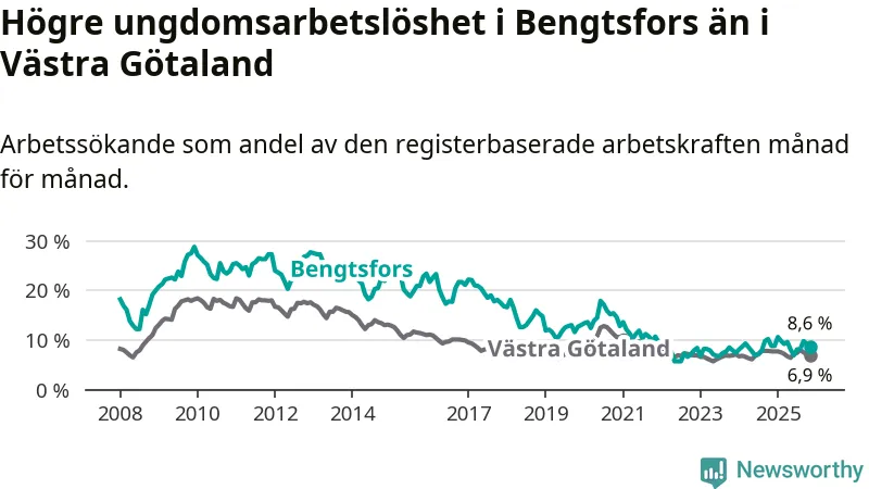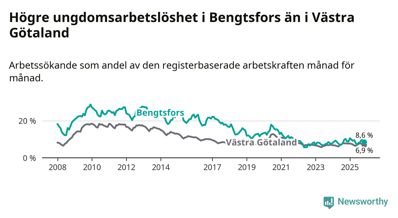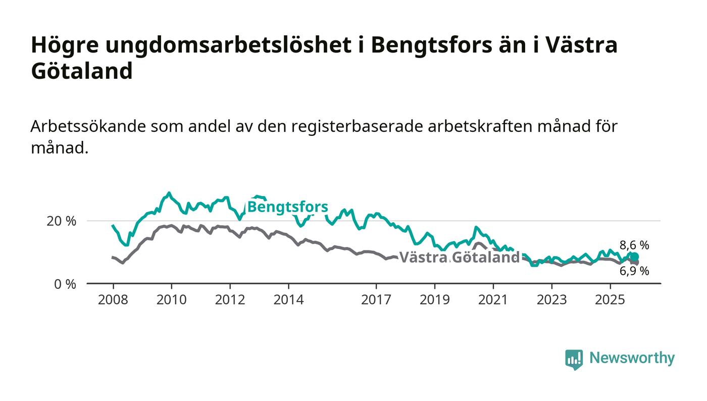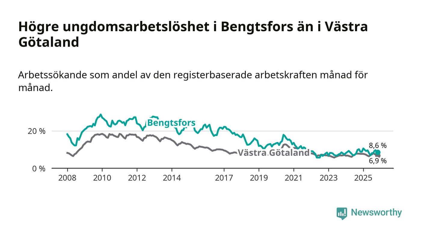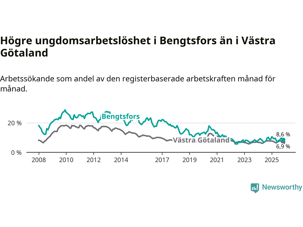 Precis som den totala arbetslösheten ligger ungdomsarbetslösheten i Bengtsfors högre än i Västra Götaland som helhet. Skillnaden mellan kommunen och länet är 1,7 procentenheter.
