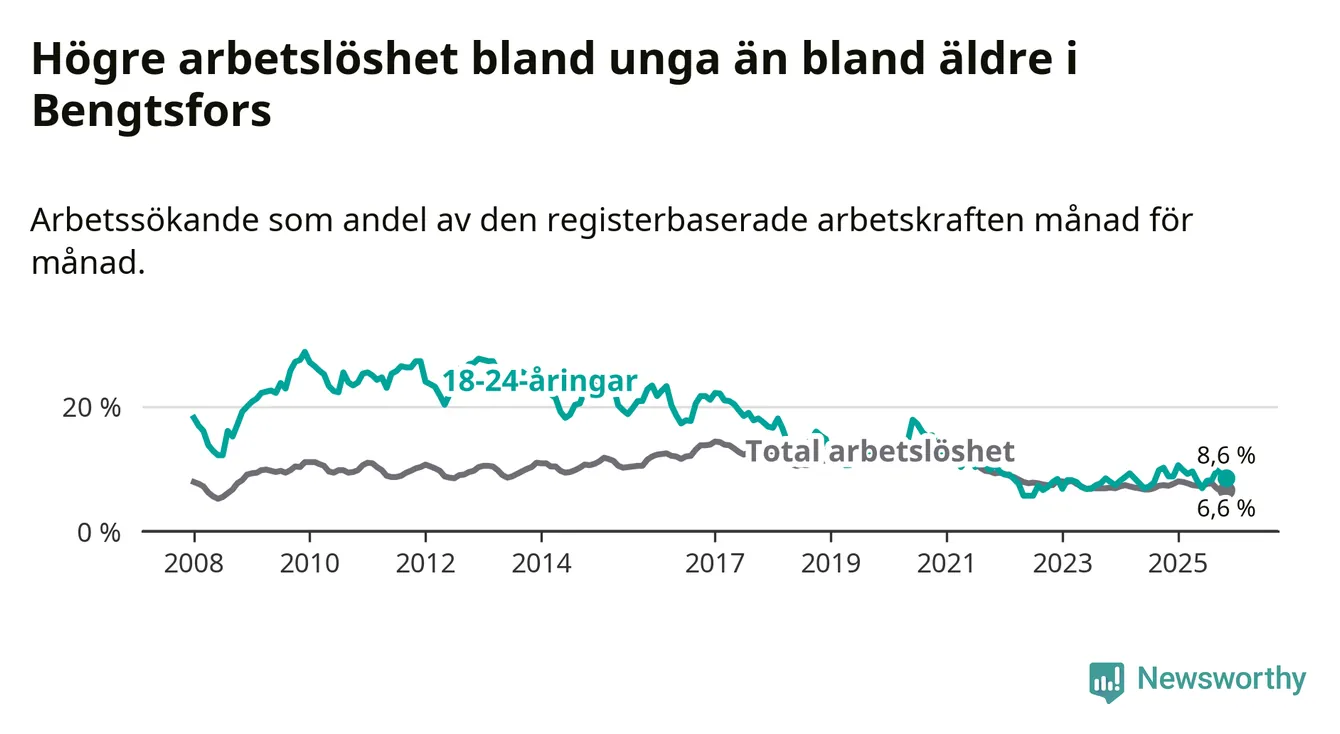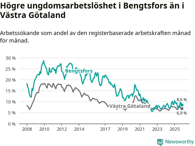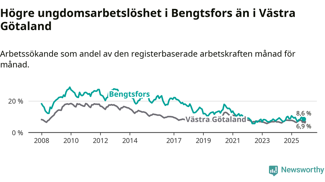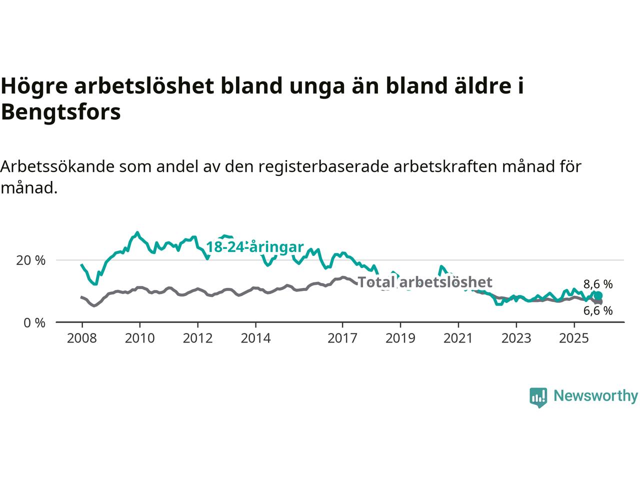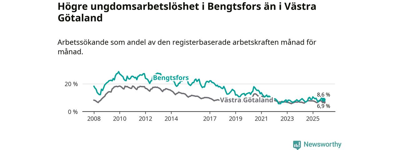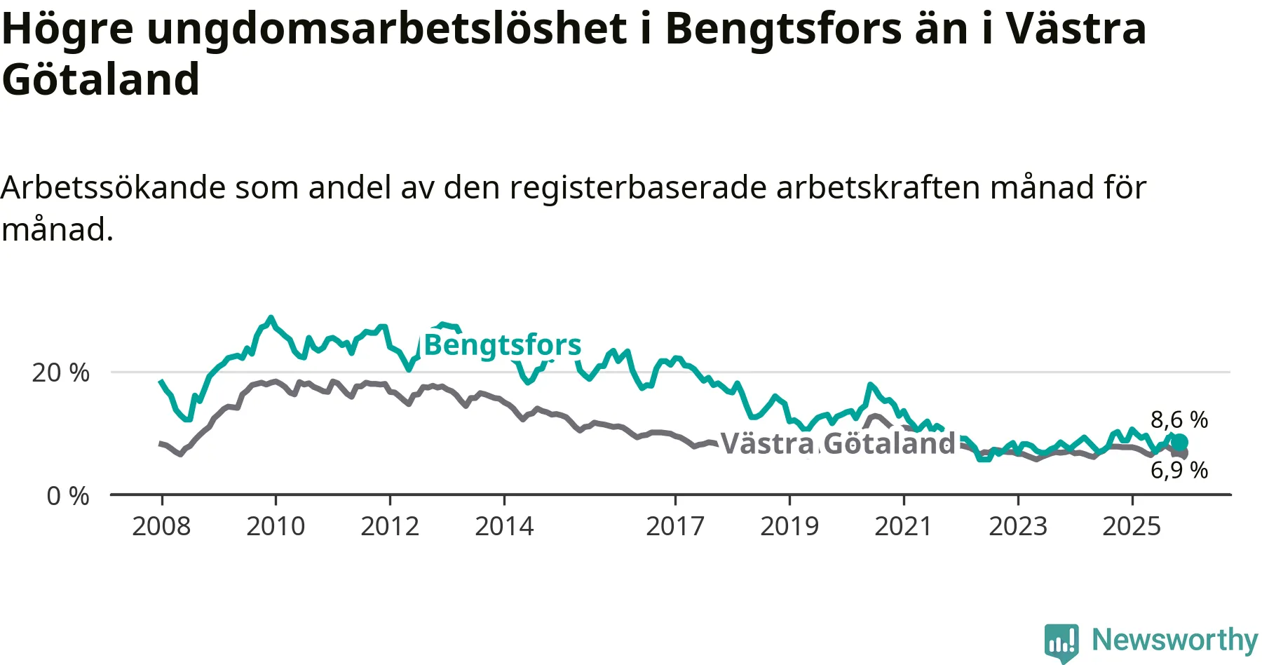 Precis som den totala arbetslösheten ligger ungdomsarbetslösheten i Bengtsfors högre än i Västra Götaland som helhet. Skillnaden mellan kommunen och länet är 1,7 procentenheter.