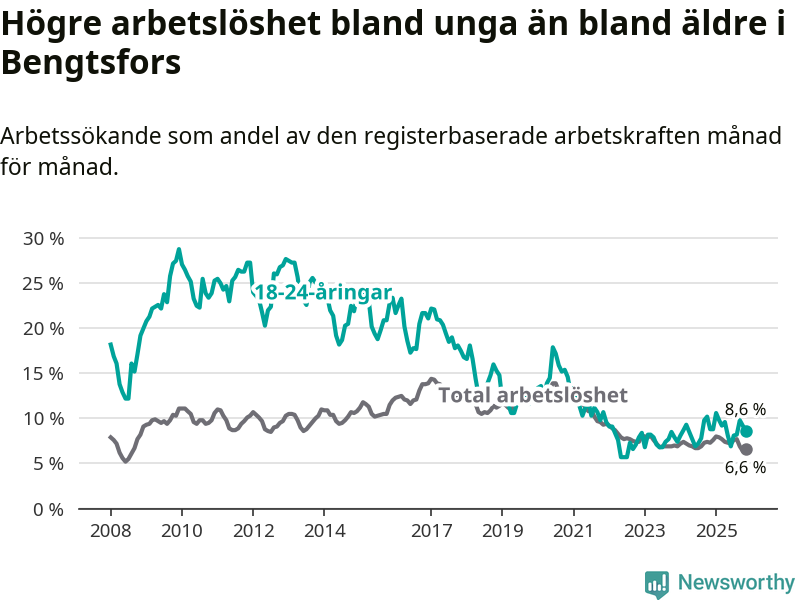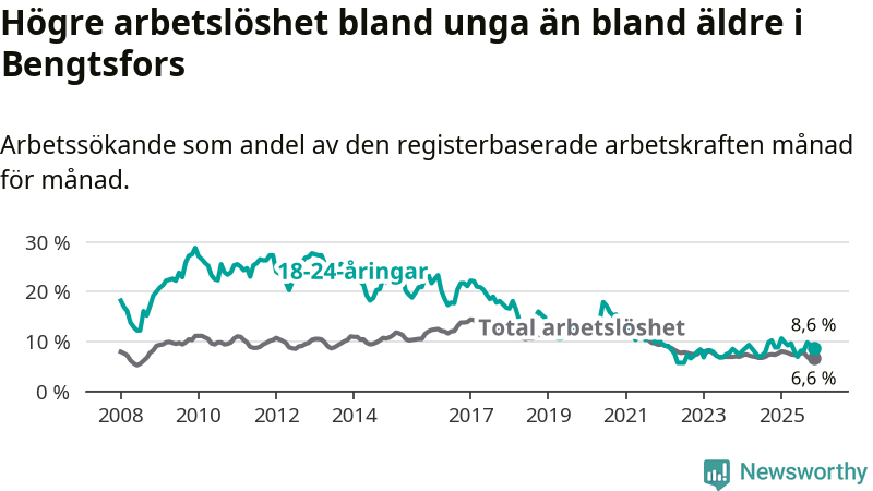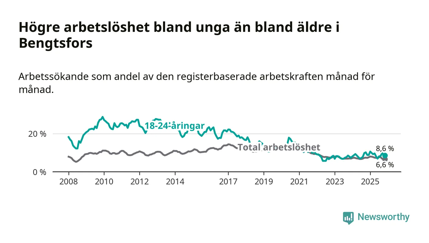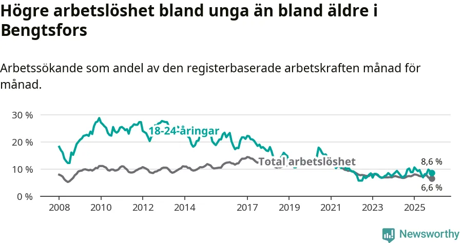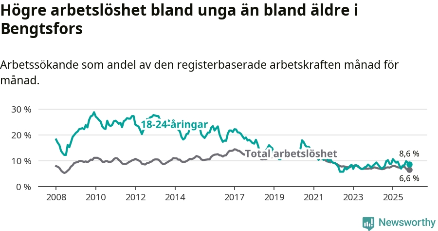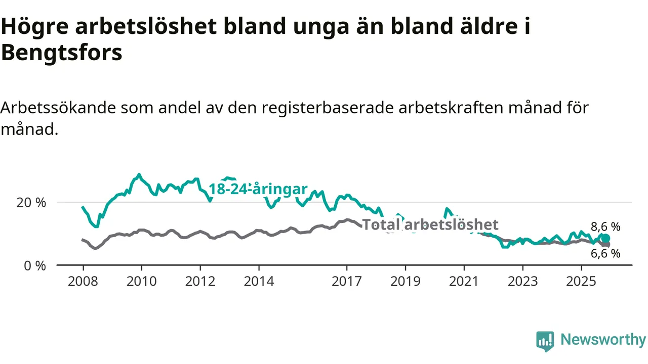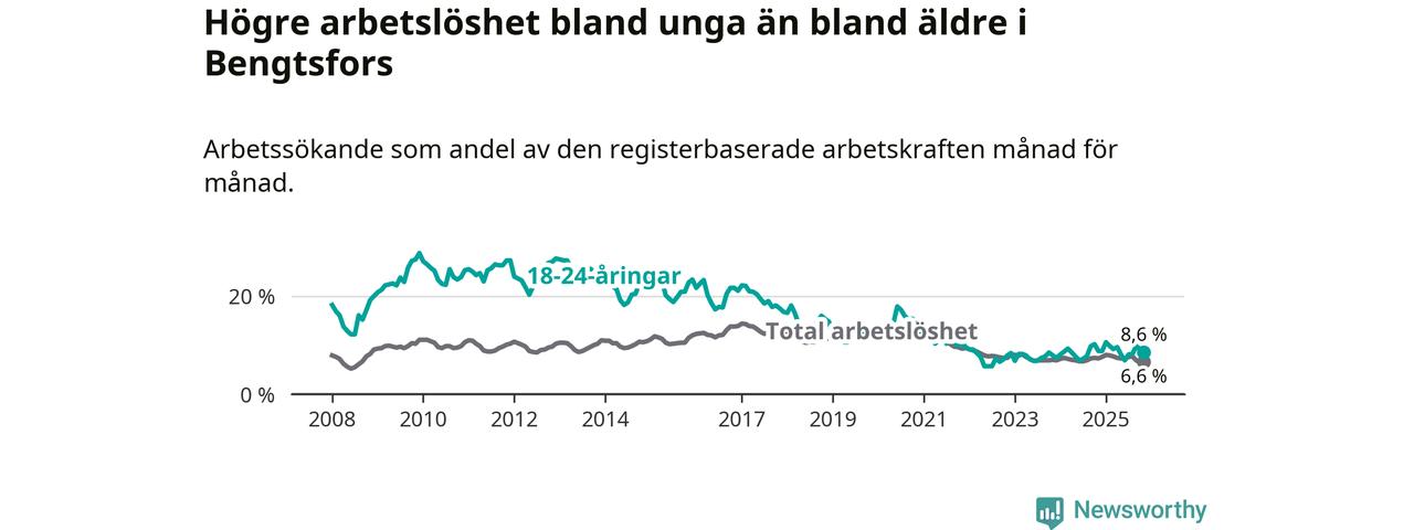 Precis som den totala arbetslösheten ligger ungdomsarbetslösheten i Bengtsfors högre än i Västra Götaland som helhet. Skillnaden mellan kommunen och länet är 1,7 procentenheter.