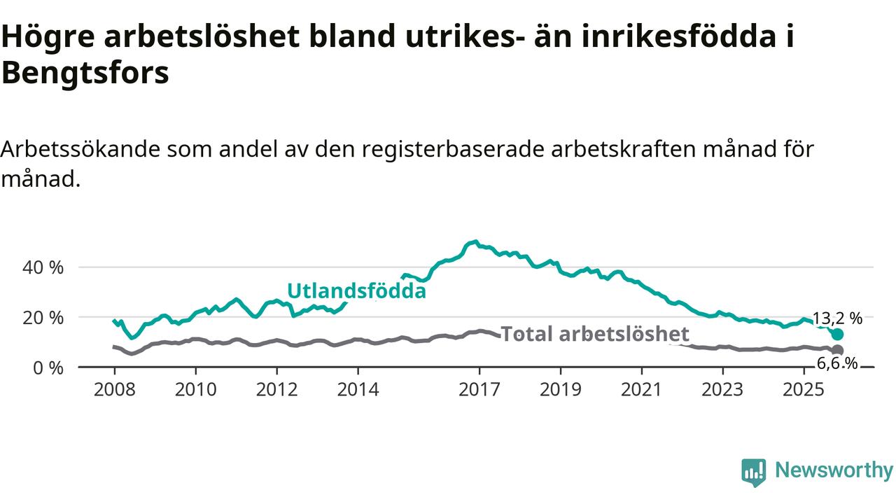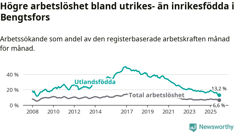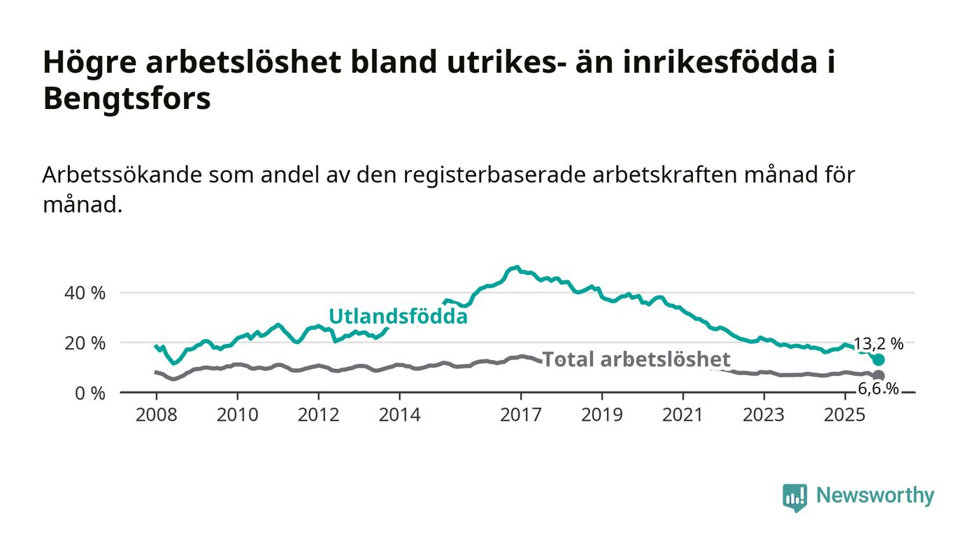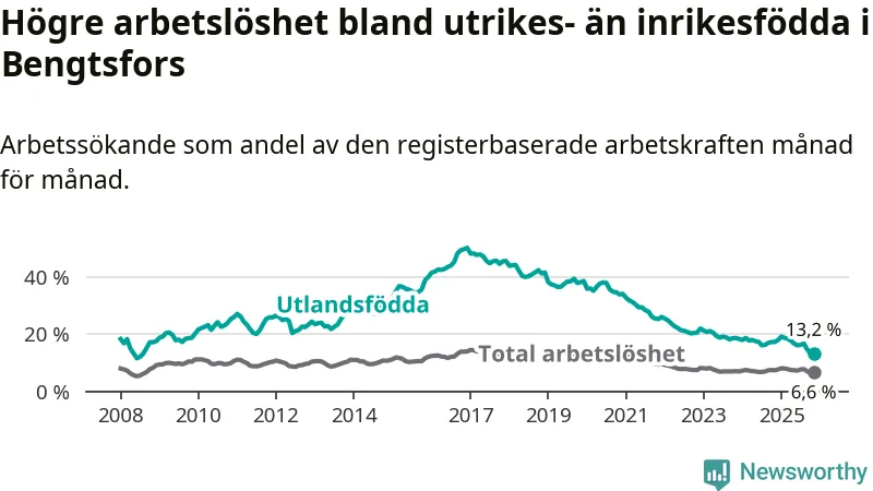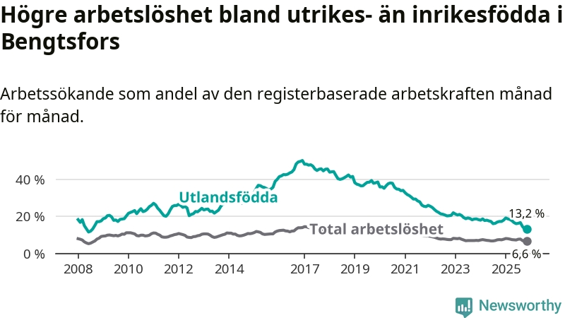 Arbetslösheten bland utlandsfödda var 13,2 procent i Bengtsfors under november månad, motsvarande 104 av 788 personer. Det är 4,0 procentenheter färre än vid samma tidpunkt i fjol (−32 om man räknar personer).