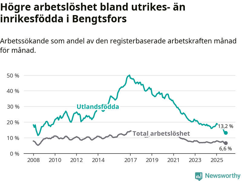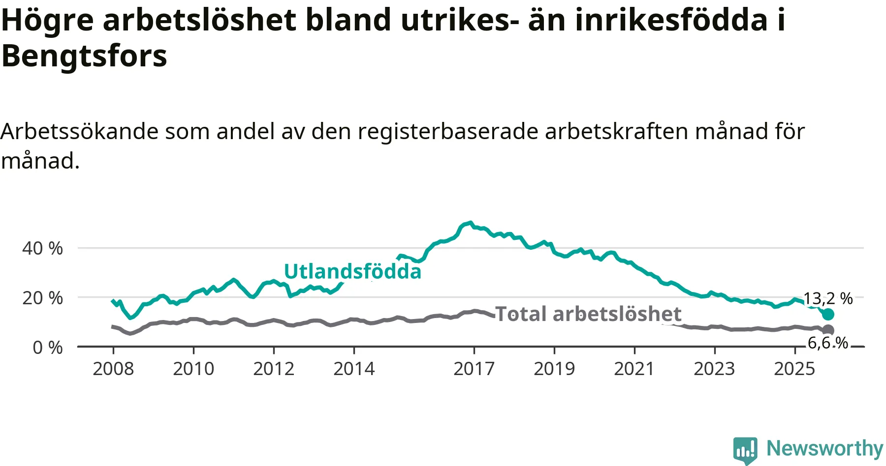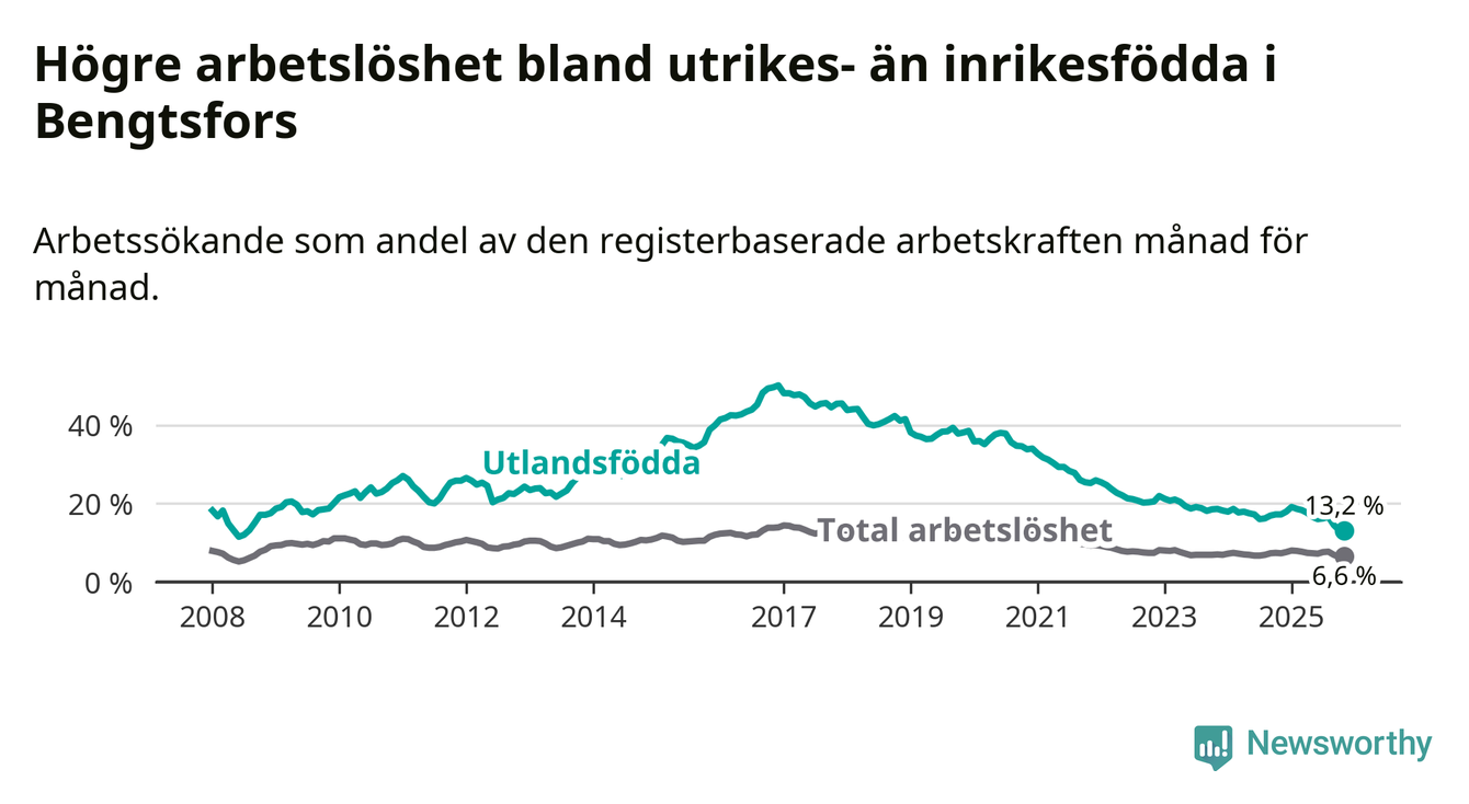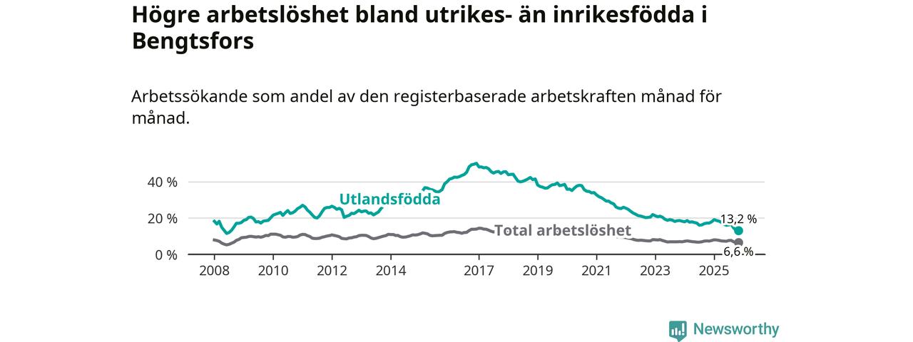 Arbetslösheten bland utlandsfödda var 13,2 procent i Bengtsfors under november månad, motsvarande 104 av 788 personer. Det är 4,0 procentenheter färre än vid samma tidpunkt i fjol (−32 om man räknar personer).