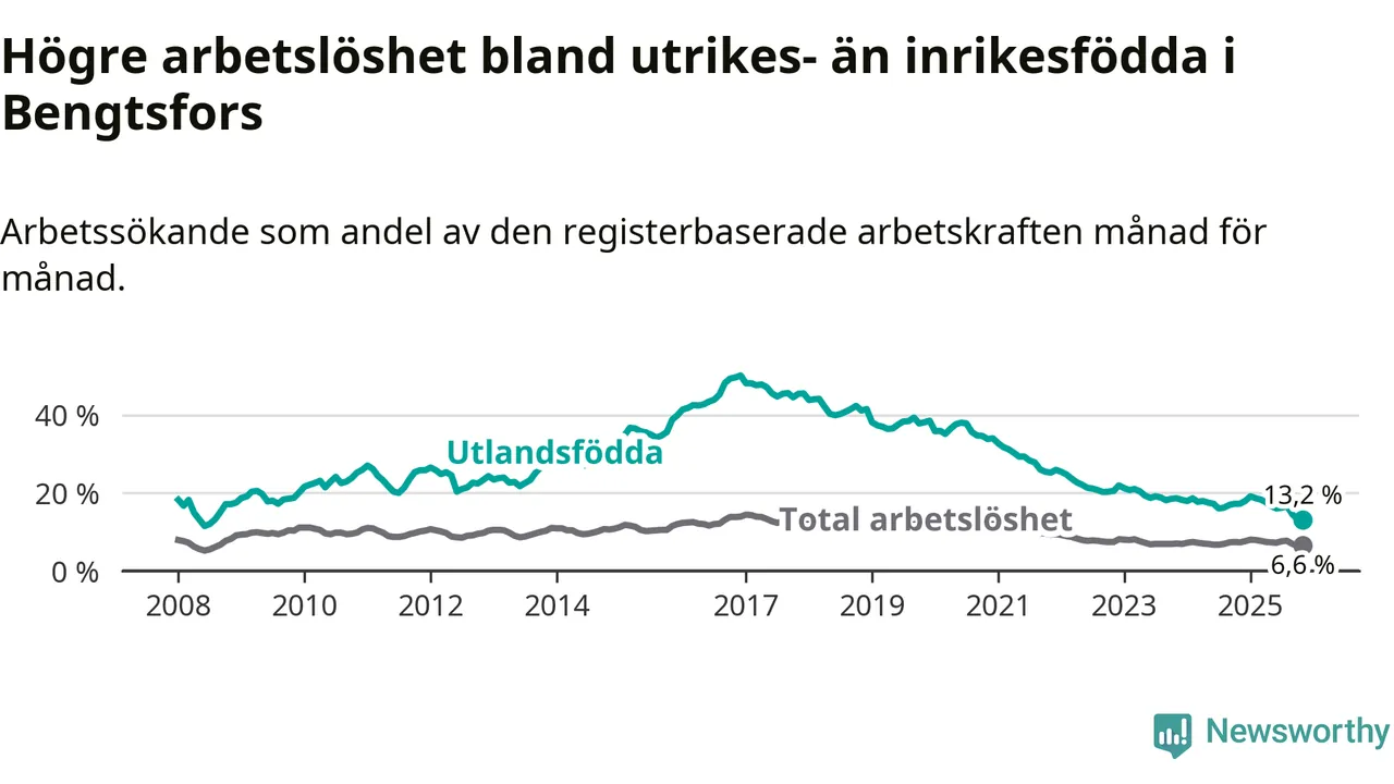 Skillnaden i arbetslöshet mellan utrikesfödda och hela befolkningen är 6,6 procentenheter i Bengtsfors. Det är en betydligt mindre skillnad än för ett år sedan (−3,3 procentenheter).