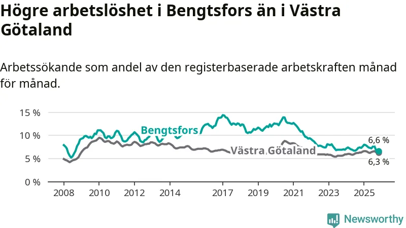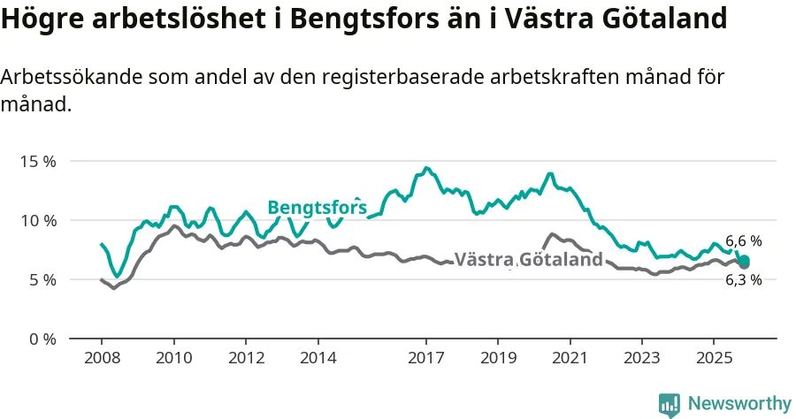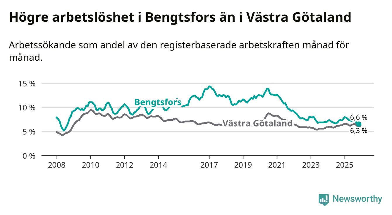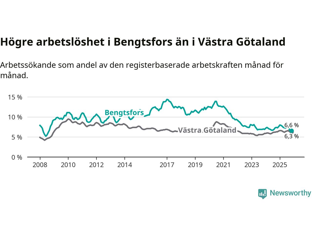 Under november månad rapporterade Bengtsfors kommun en total arbetslöshet på 6,6 procent. Det är en minskning jämfört med samma tidpunkt i fjol (−0,7 procentenheter). I Västra Götalands län däremot står arbetslösheten stilla.
