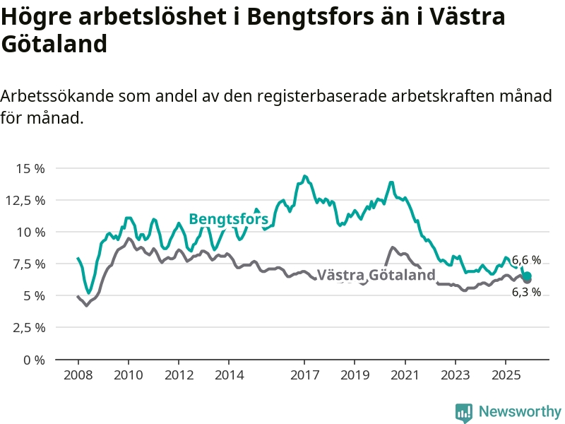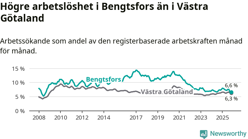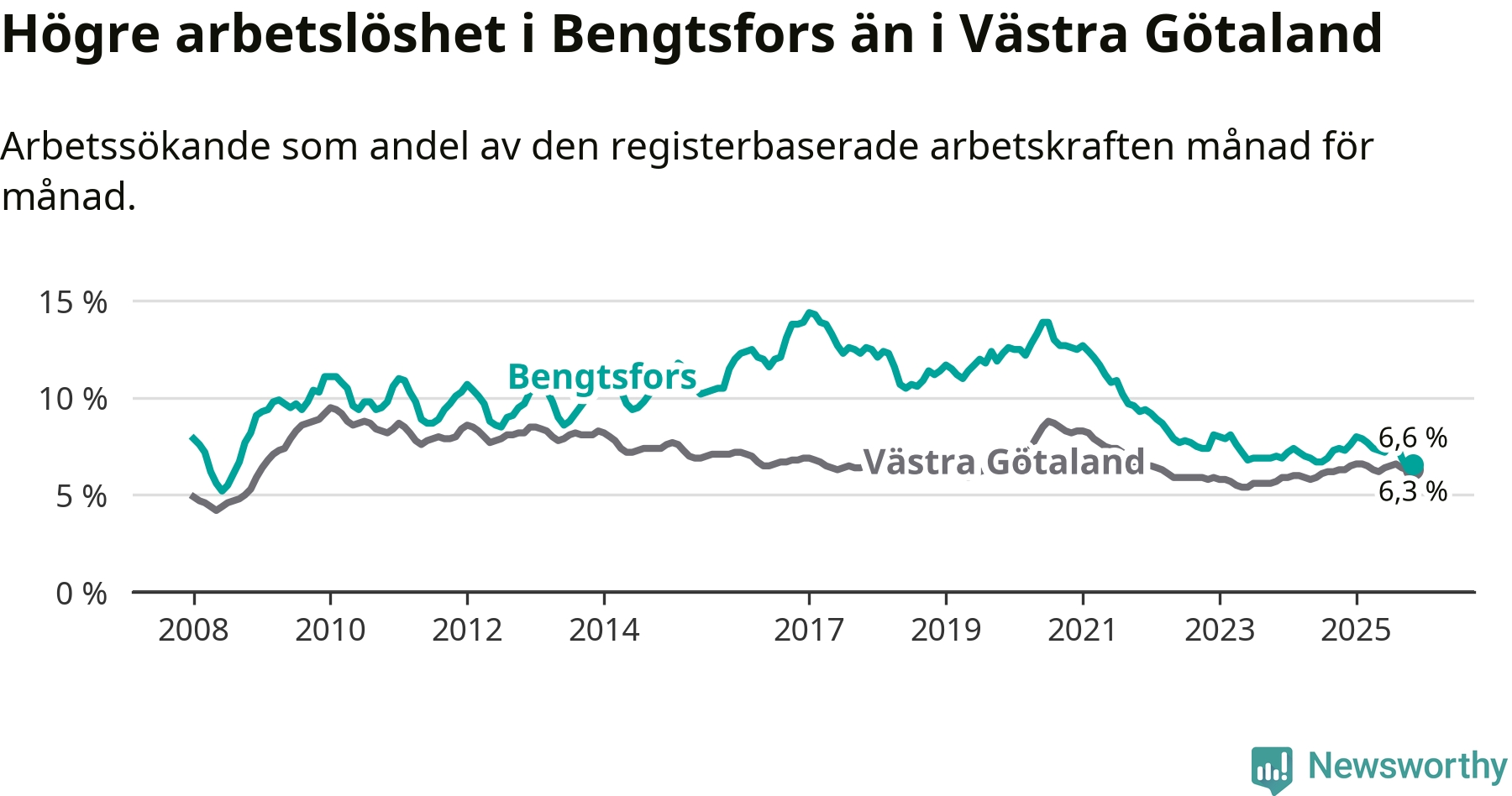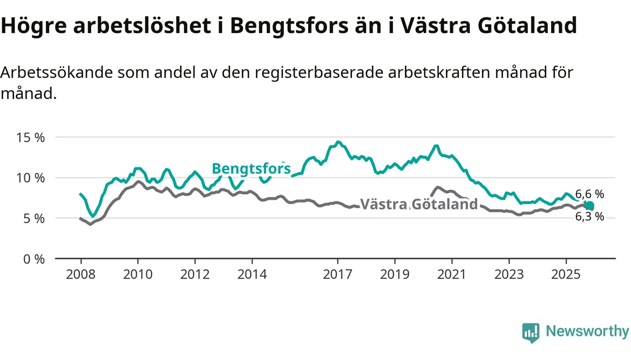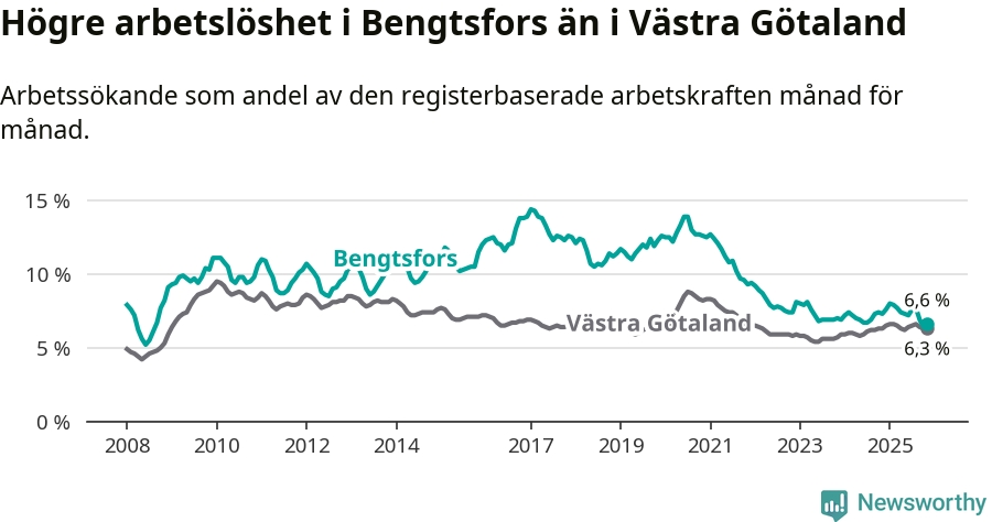 Under november månad rapporterade Bengtsfors kommun en total arbetslöshet på 6,6 procent. Det är en minskning jämfört med samma tidpunkt i fjol (−0,7 procentenheter). I Västra Götalands län däremot står arbetslösheten stilla.