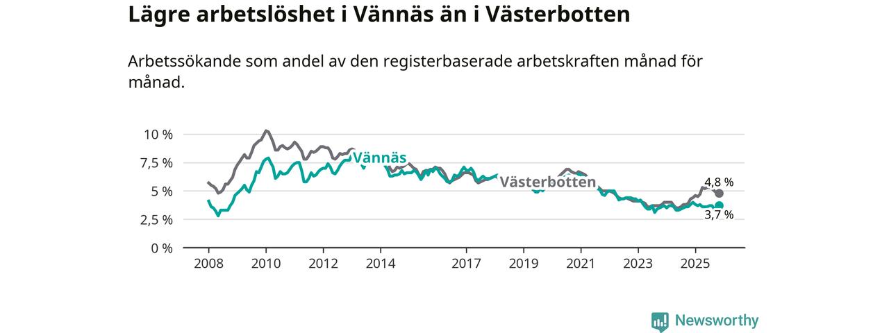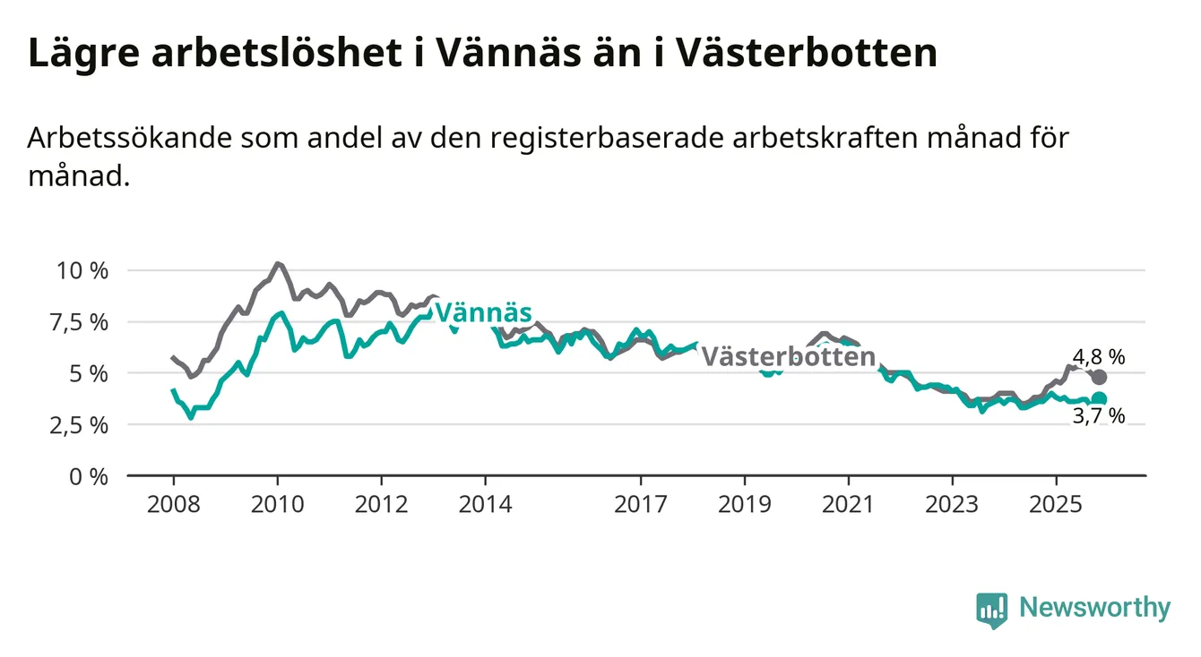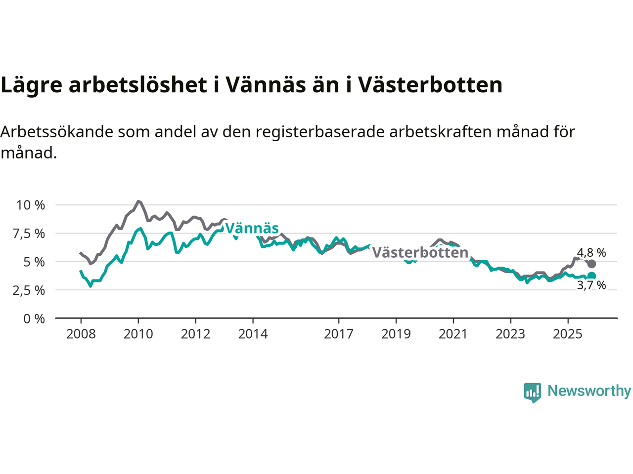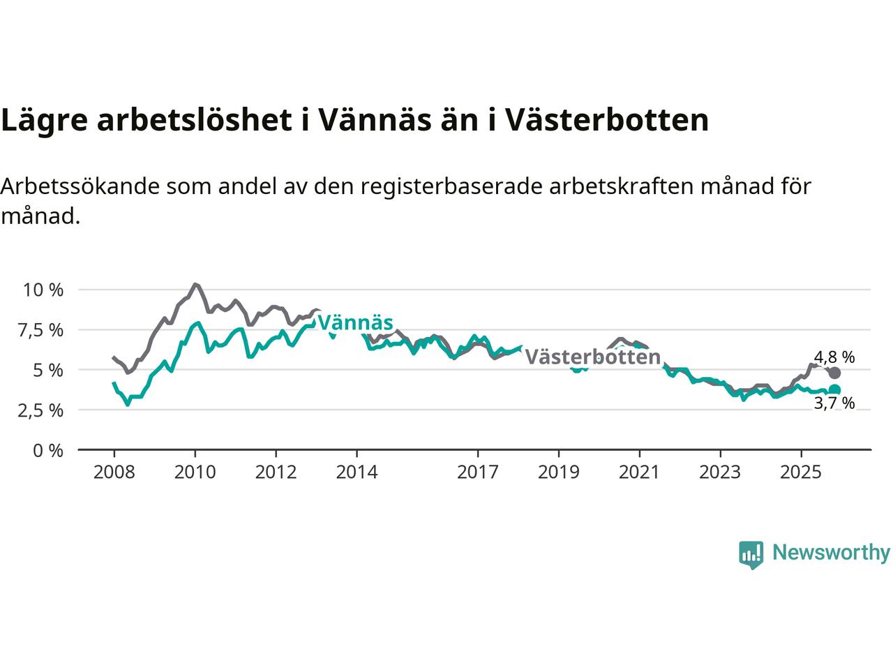 Vännäs hade redan tidigare lägre arbetslöshet än snittet i hela Västerbottens län och nu växer klyftan (3,7 procent i kommunen, jämfört med 4,8 procent i hela länet). Sorsele har den lägsta arbetslösheten i länet (2,4 procent), medan Skellefteå har den högsta (6,3 procent). För att Vännäs skulle komma ner i samma arbetslöshetsnivå som Sorsele skulle 58 personer behöva sysselsättas.
