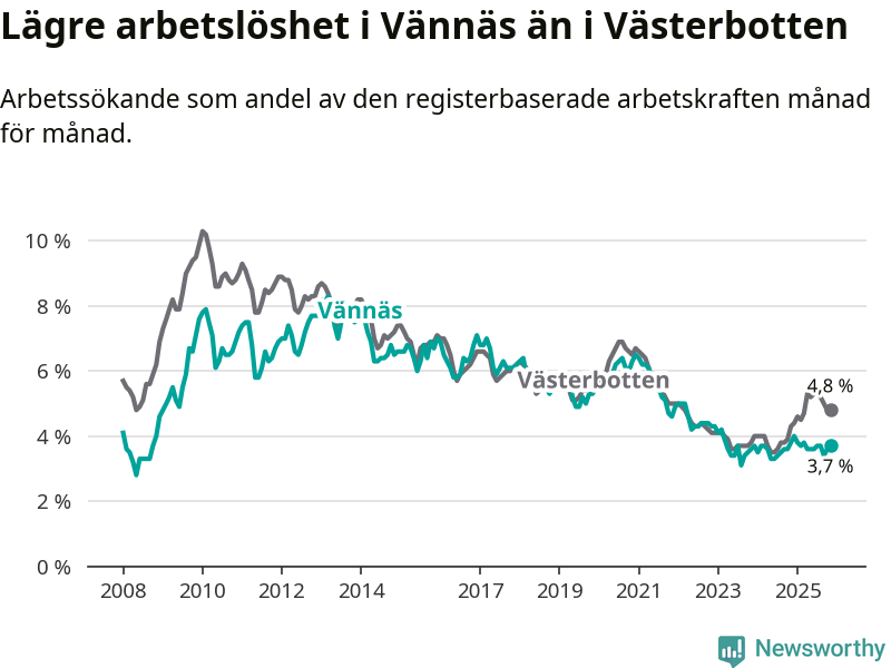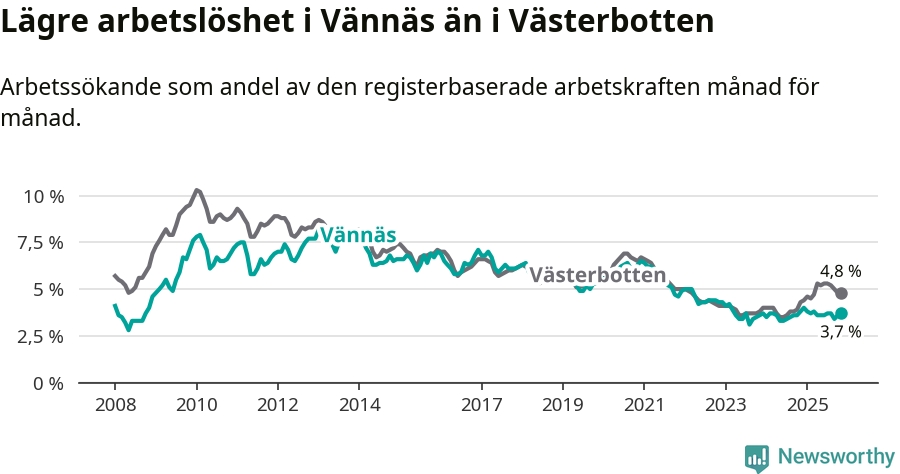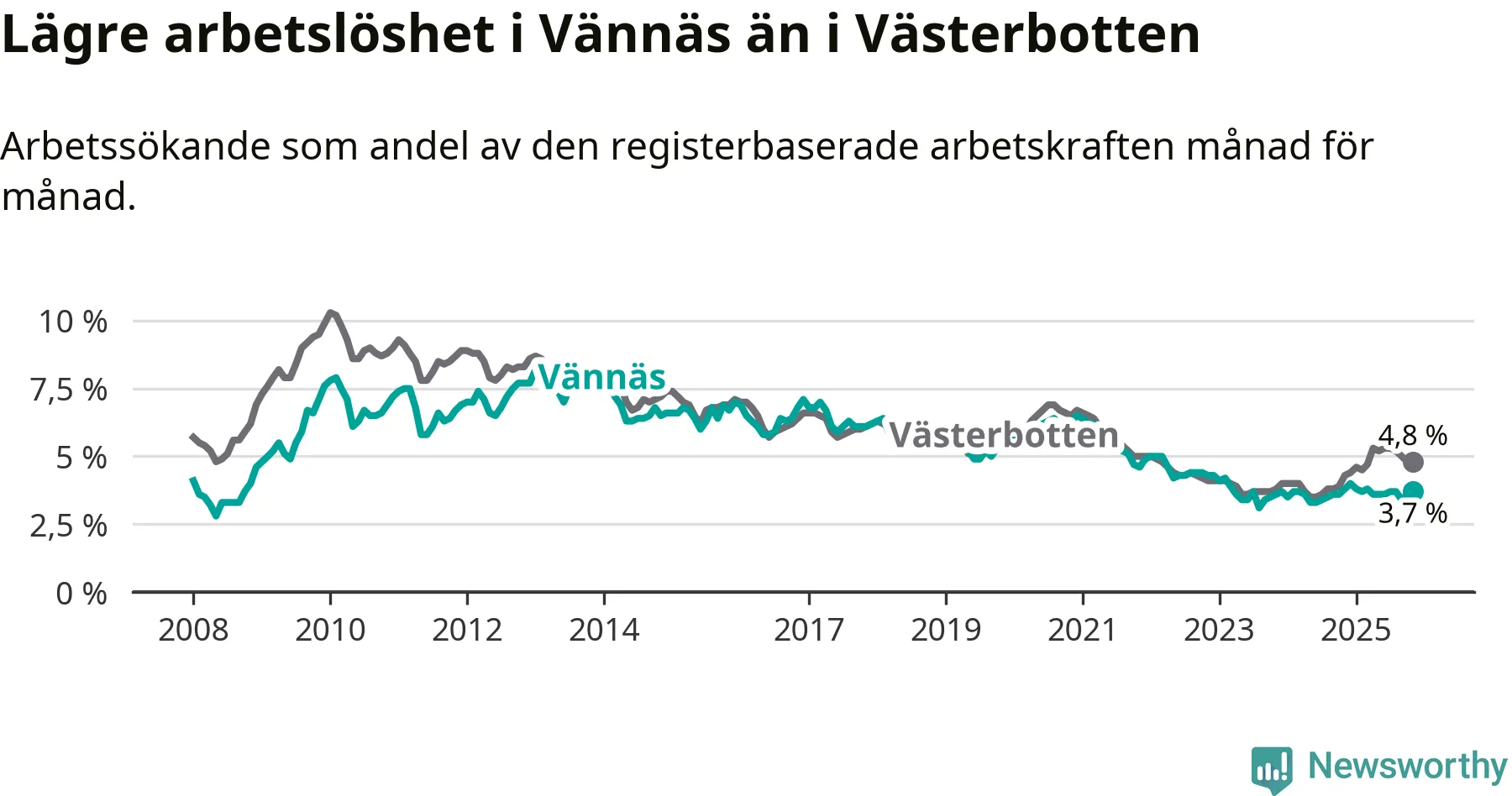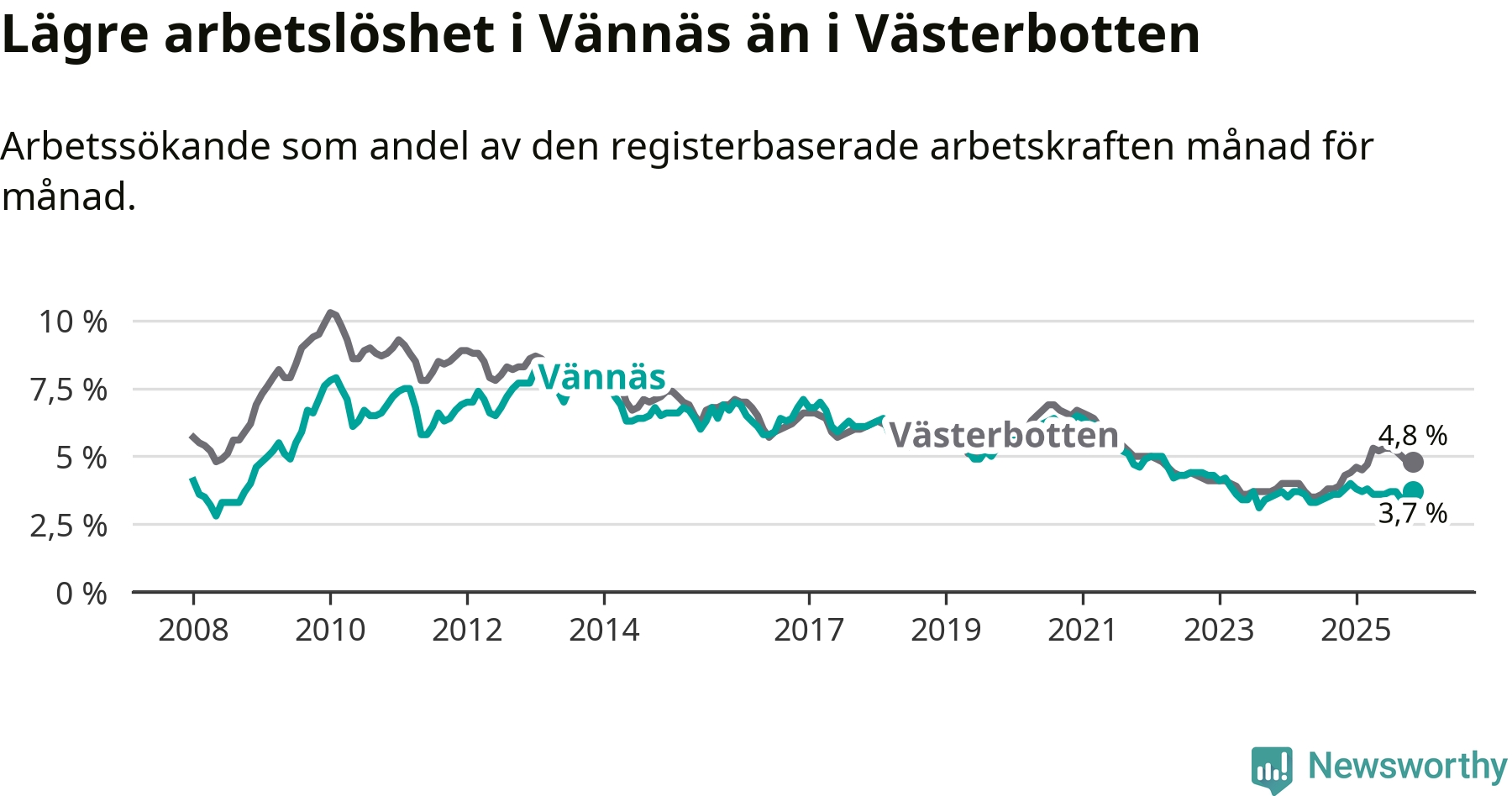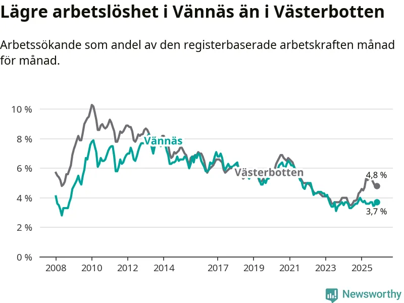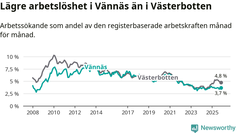 Vännäs hade redan tidigare lägre arbetslöshet än snittet i hela Västerbottens län och nu växer klyftan (3,7 procent i kommunen, jämfört med 4,8 procent i hela länet). Sorsele har den lägsta arbetslösheten i länet (2,4 procent), medan Skellefteå har den högsta (6,3 procent). För att Vännäs skulle komma ner i samma arbetslöshetsnivå som Sorsele skulle 58 personer behöva sysselsättas.