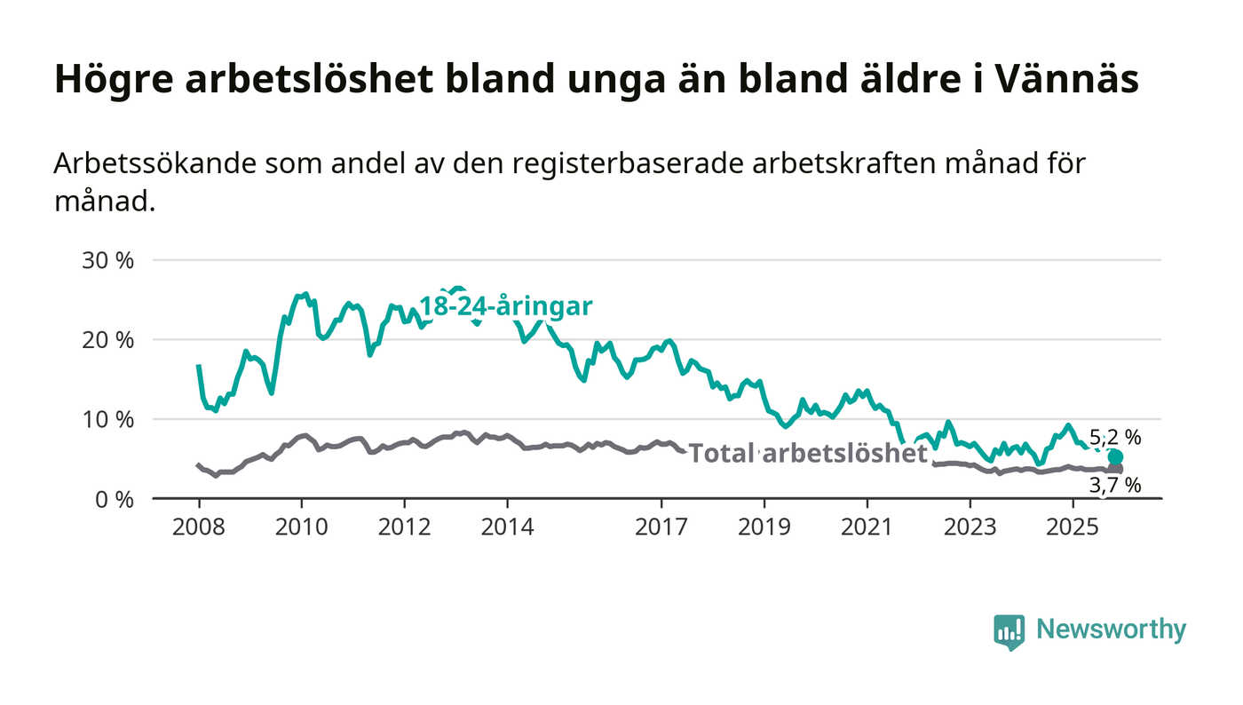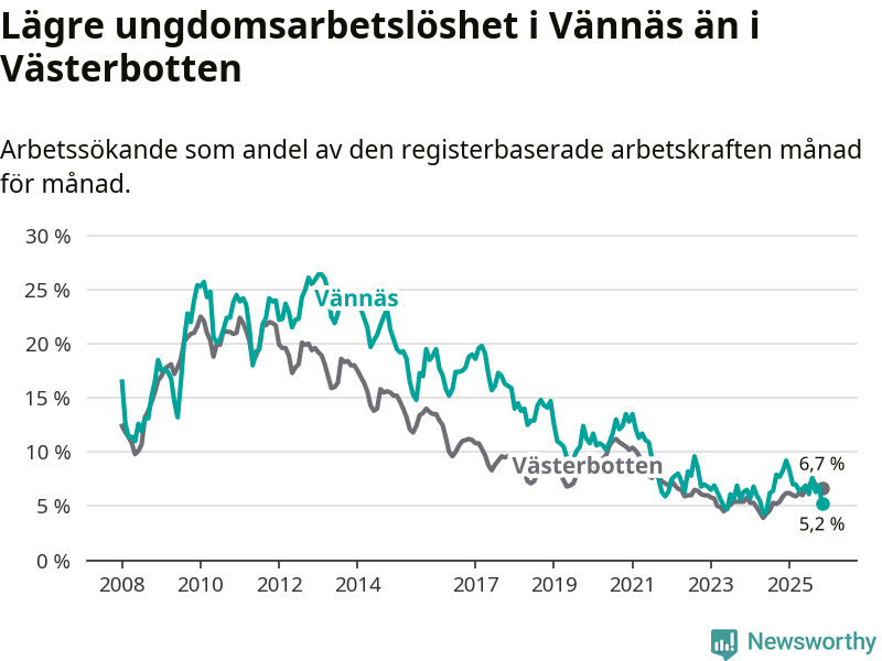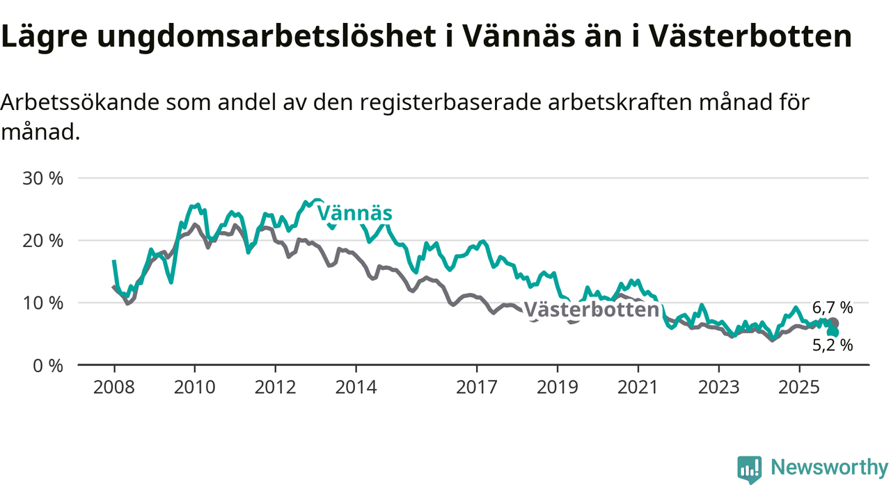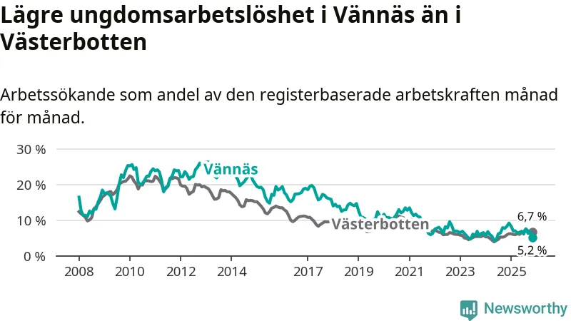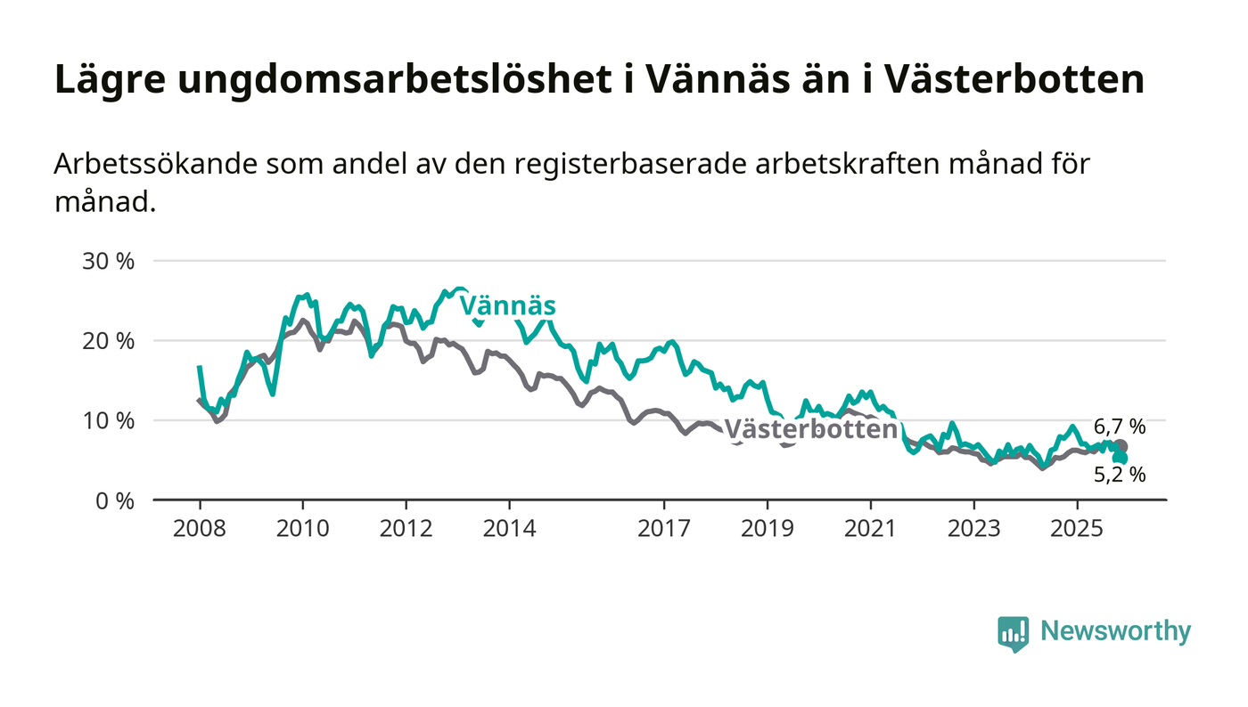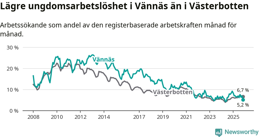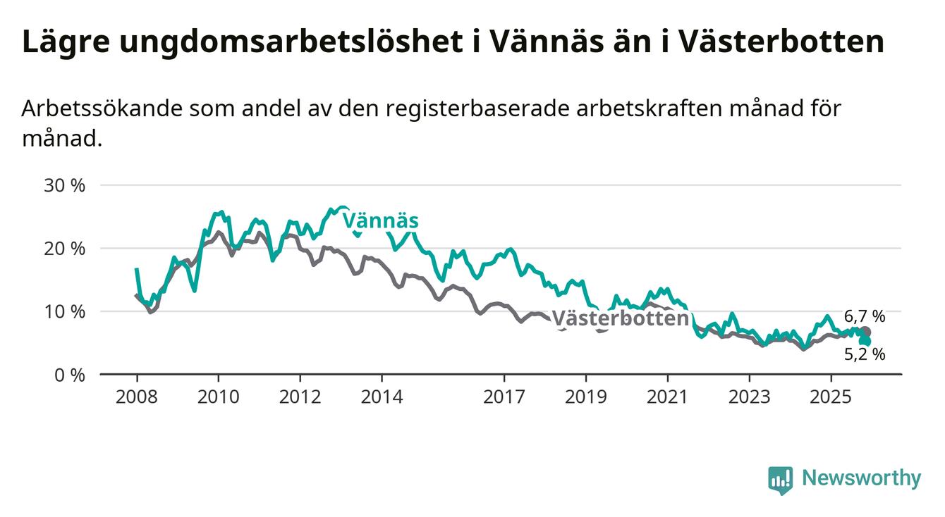 Precis som den totala arbetslösheten ligger ungdomsarbetslösheten i Vännäs lägre än i Västerbotten som helhet. Skillnaden mellan kommunen och länet är 1,5 procentenheter. Medan ungdomsarbetslösheten i Vännäs alltså minskar så ökar den i Västerbotten (+0,8 procentenheter).