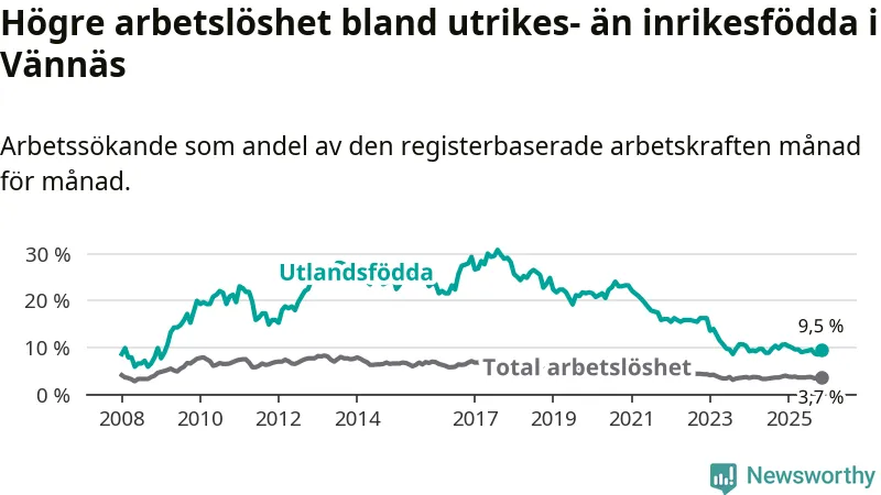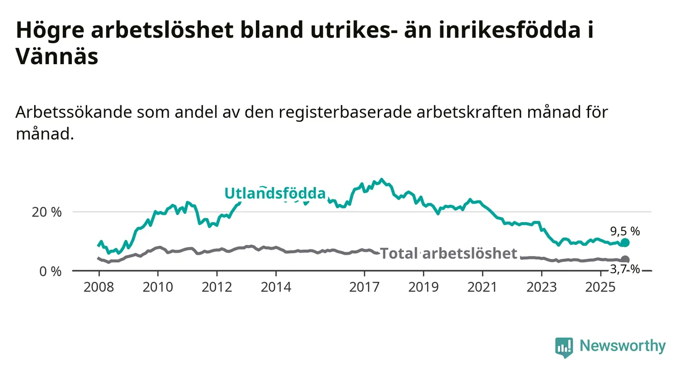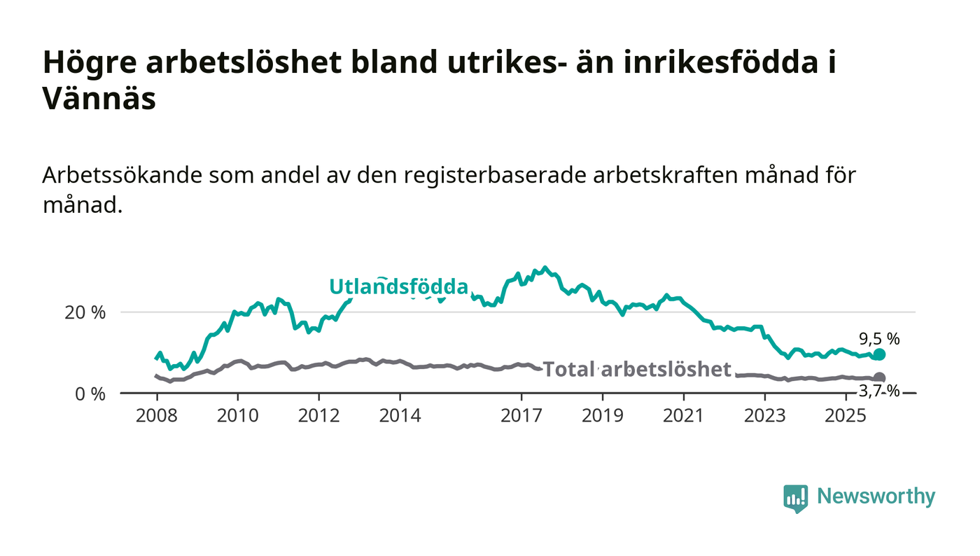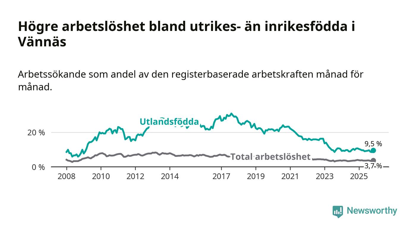 Skillnaden i arbetslöshet mellan utrikesfödda och hela befolkningen är 5,8 procentenheter i Vännäs. Det är en mindre skillnad än för ett år sedan (−1,0 procentenheter).