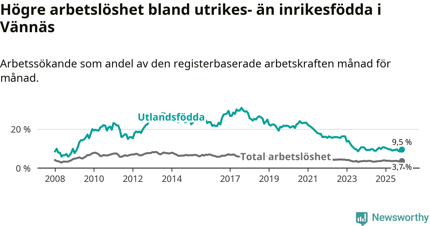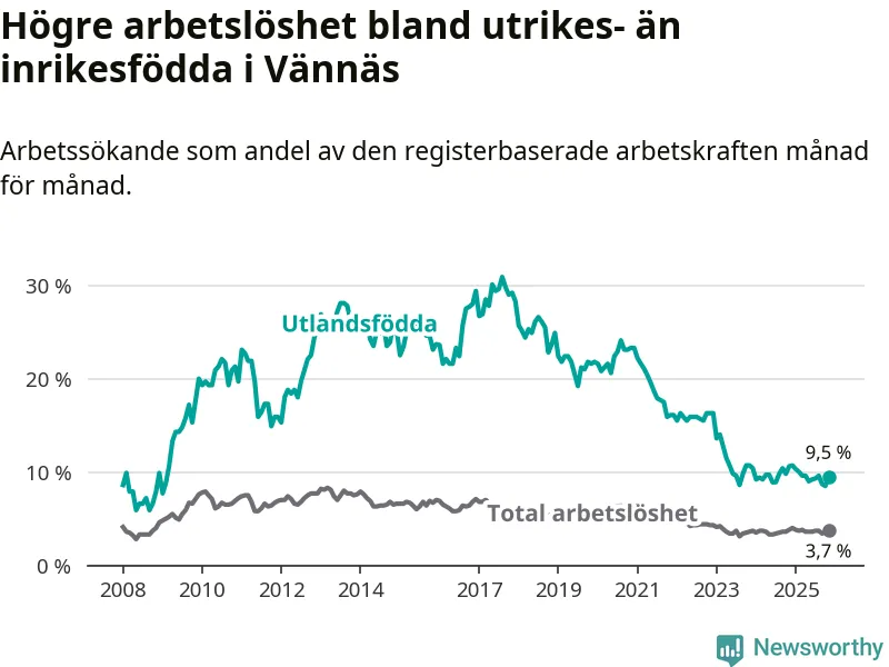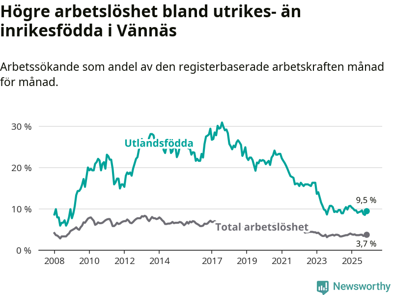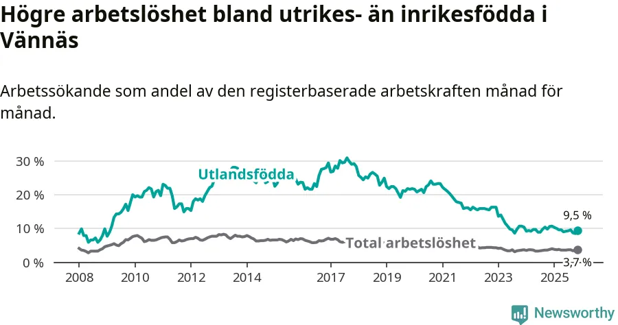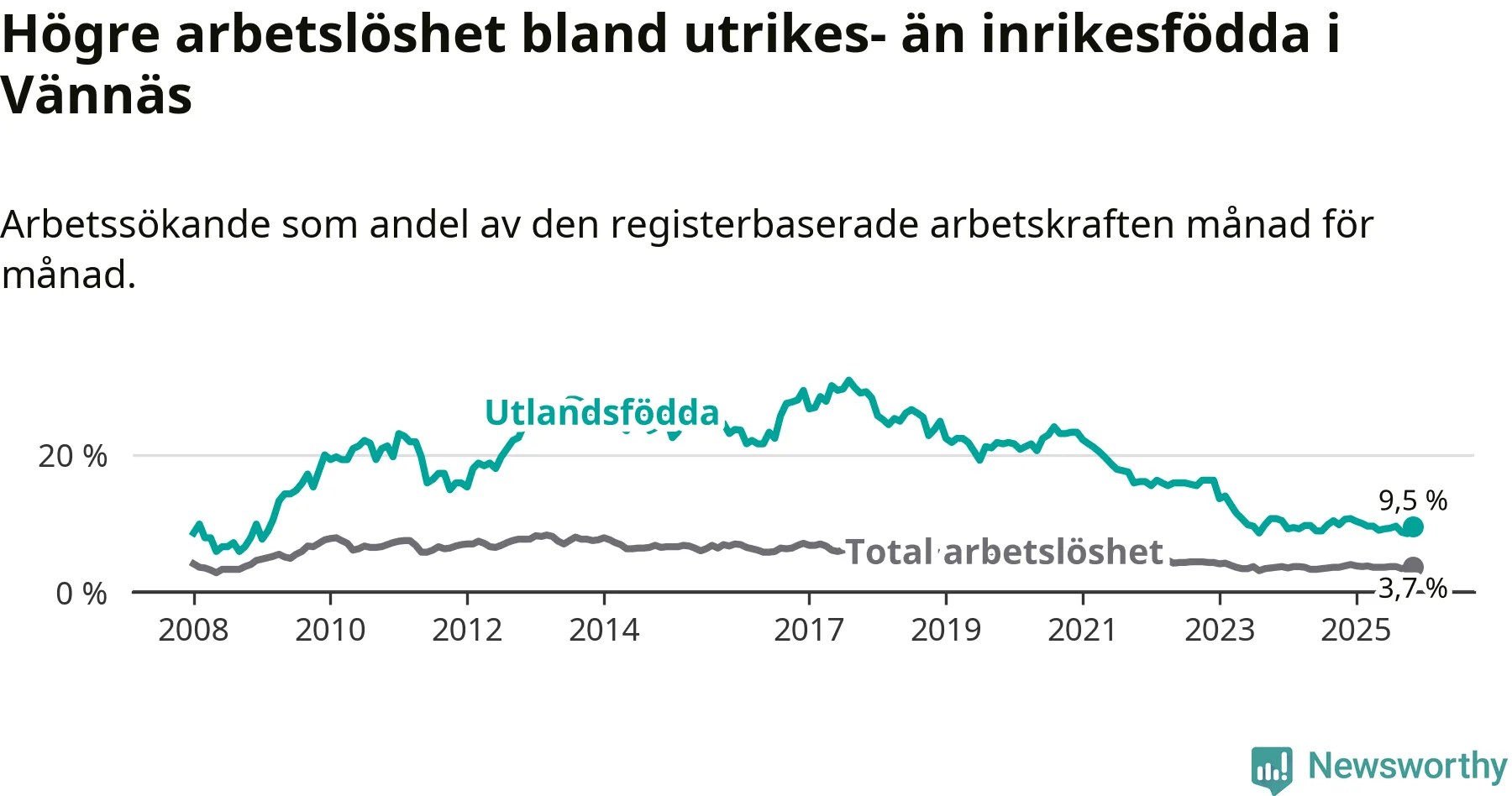 Skillnaden i arbetslöshet mellan utrikesfödda och hela befolkningen är 5,8 procentenheter i Vännäs. Det är en mindre skillnad än för ett år sedan (−1,0 procentenheter).