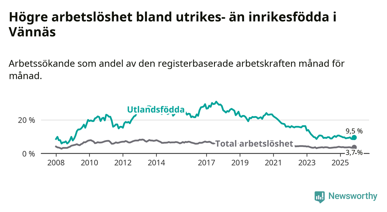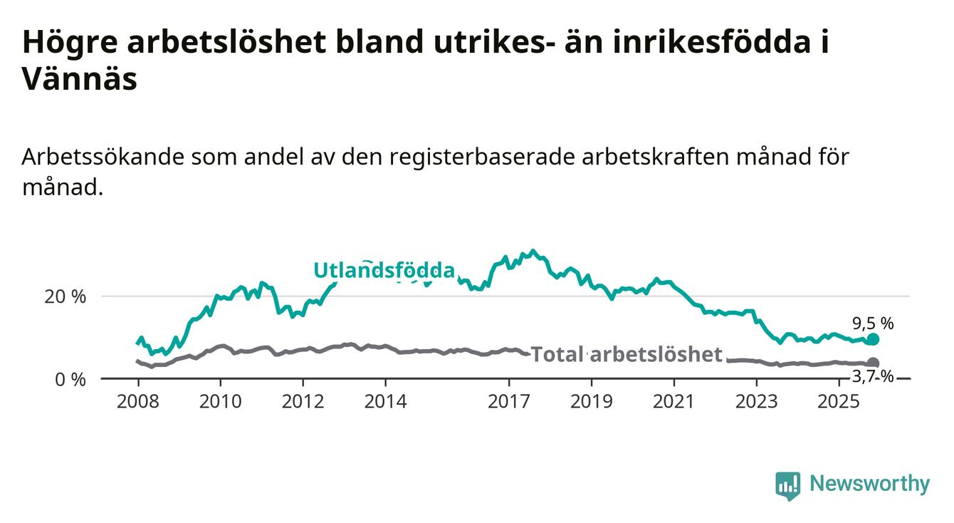 Arbetslösheten bland utlandsfödda var 9,5 procent i Vännäs under november månad, motsvarande 49 av 516 personer. Det är 1,1 procentenheter färre än vid samma tidpunkt i fjol (−6 om man räknar personer).