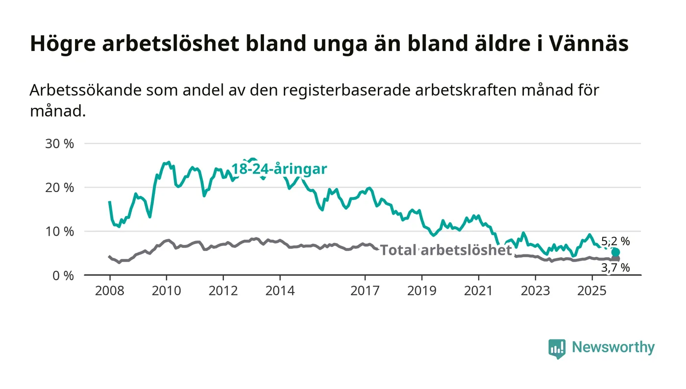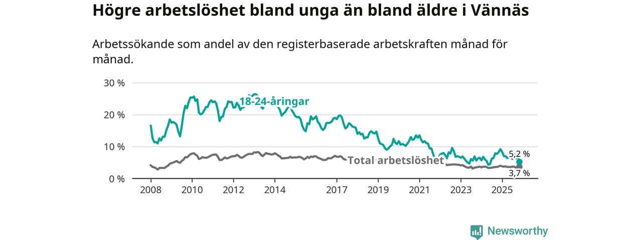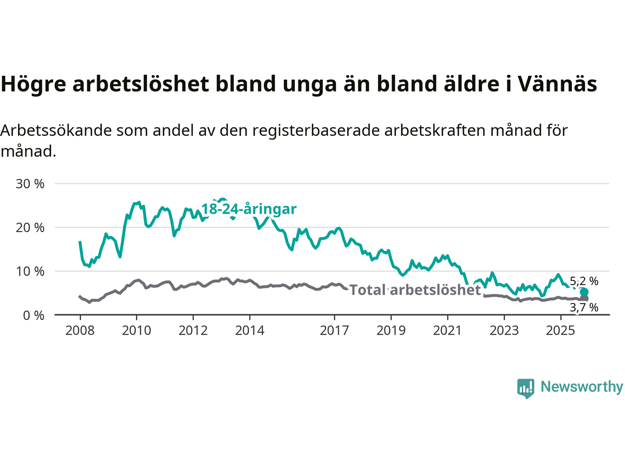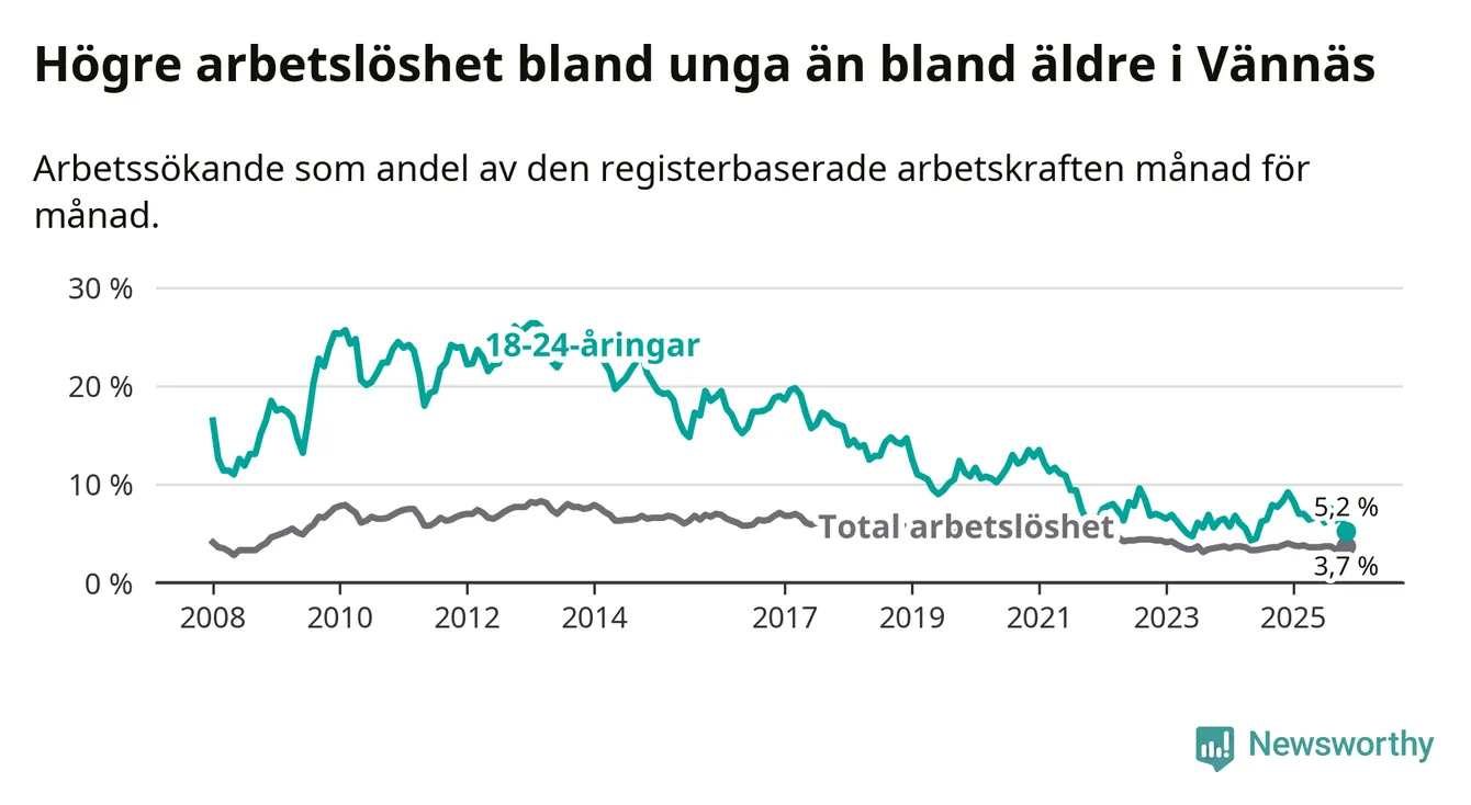 Den senaste månadsstatistiken från Arbetsförmedlingen visar på en nedgång i ungdomsarbetslöshet i Vännäs kommun med 3,1 procentenheter. Arbetslösheten bland personer i åldern 18–24 år låg i november på 5,2 procent.