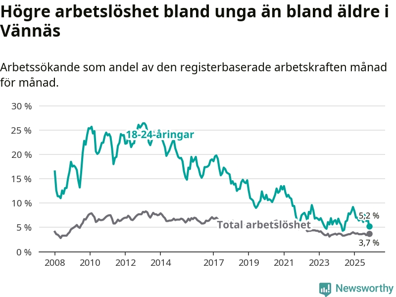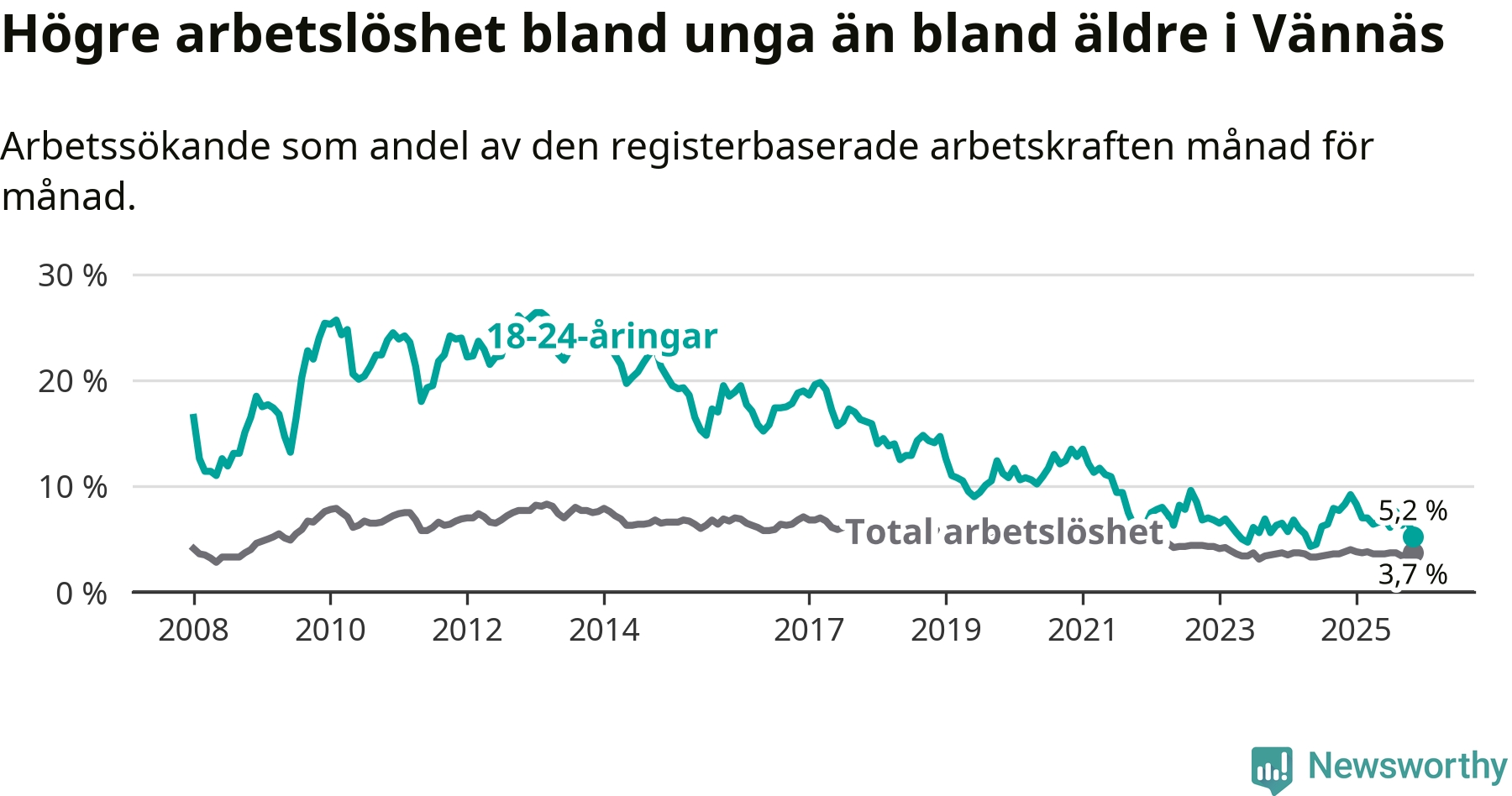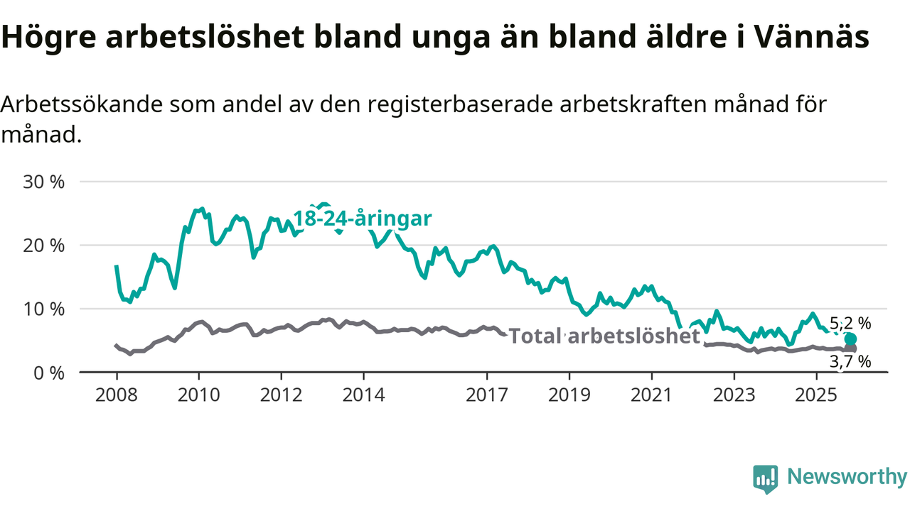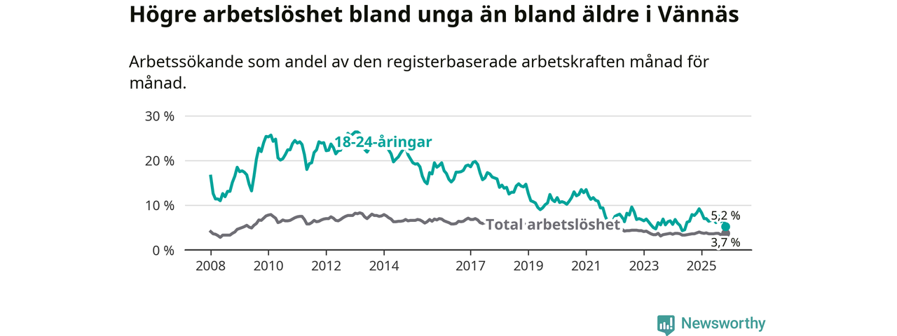 Den senaste månadsstatistiken från Arbetsförmedlingen visar på en nedgång i ungdomsarbetslöshet i Vännäs kommun med 3,1 procentenheter. Arbetslösheten bland personer i åldern 18–24 år låg i november på 5,2 procent.