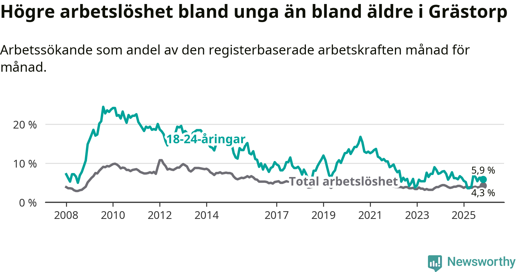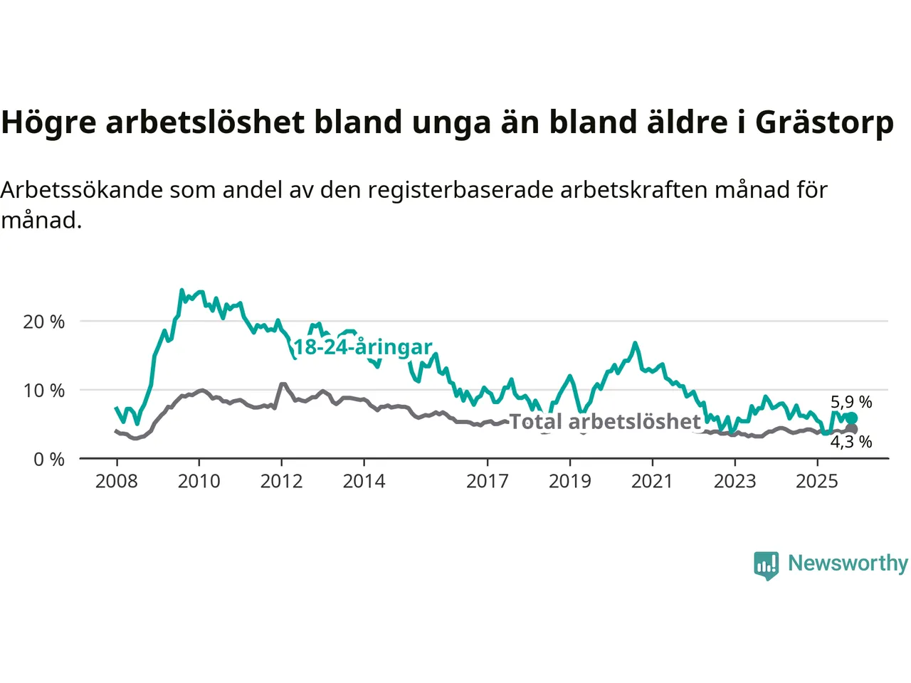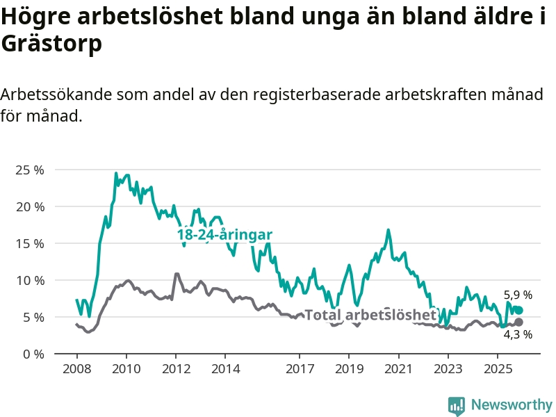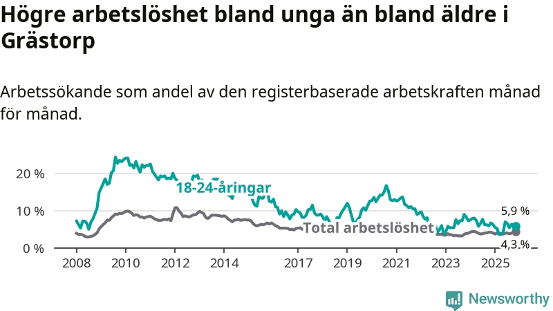 Till skillnad från den totala arbetslösheten sjunker arbetslösheten bland unga (−0,8 procentenheter). I november var 5,9 procent av 18–24-åringarna inskrivna som arbetssökande (motsvarande 14 personer). Mäter vi antalet inskrivna ser vi en minskning med tre personer på ett års sikt.