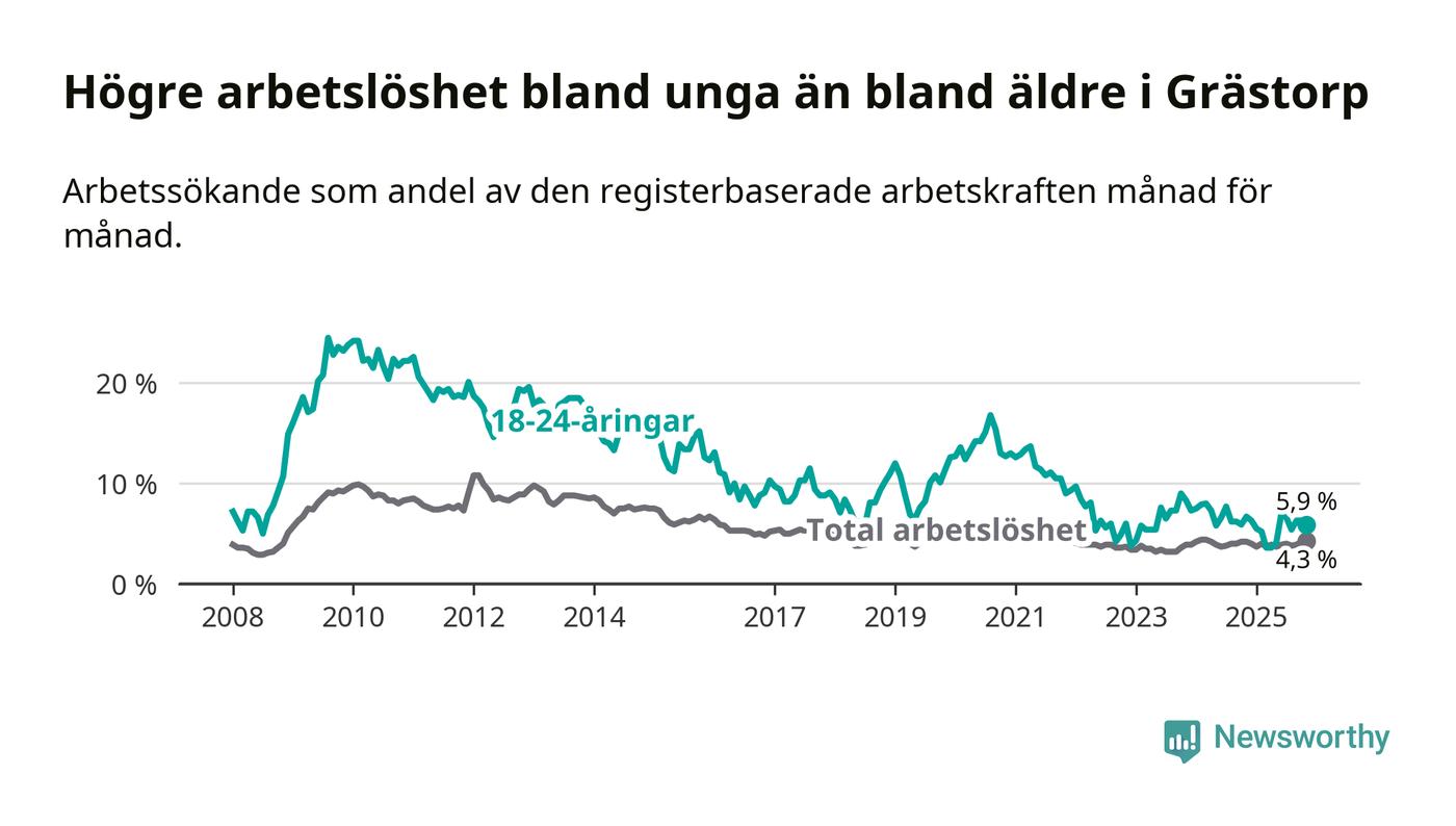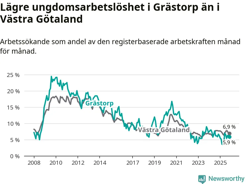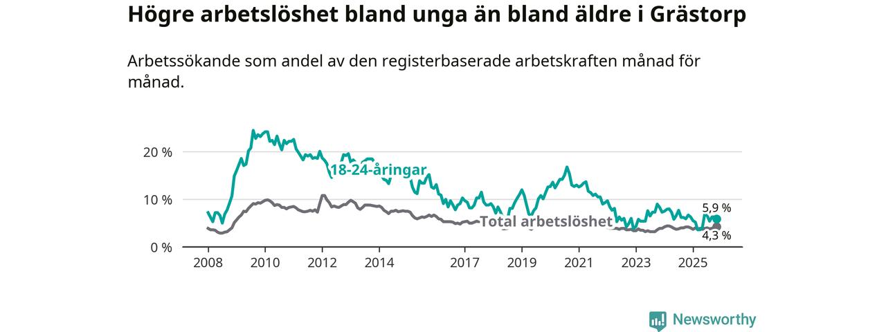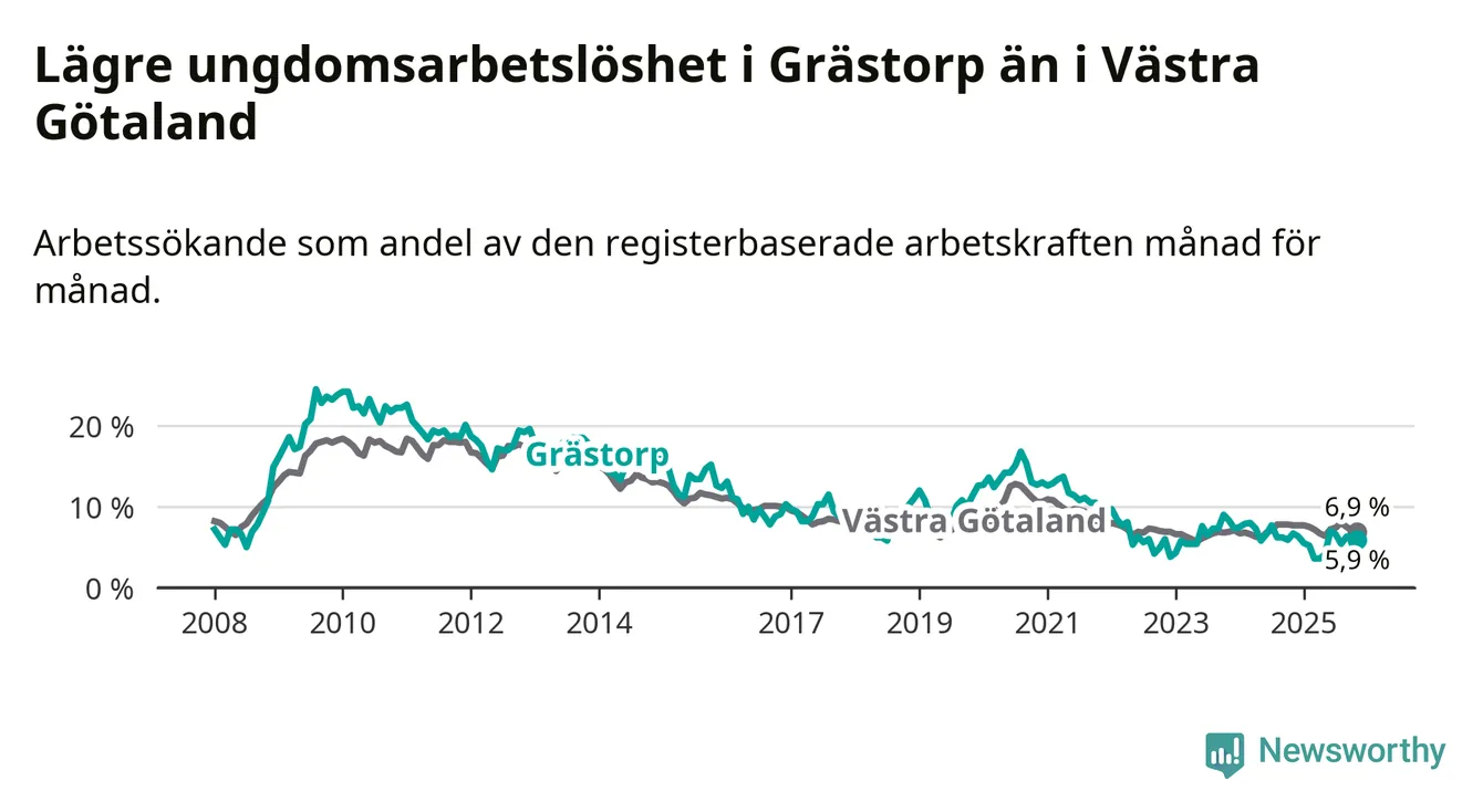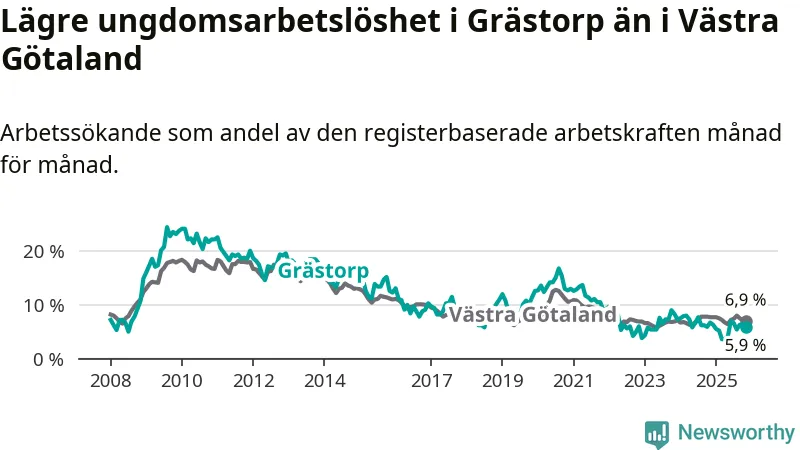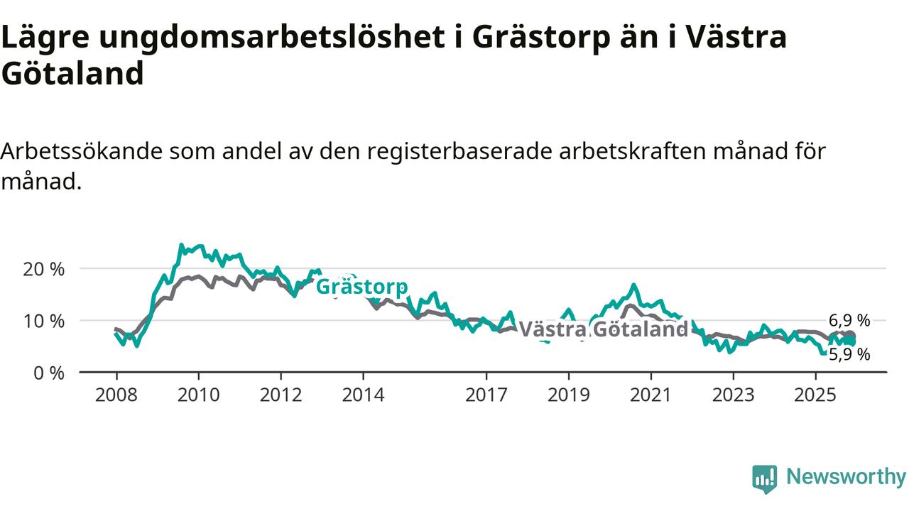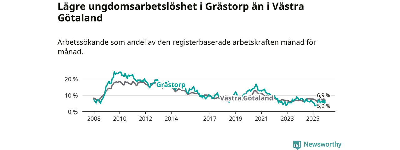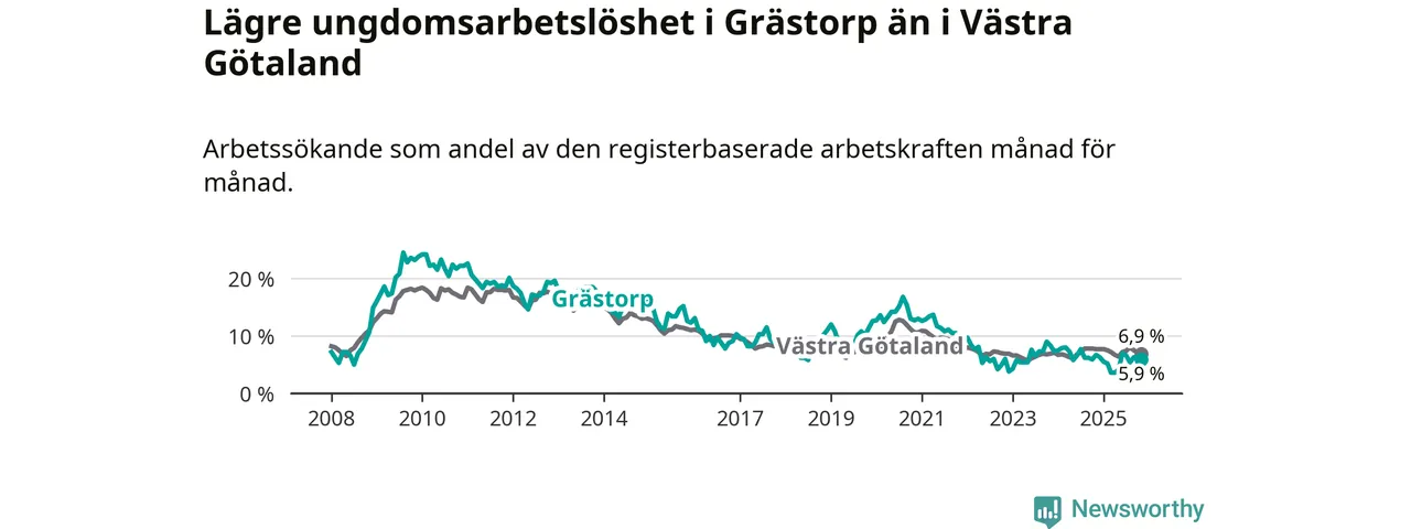 Precis som den totala arbetslösheten ligger ungdomsarbetslösheten i Grästorp lägre än i Västra Götaland som helhet. Skillnaden mellan kommunen och länet är 1,0 procentenheter.