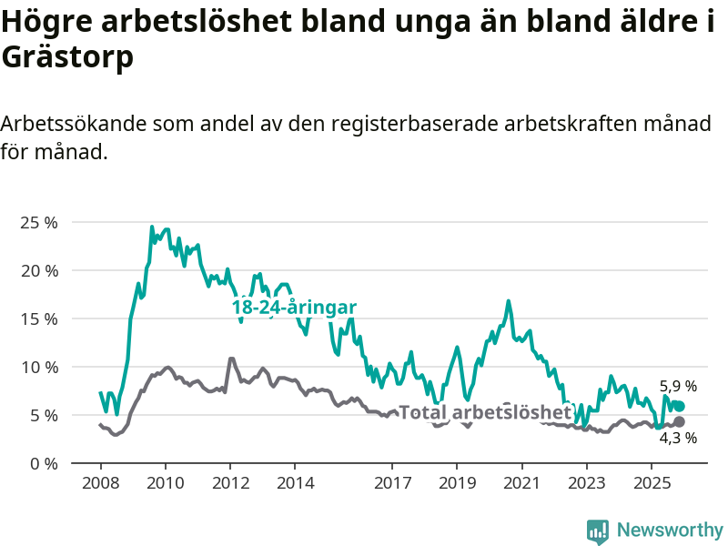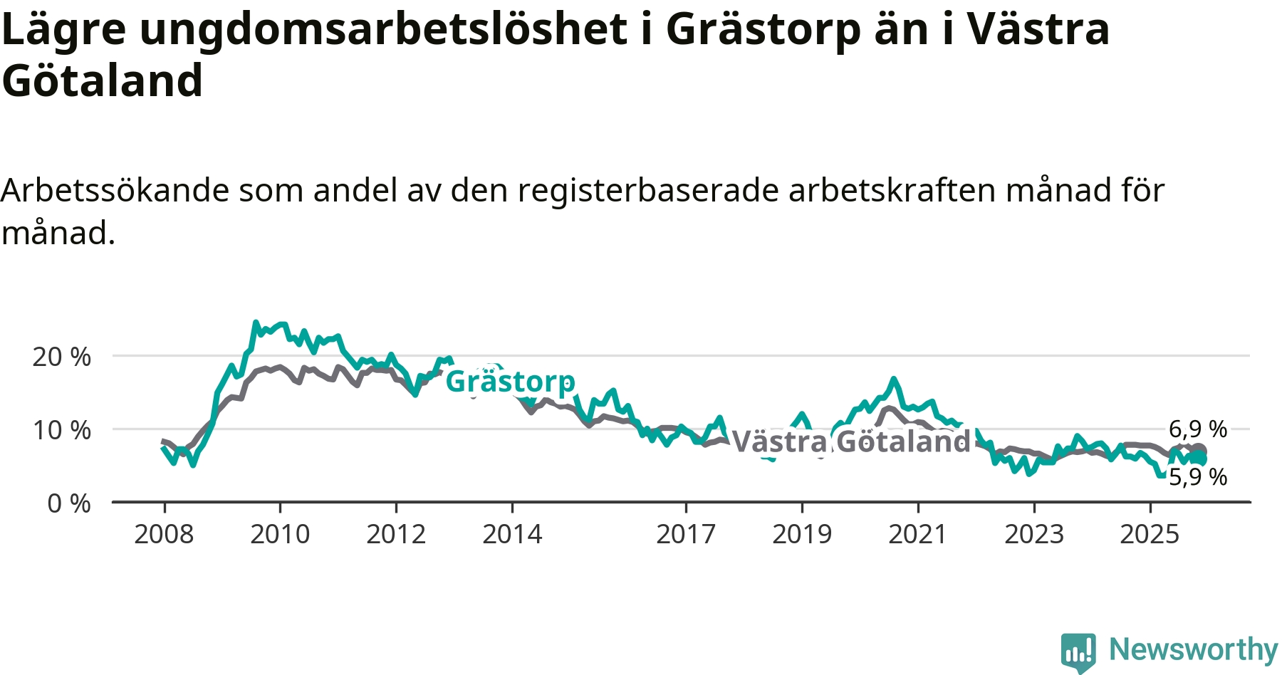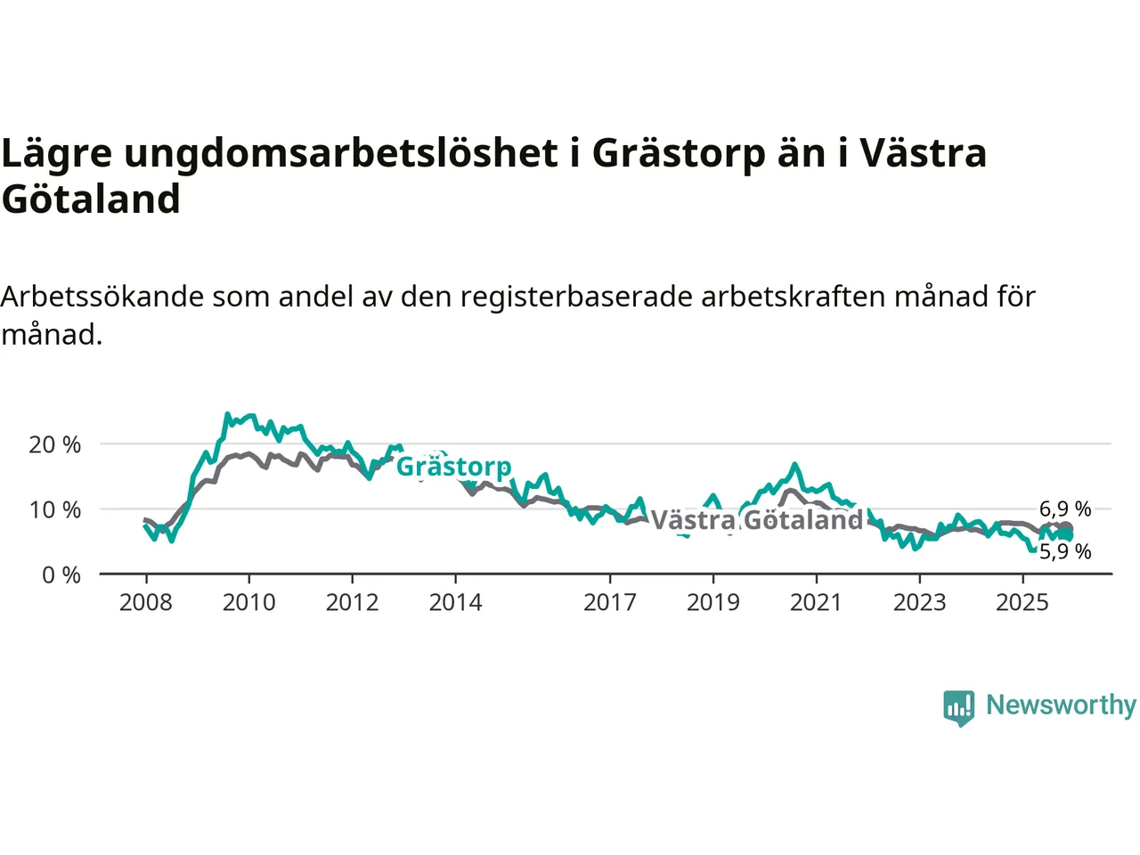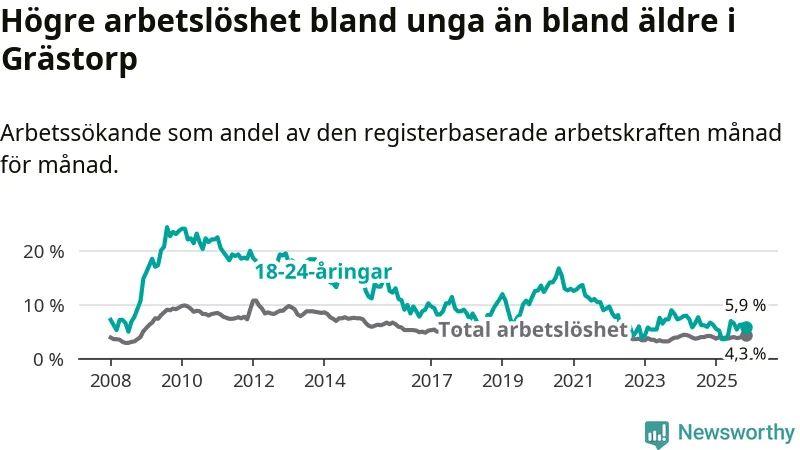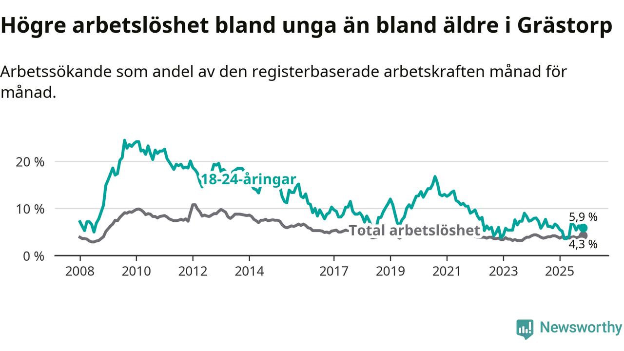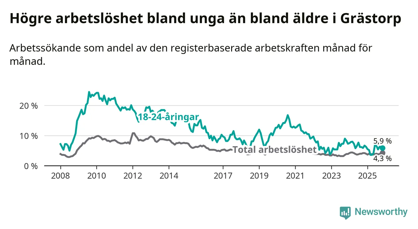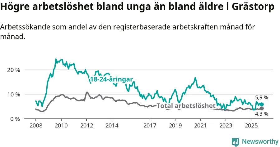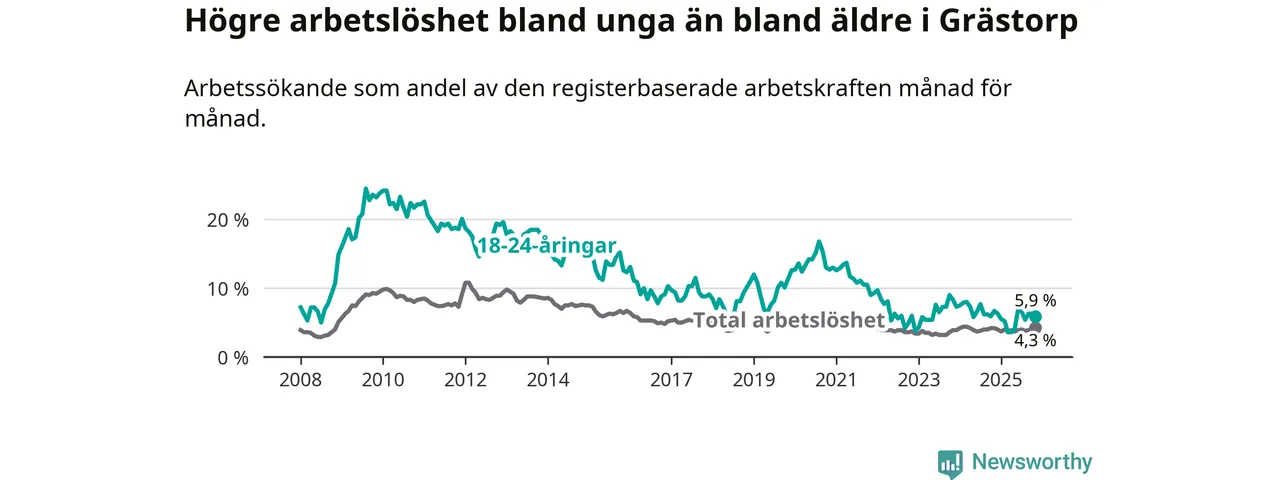 Precis som den totala arbetslösheten ligger ungdomsarbetslösheten i Grästorp lägre än i Västra Götaland som helhet. Skillnaden mellan kommunen och länet är 1,0 procentenheter.