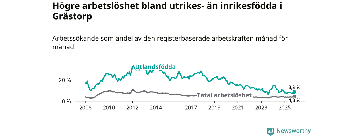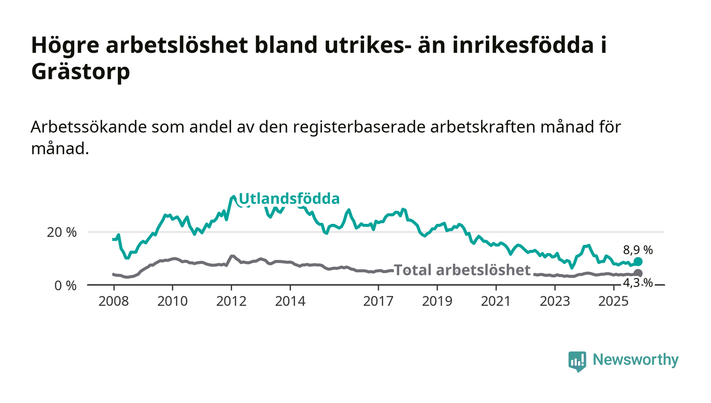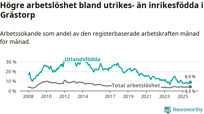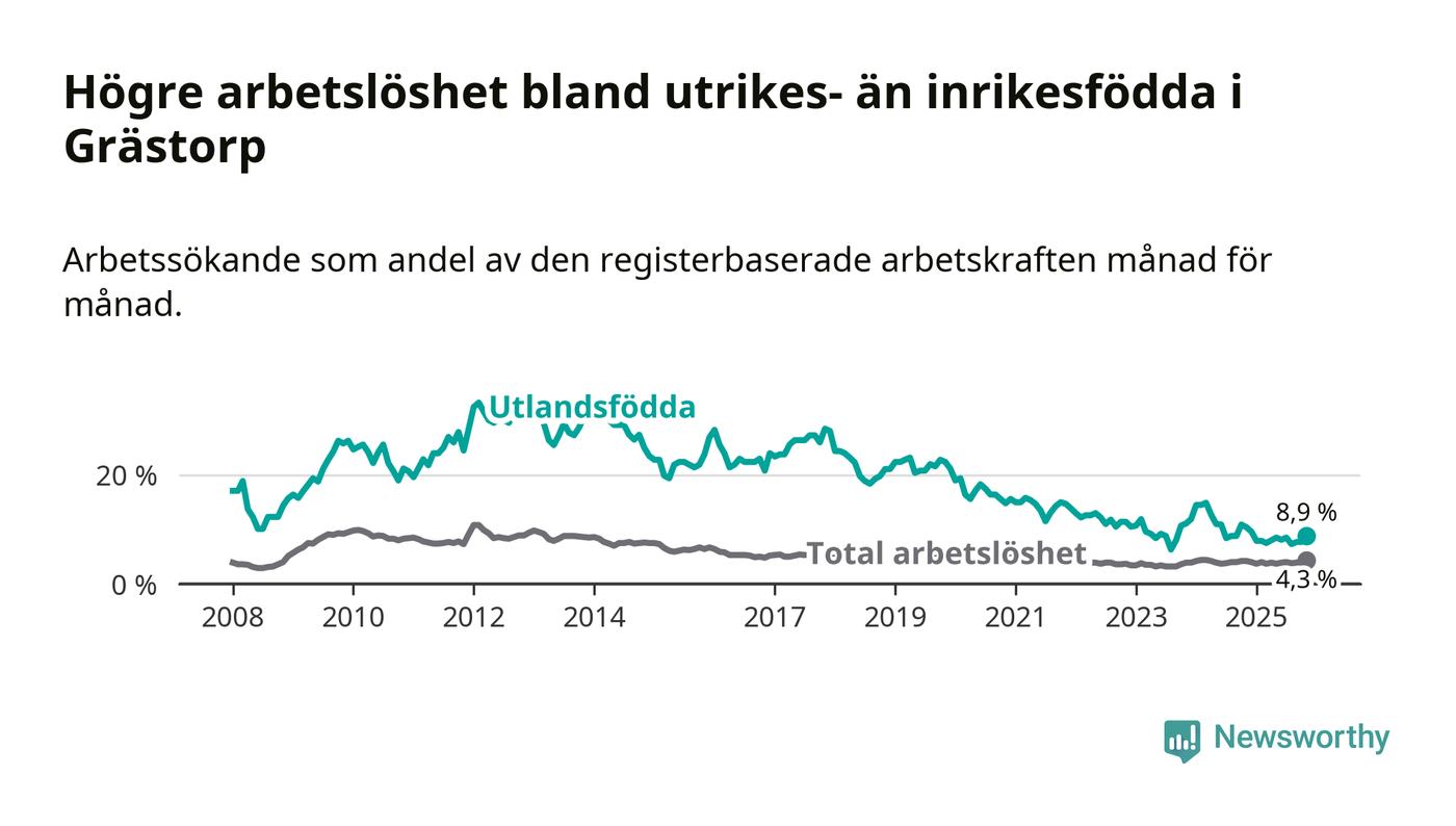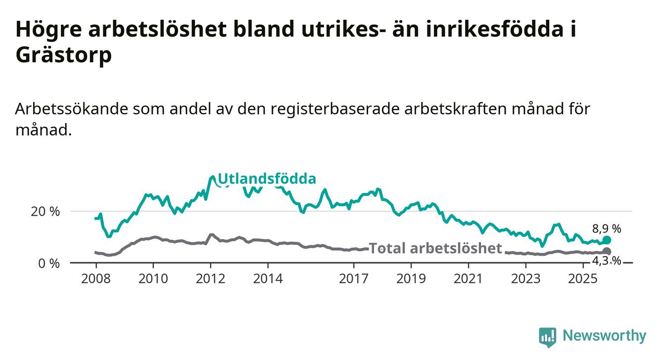 Arbetslösheten bland utlandsfödda var 8,9 procent i Grästorp under november månad, motsvarande 21 av 236 personer. Det är 1,5 procentenheter färre än vid samma tidpunkt i fjol (−4 om man räknar personer).