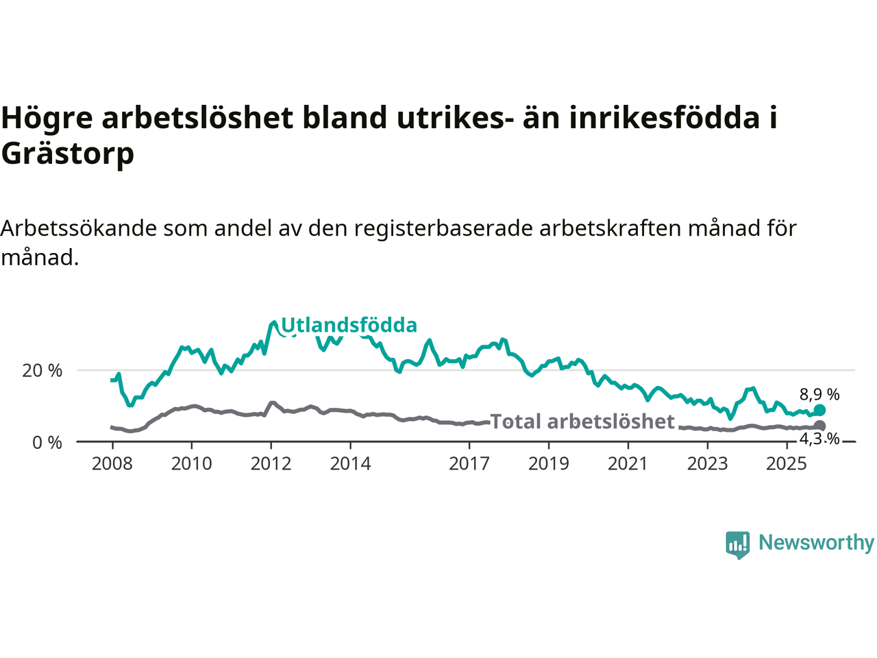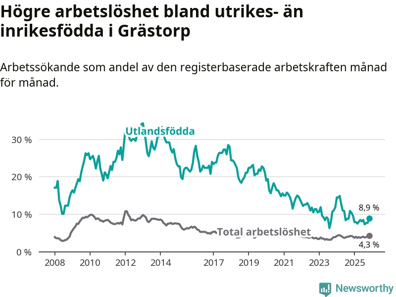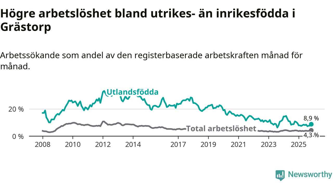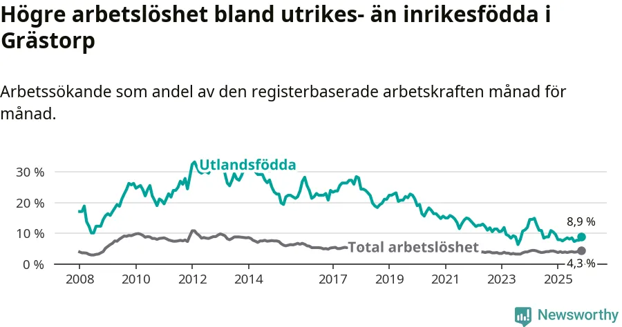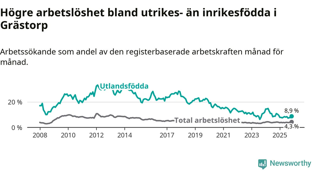 Arbetslösheten bland utlandsfödda var 8,9 procent i Grästorp under november månad, motsvarande 21 av 236 personer. Det är 1,5 procentenheter färre än vid samma tidpunkt i fjol (−4 om man räknar personer).