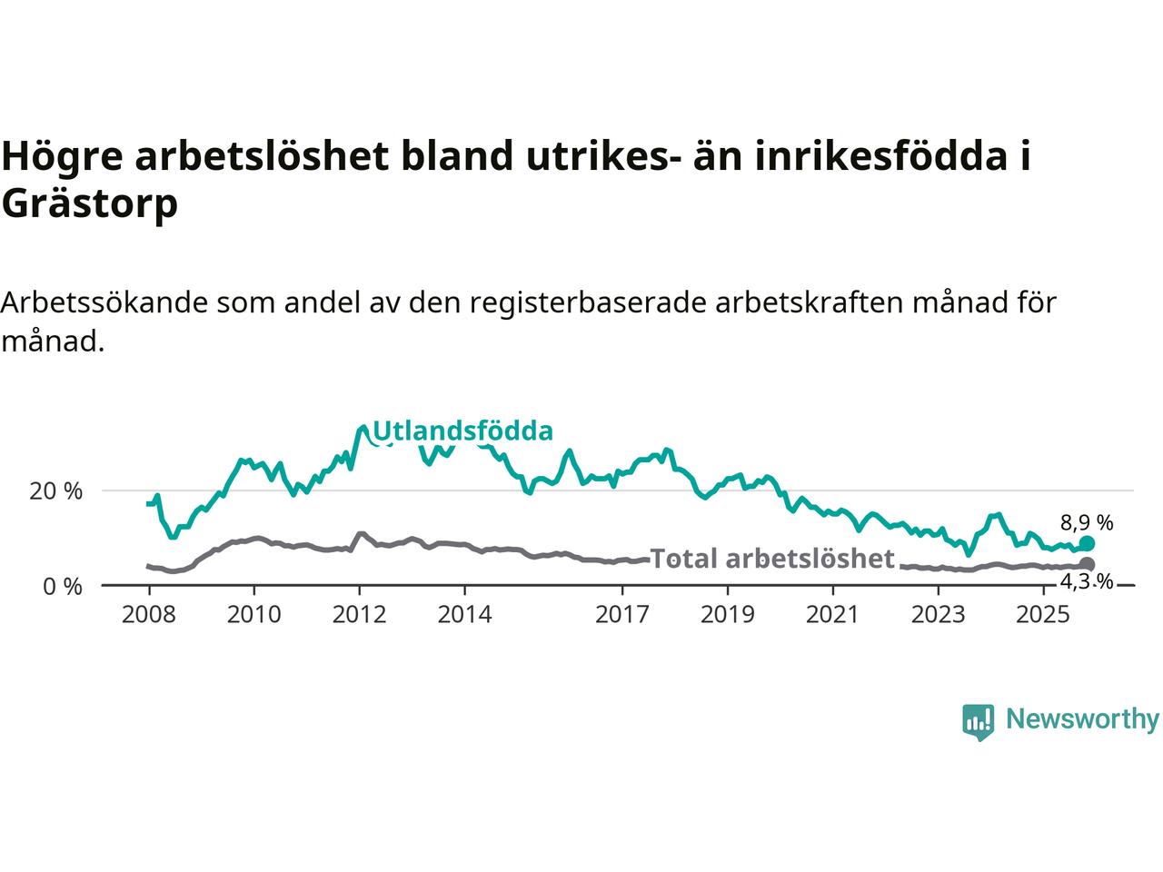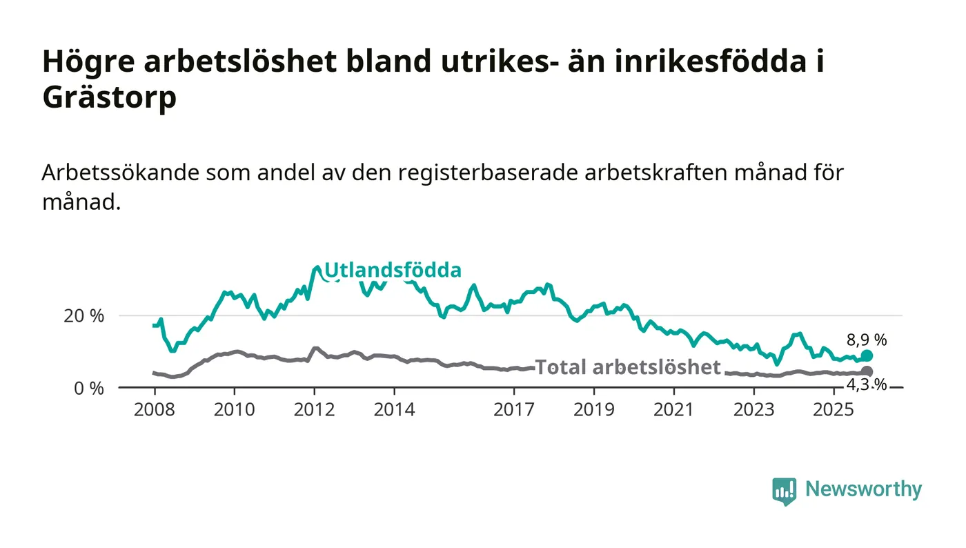 Skillnaden i arbetslöshet mellan utrikesfödda och hela befolkningen är 4,6 procentenheter i Grästorp. Det är en betydligt mindre skillnad än för ett år sedan (−1,6 procentenheter).