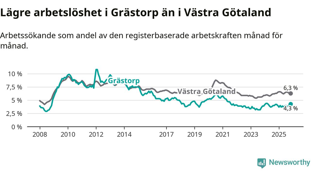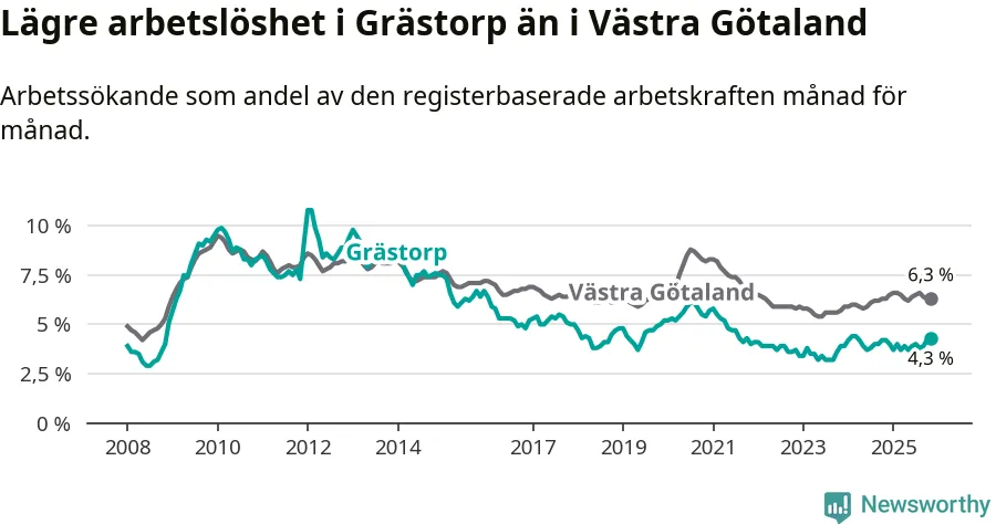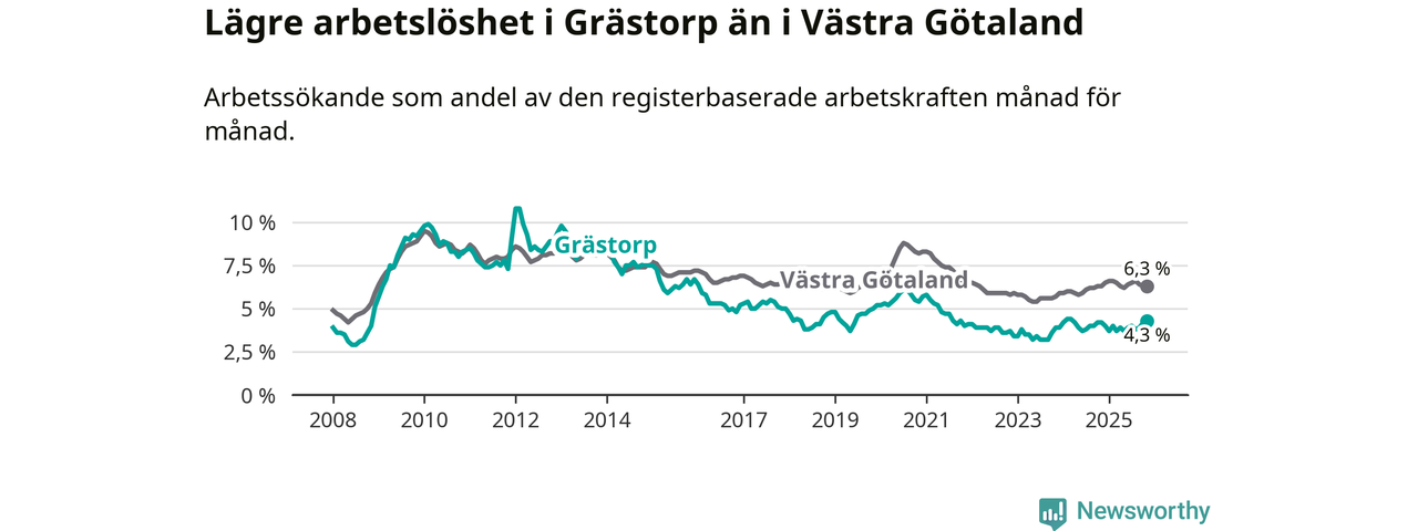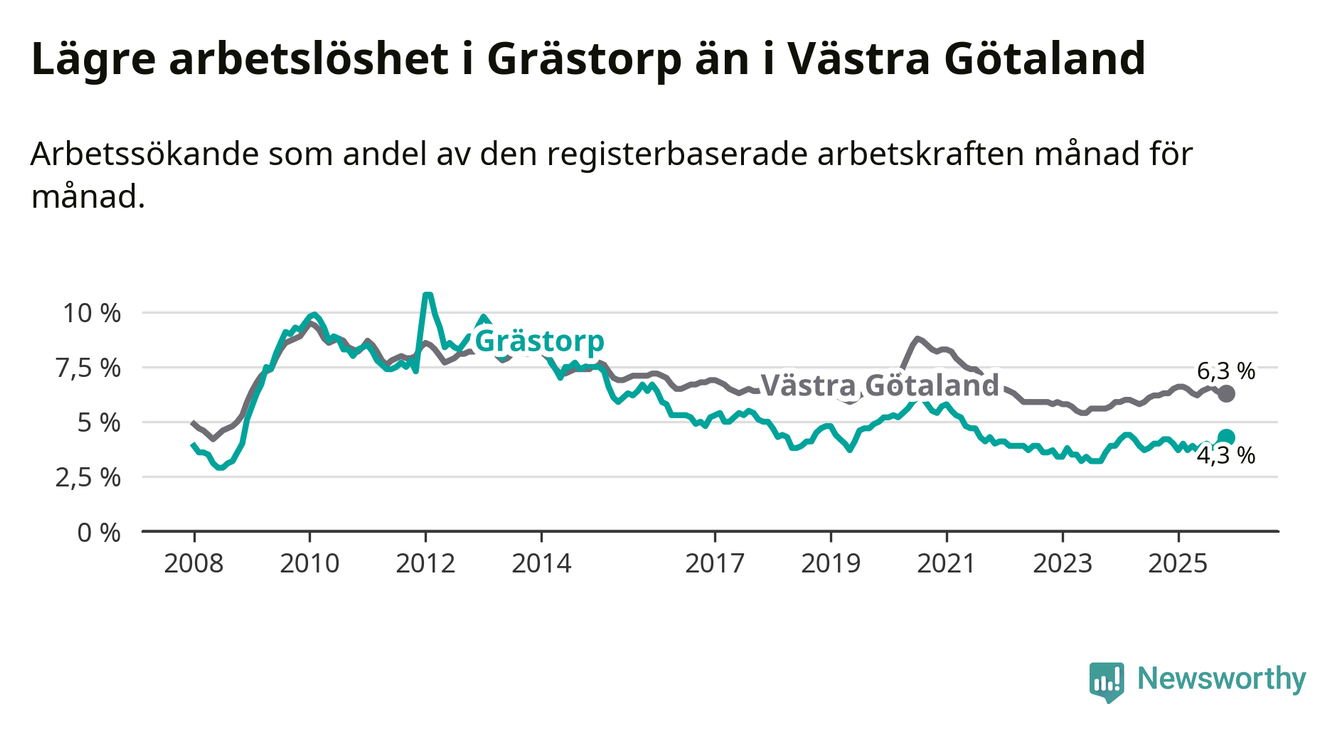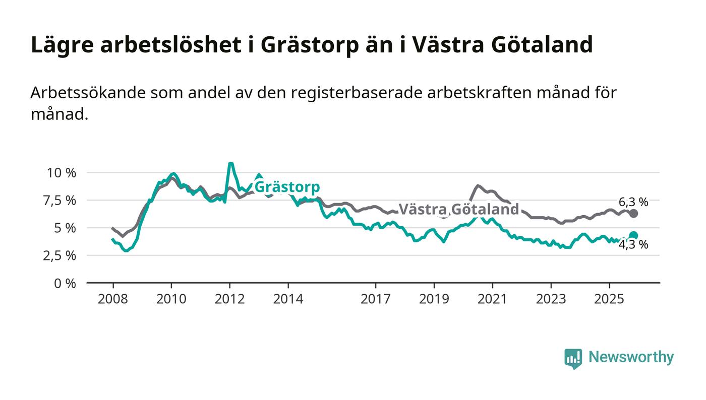 Även om arbetslösheten i Grästorp alltså ökar, så ligger den fortfarande under snittet i hela Västra Götalands län (4,3 procent i kommunen, jämfört med 6,3 procent i hela länet). Öckerö har den lägsta arbetslösheten i länet (2,9 procent), medan Gullspång har den högsta (8,6 procent). För att Grästorp skulle komma ner i samma arbetslöshetsnivå som Öckerö skulle 37 personer behöva sysselsättas.