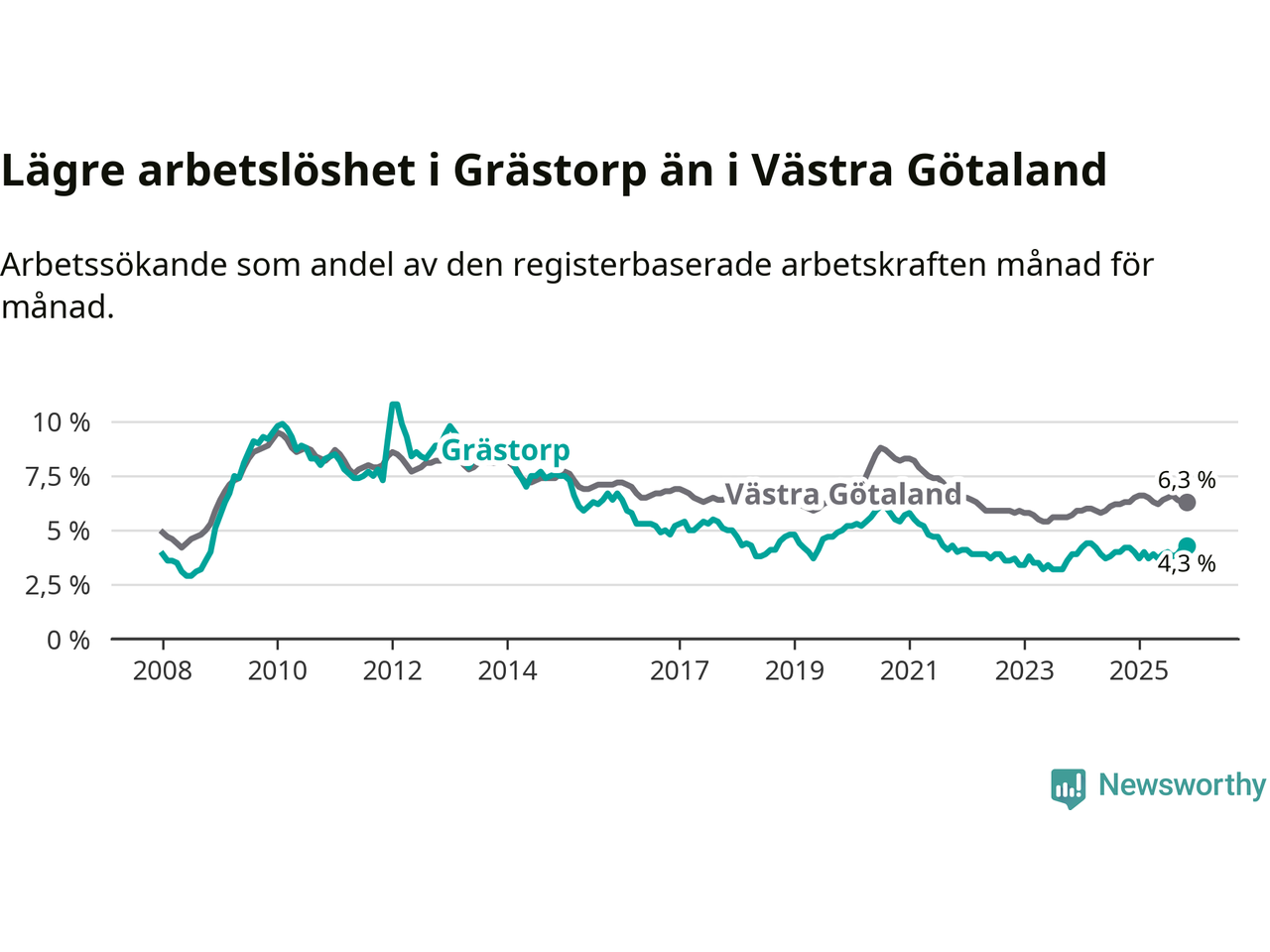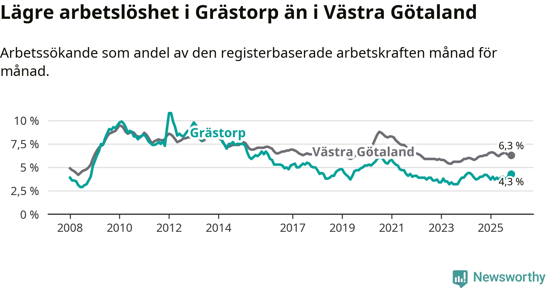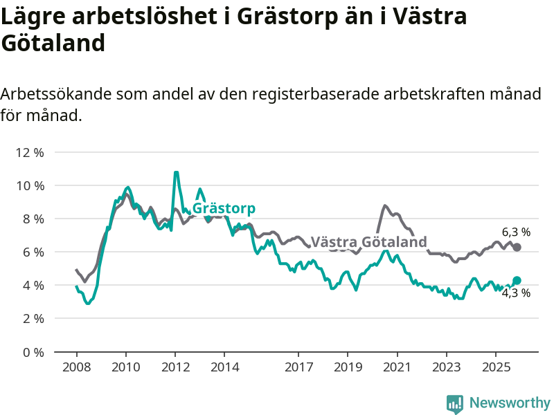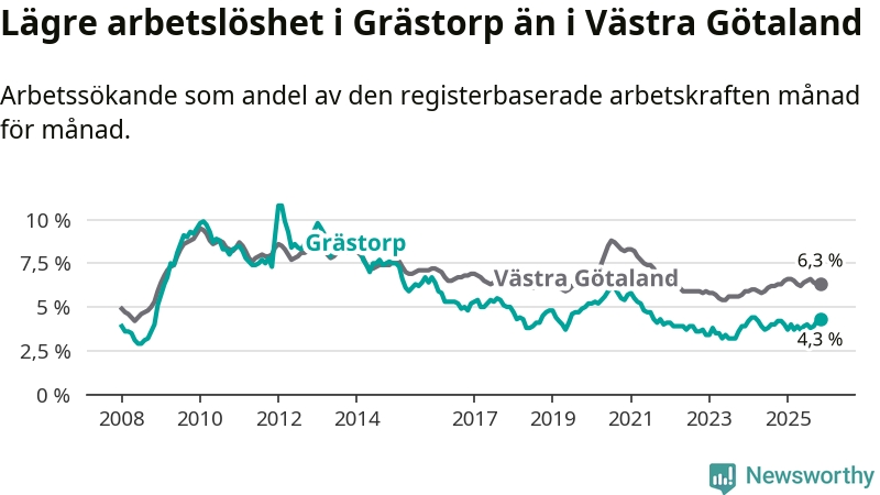 Även om arbetslösheten i Grästorp alltså ökar, så ligger den fortfarande under snittet i hela Västra Götalands län (4,3 procent i kommunen, jämfört med 6,3 procent i hela länet). Öckerö har den lägsta arbetslösheten i länet (2,9 procent), medan Gullspång har den högsta (8,6 procent). För att Grästorp skulle komma ner i samma arbetslöshetsnivå som Öckerö skulle 37 personer behöva sysselsättas.
