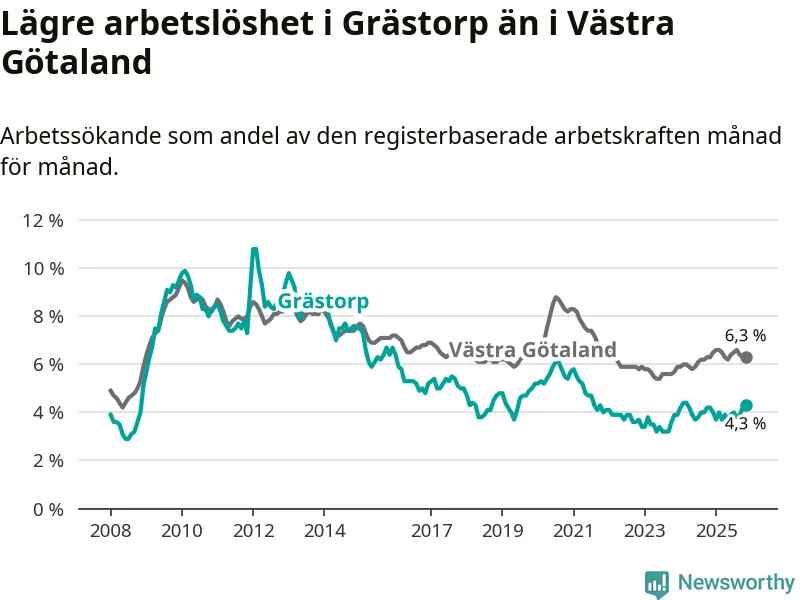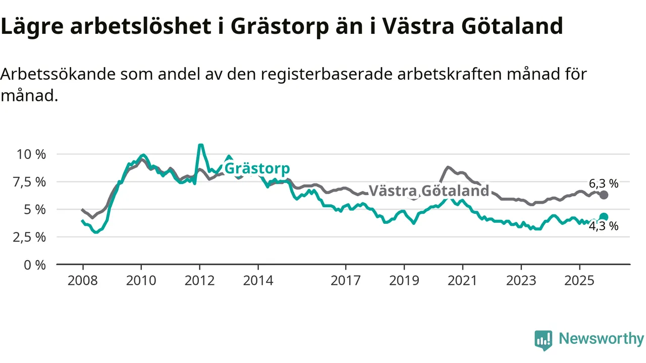 Under november månad rapporterade Grästorps kommun en total arbetslöshet på 4,3 procent. Det är en ökning jämfört med samma tidpunkt i fjol (+0,1 procentenheter). I Västra Götalands län däremot står arbetslösheten stilla.