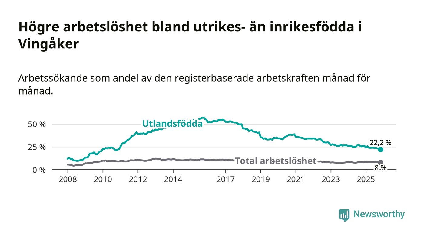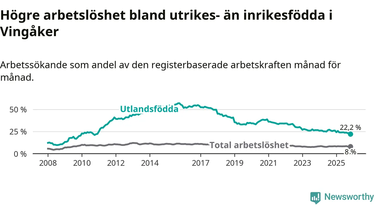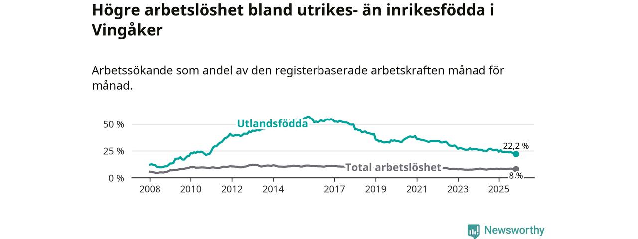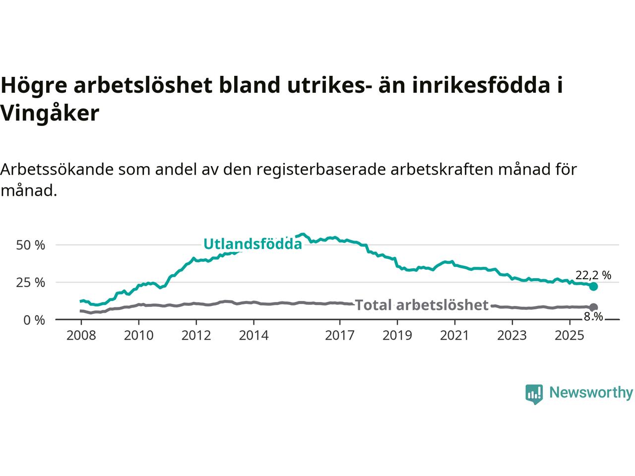 Arbetslösheten bland utlandsfödda var 22,2 procent i Vingåker under november månad, motsvarande 134 av 604 personer. Det är 3,8 procentenheter färre än vid samma tidpunkt i fjol (−28 om man räknar personer). Därmed är de utlandsföddas arbetslöshet lägre än vid samma tidpunkt i fjol för 16:e månaden i följd. Sedan juli 2024 har arbetslösheten bland utlandsfödda minskat från 26,5 till 22,2 procent. Den nuvarande arbetslöshetsnivån är den lägsta sedan november 2010.