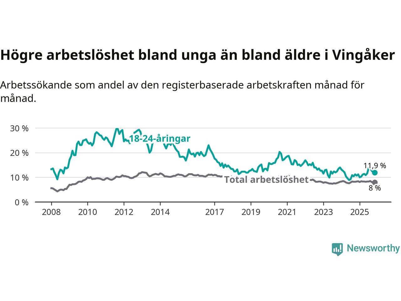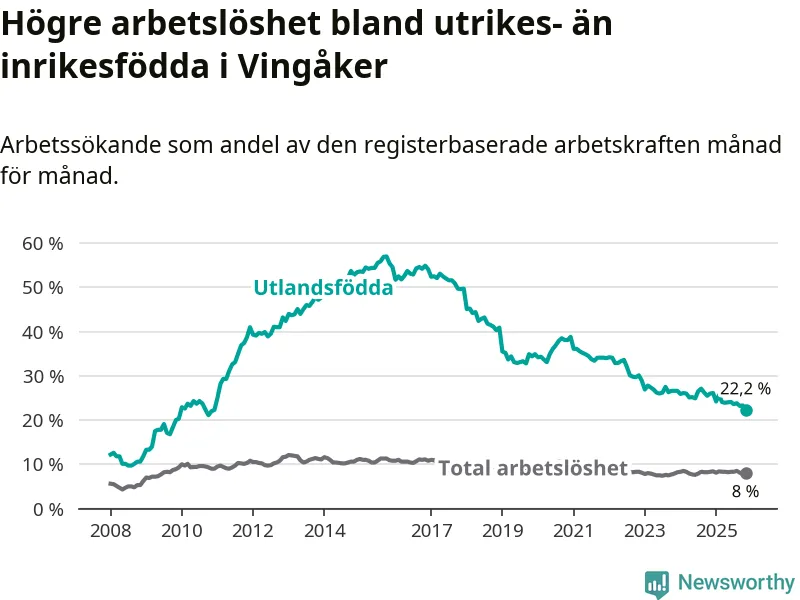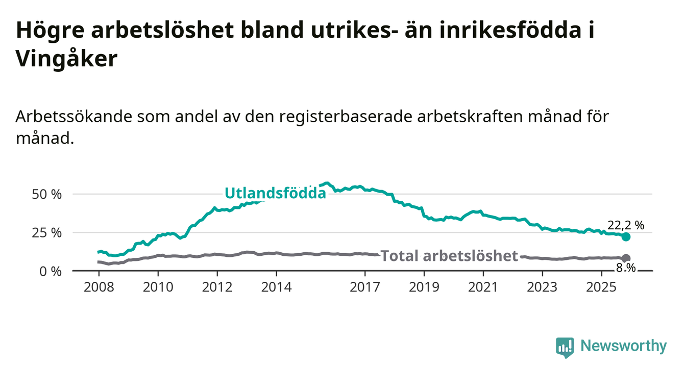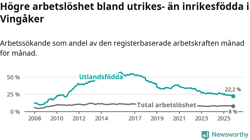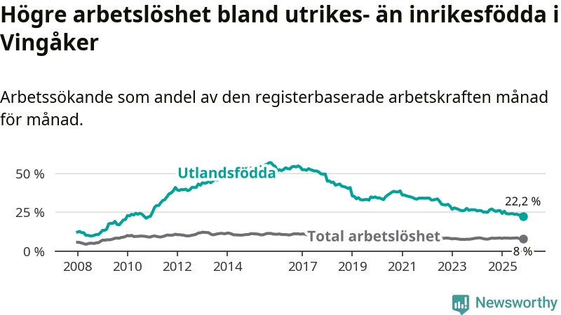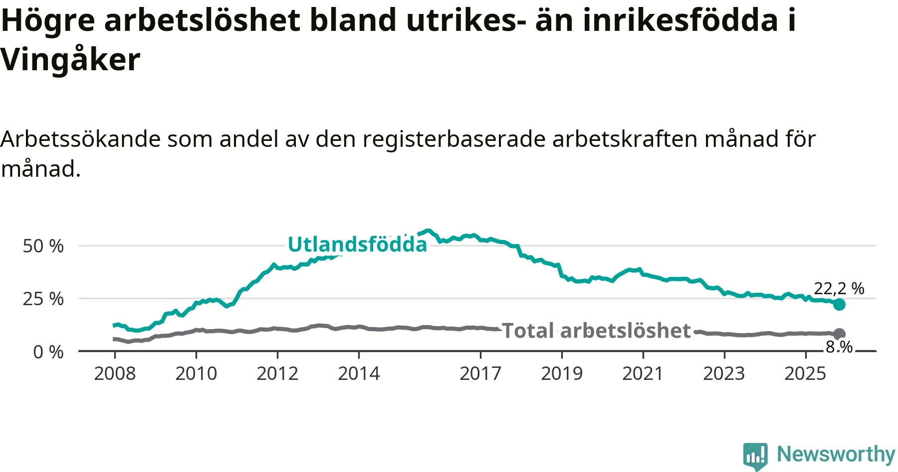 Arbetslösheten bland utlandsfödda var 22,2 procent i Vingåker under november månad, motsvarande 134 av 604 personer. Det är 3,8 procentenheter färre än vid samma tidpunkt i fjol (−28 om man räknar personer). Därmed är de utlandsföddas arbetslöshet lägre än vid samma tidpunkt i fjol för 16:e månaden i följd. Sedan juli 2024 har arbetslösheten bland utlandsfödda minskat från 26,5 till 22,2 procent. Den nuvarande arbetslöshetsnivån är den lägsta sedan november 2010.