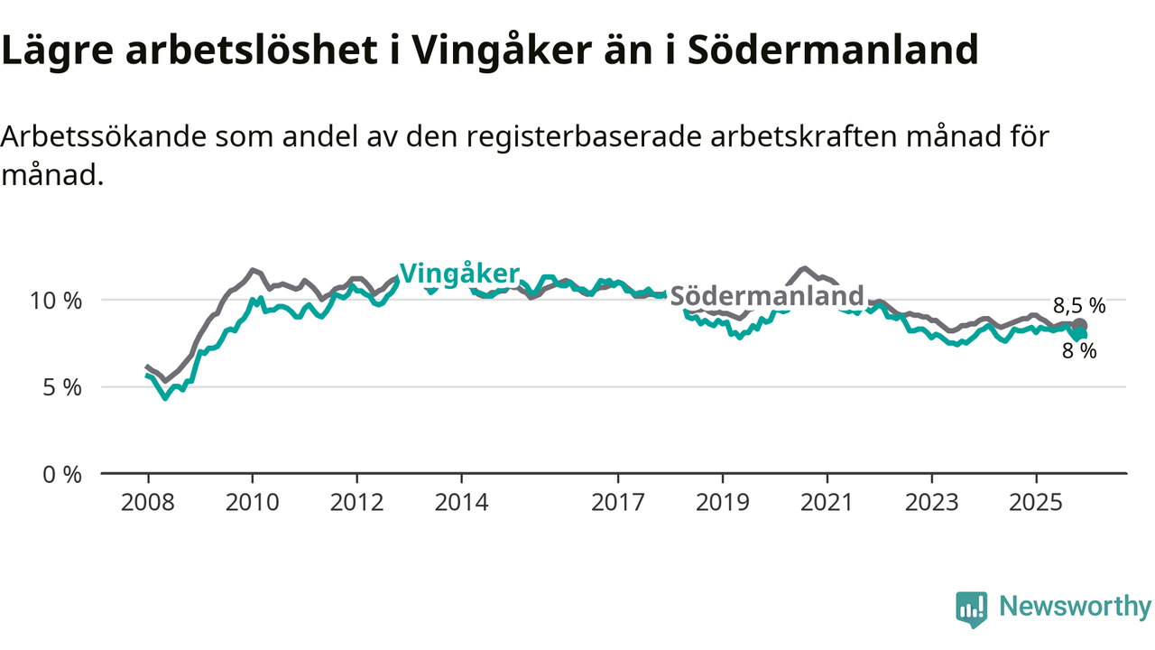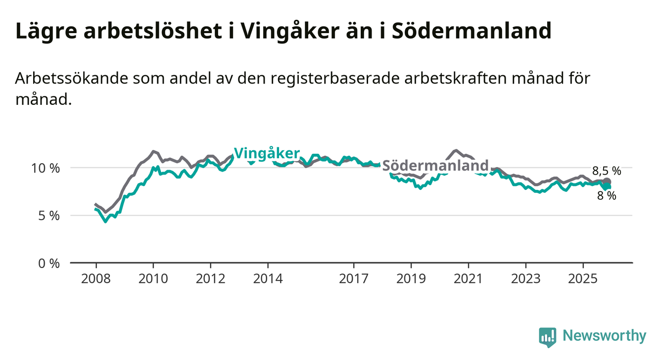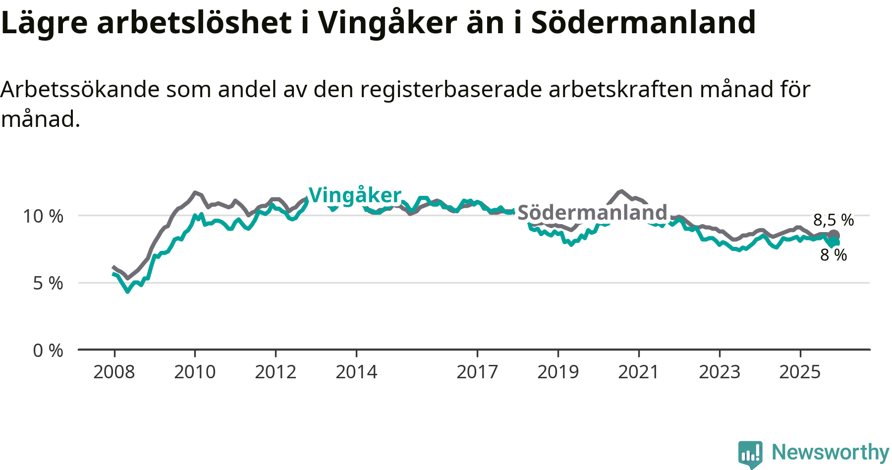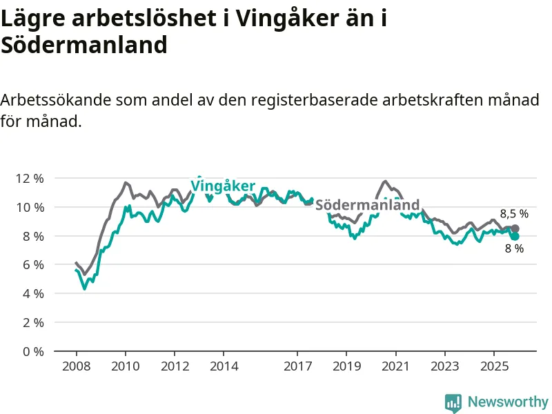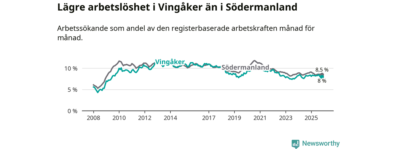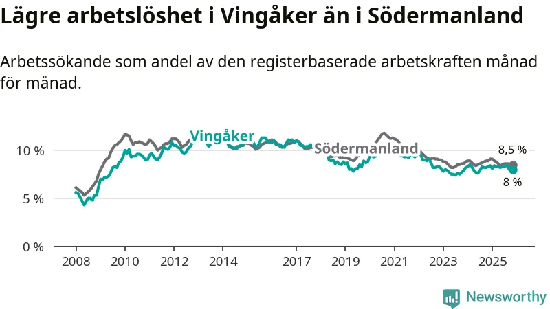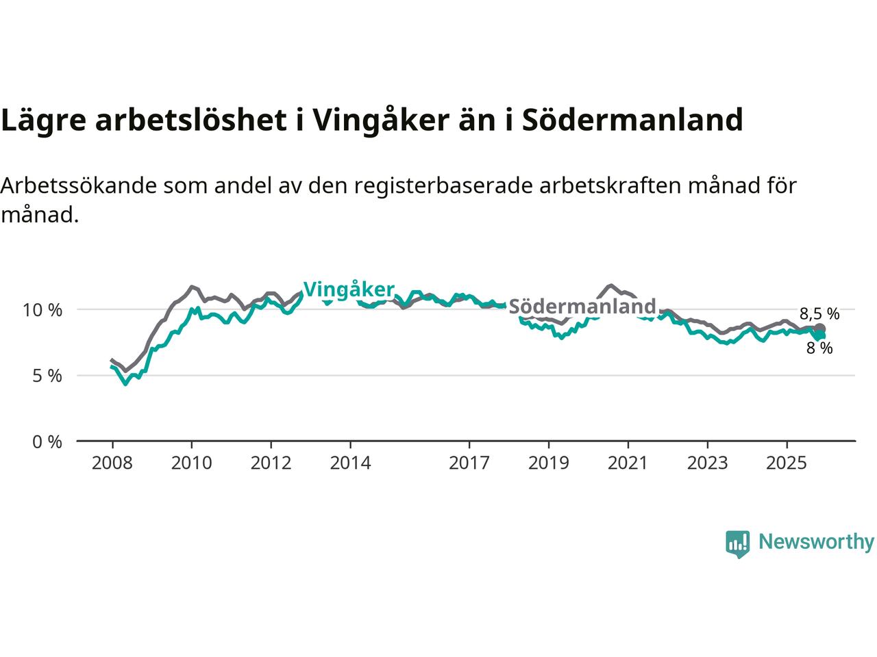 Under november månad rapporterade Vingåkers kommun en total arbetslöshet på 8,0 procent. Det är en minskning jämfört med samma tidpunkt i fjol (−0,3 procentenheter). Även i Södermanlands län sjunker arbetslösheten .