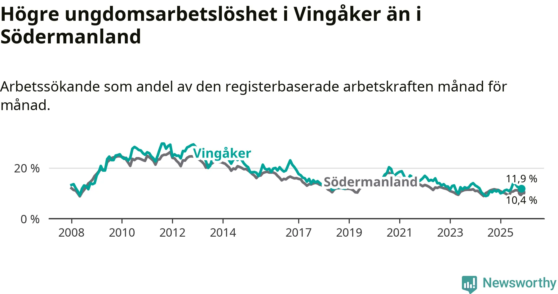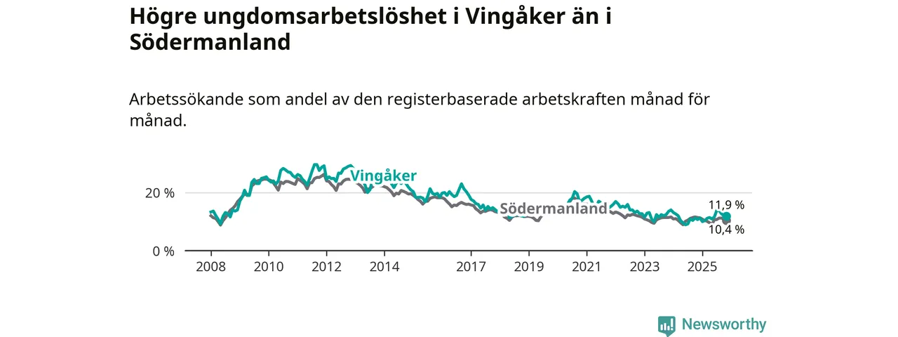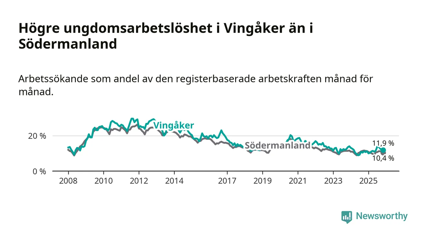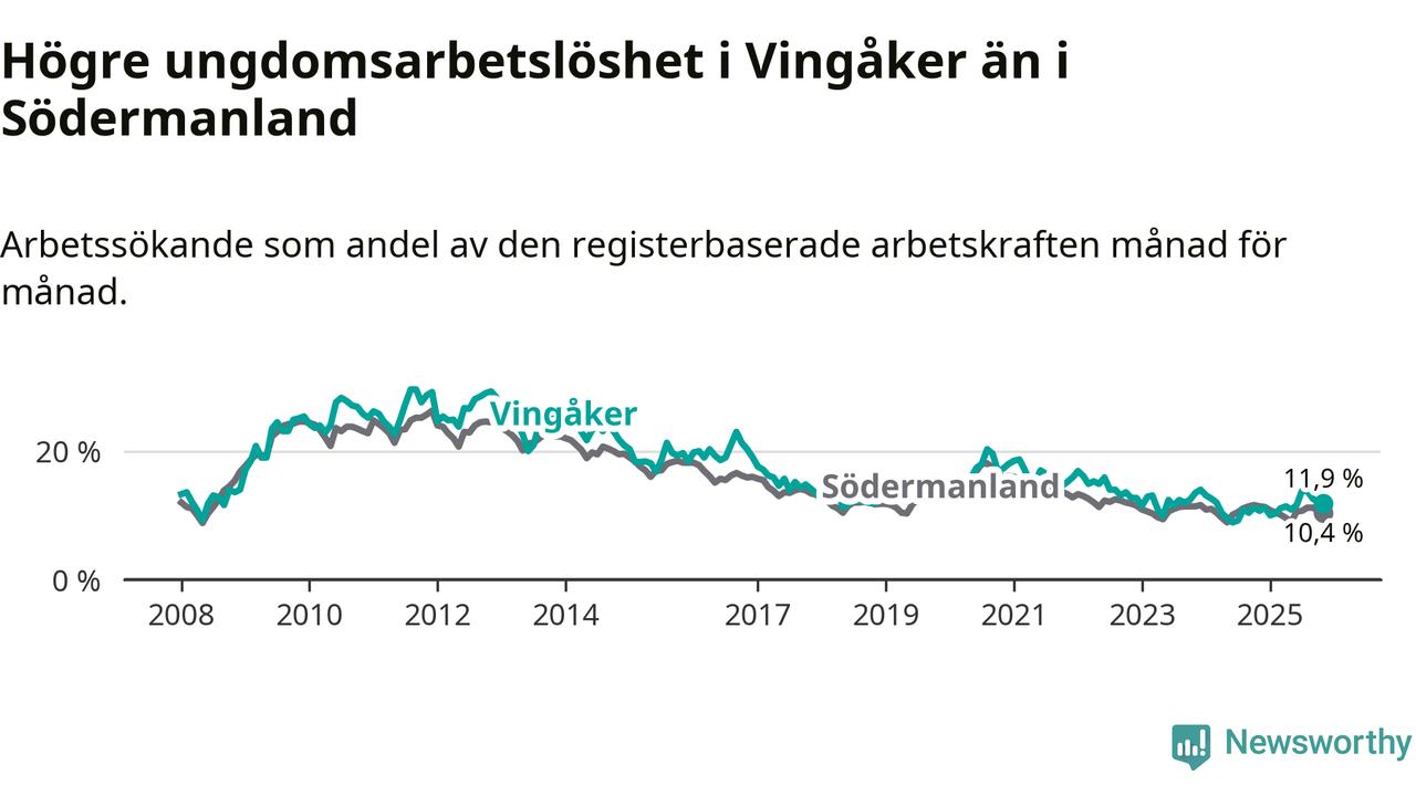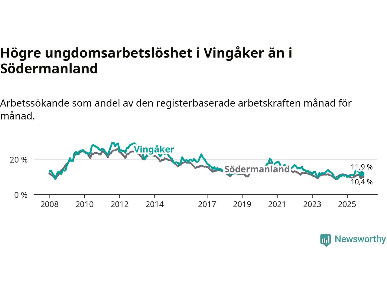 Medan Vingåker har lägre total arbetslöshet än Södermanland, ligger ungdomsarbetslösheten 1,5 procentenheter högre i Vingåker.