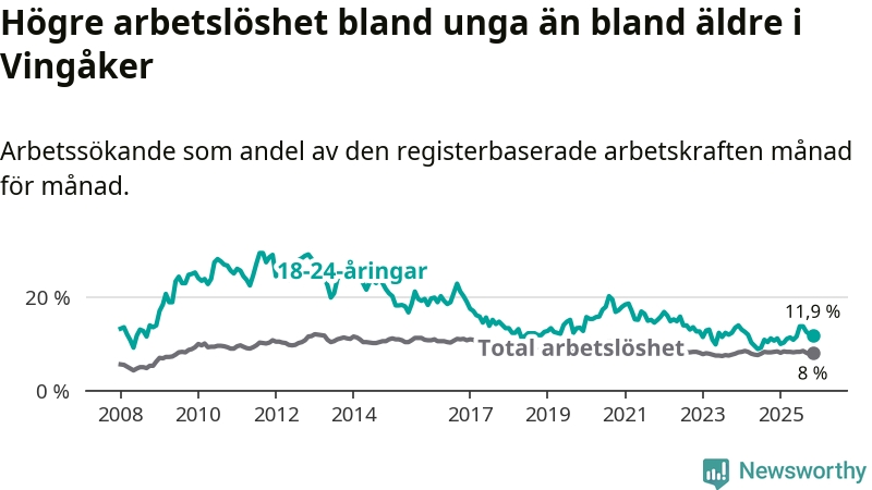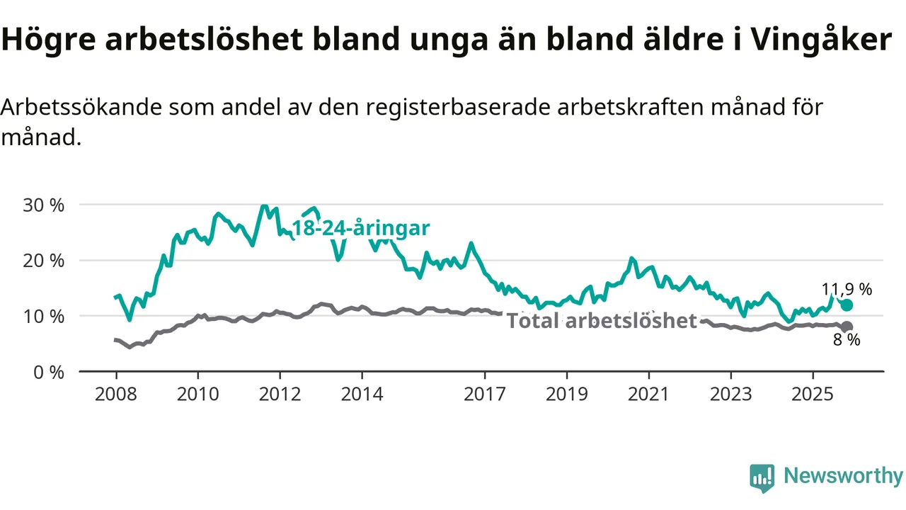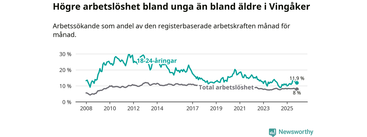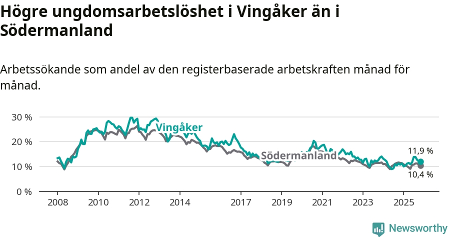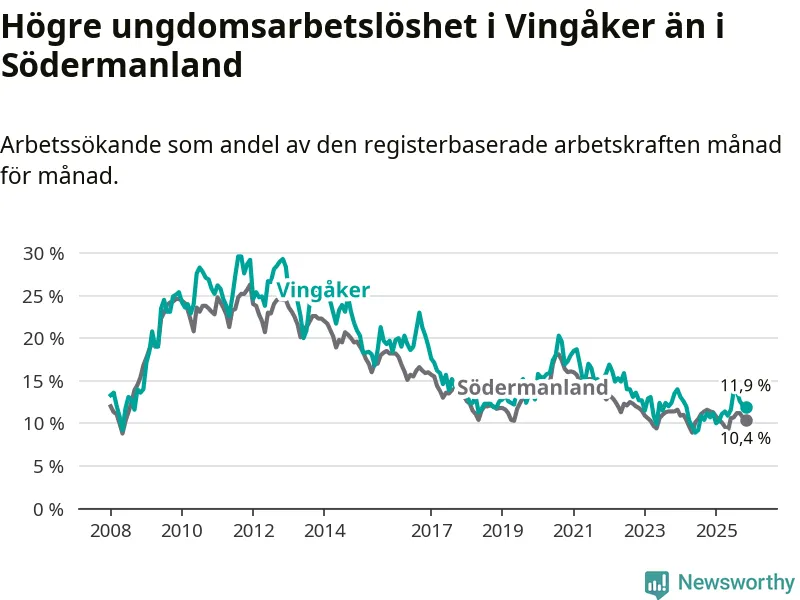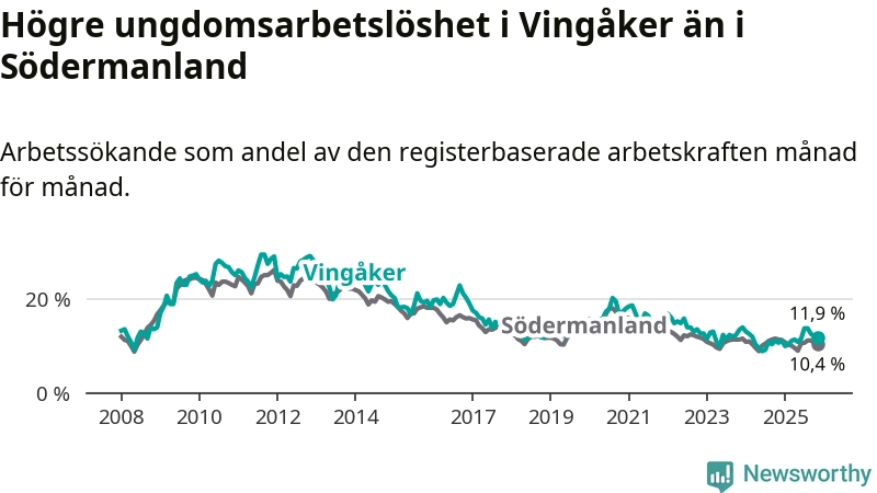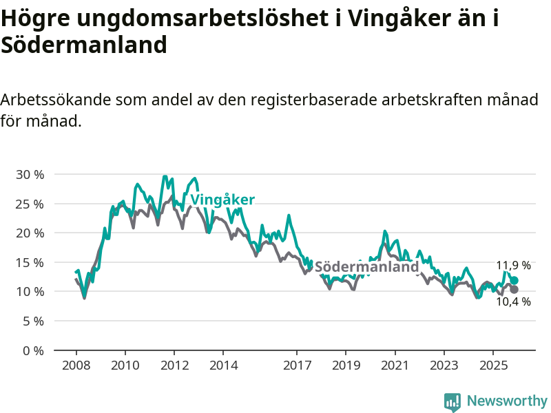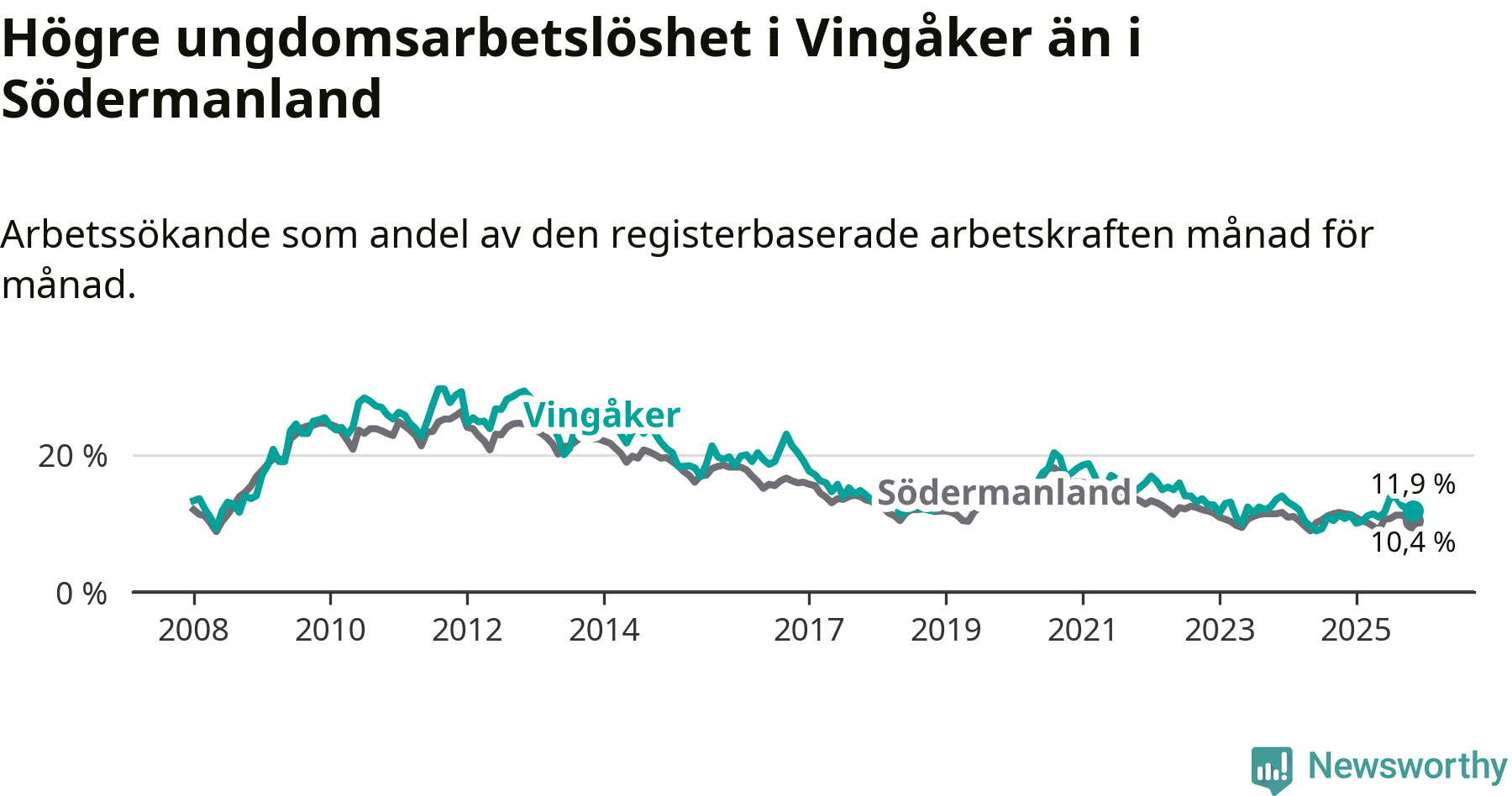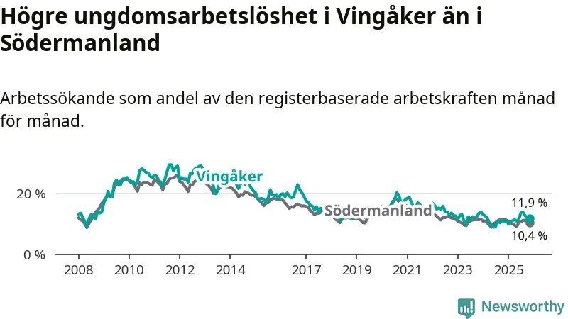 Medan Vingåker har lägre total arbetslöshet än Södermanland, ligger ungdomsarbetslösheten 1,5 procentenheter högre i Vingåker.