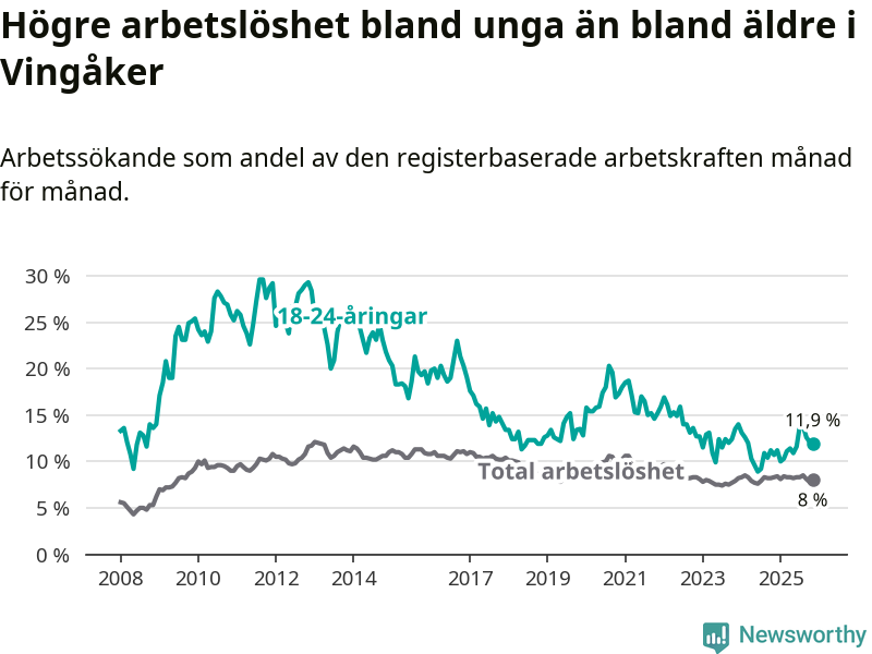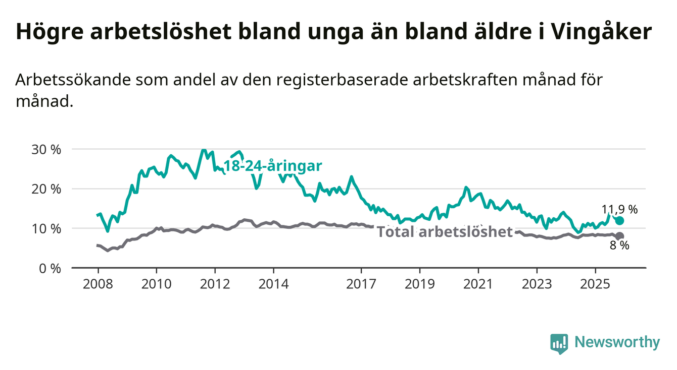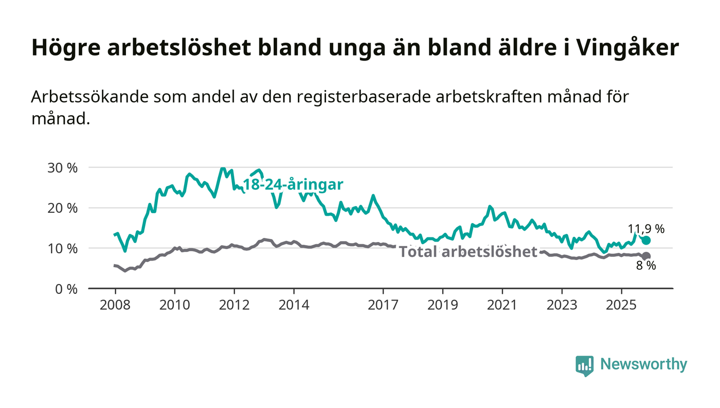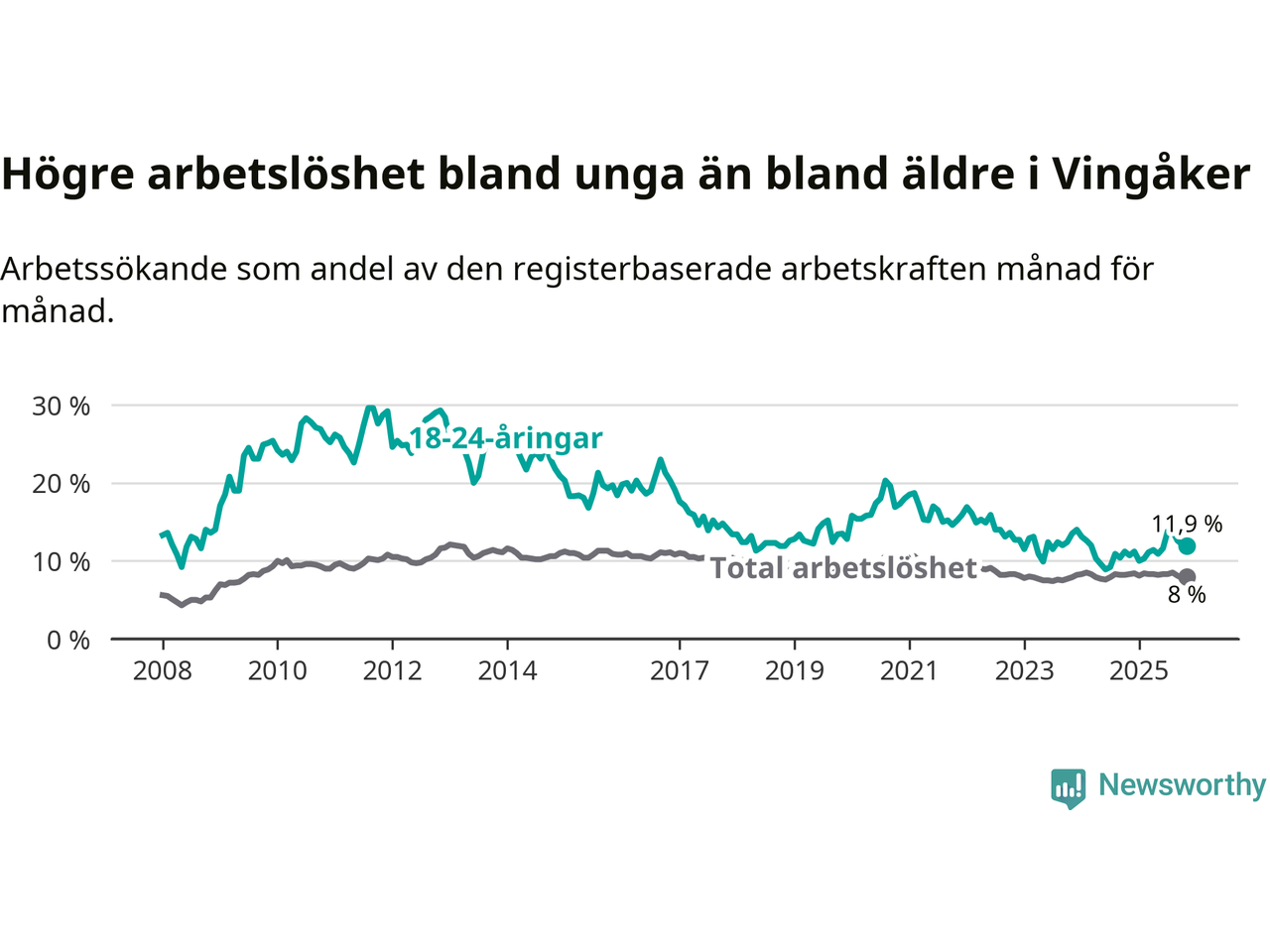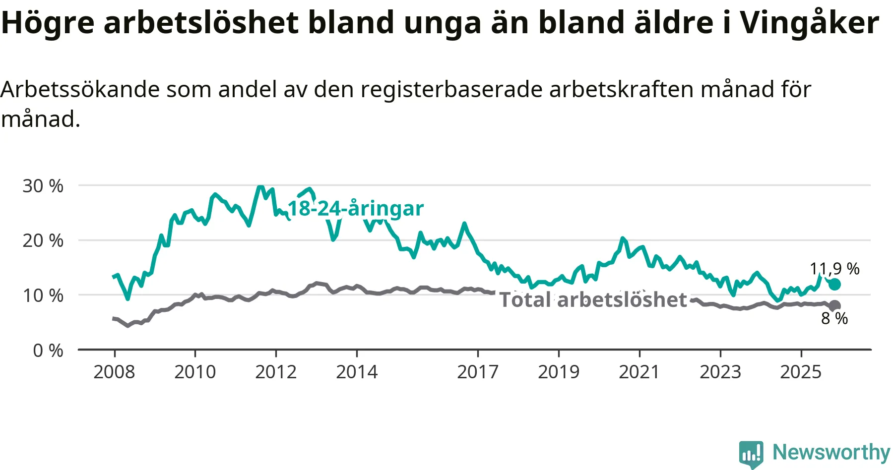 I och med den senaste månadens uppgång har de ungas arbetslöshet i Vingåker stigit åtta månader i följd (upp från 11,1 procent i mars till 11,9 procent nu).