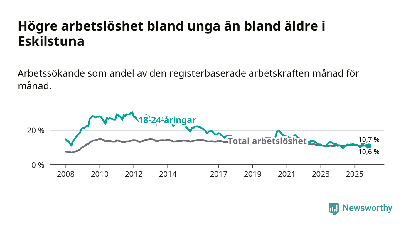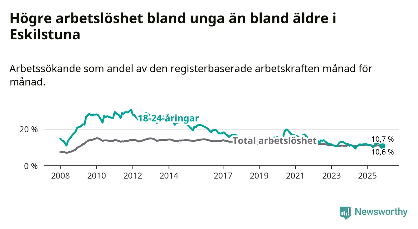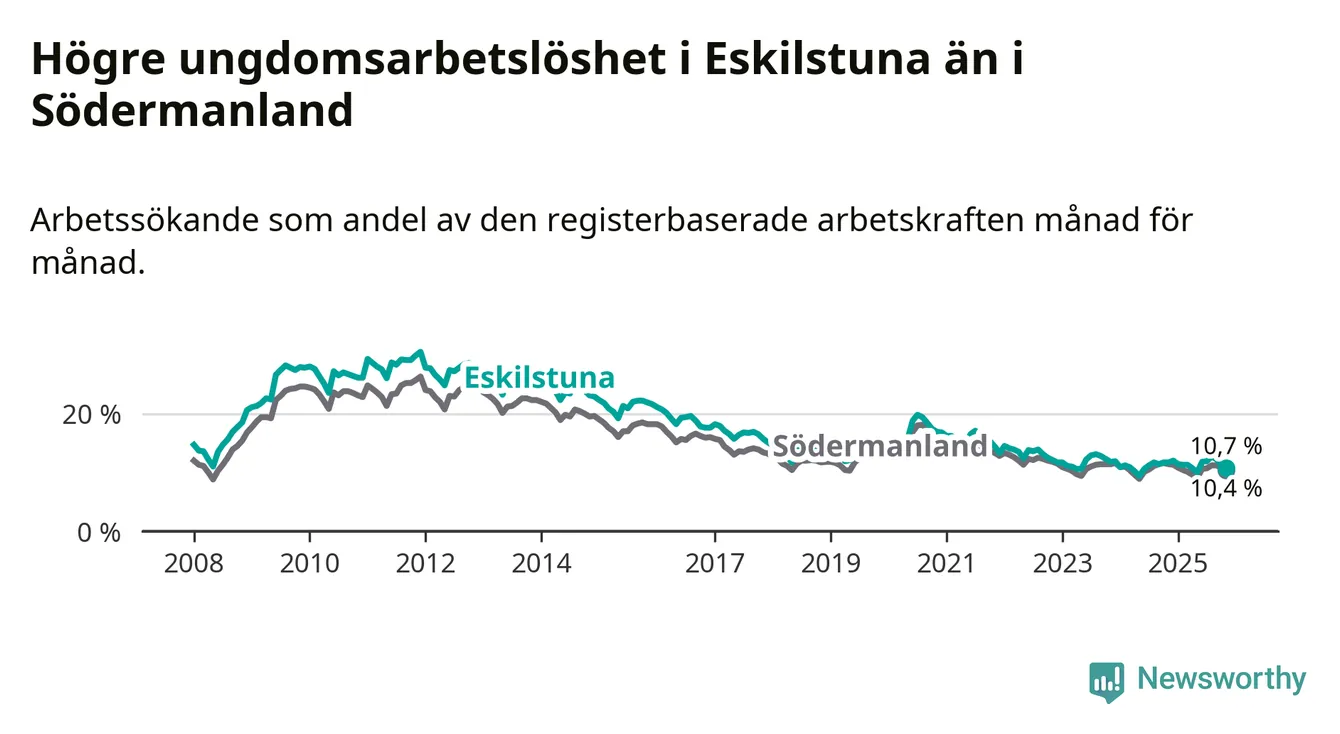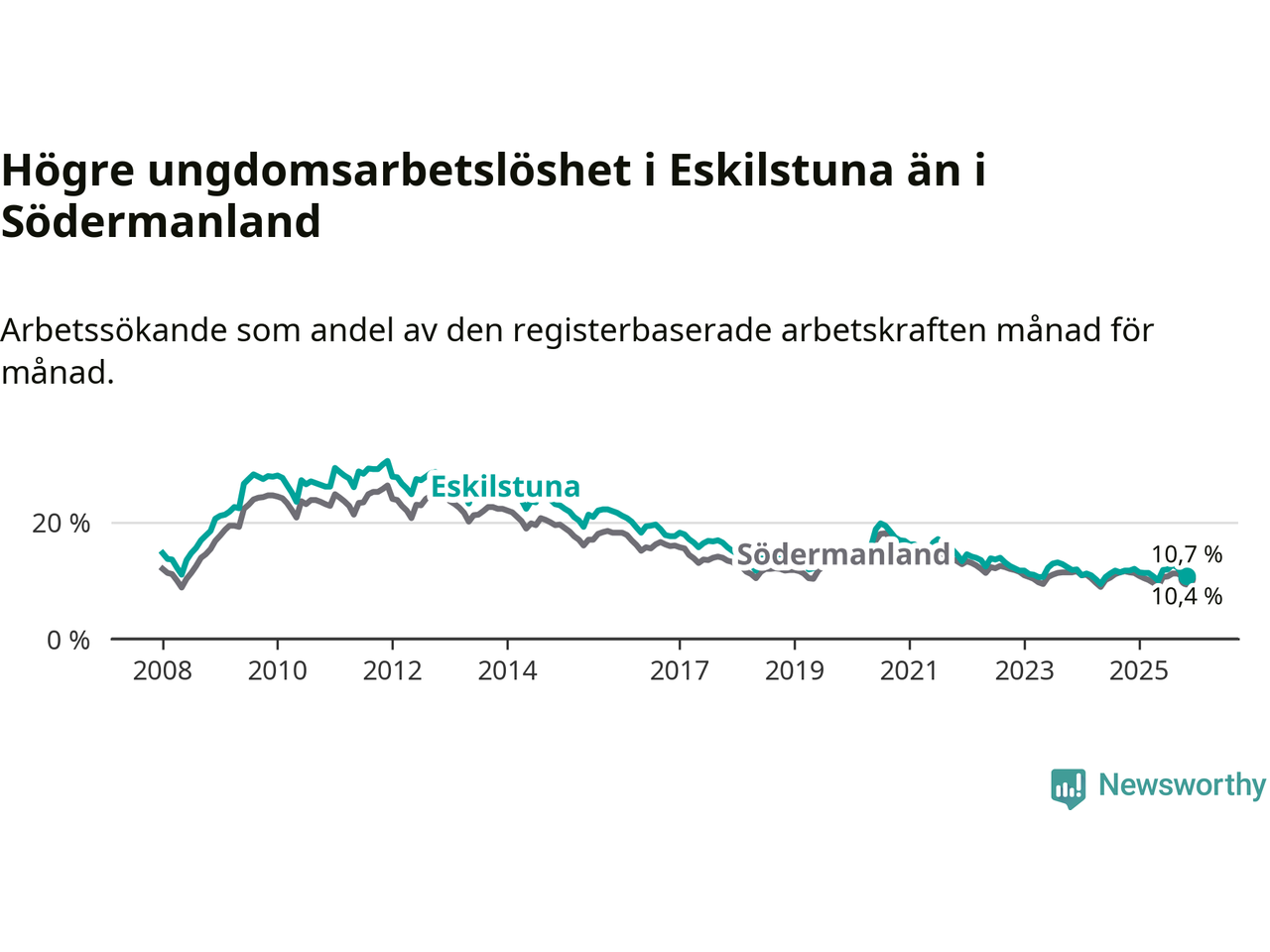 Precis som den totala arbetslösheten ligger ungdomsarbetslösheten i Eskilstuna högre än i Södermanland som helhet. Skillnaden mellan kommunen och länet är 0,3 procentenheter.