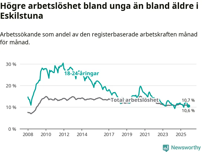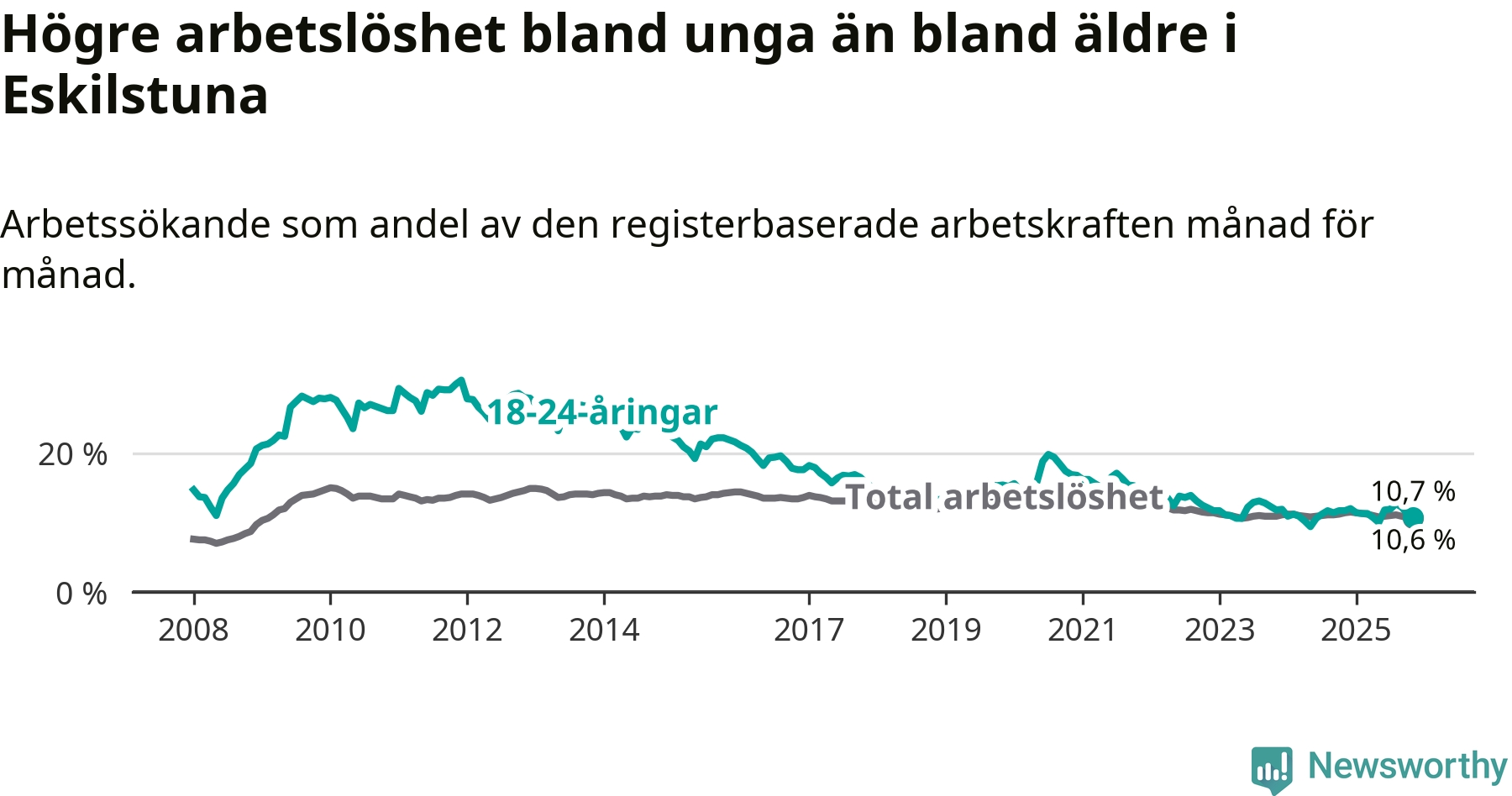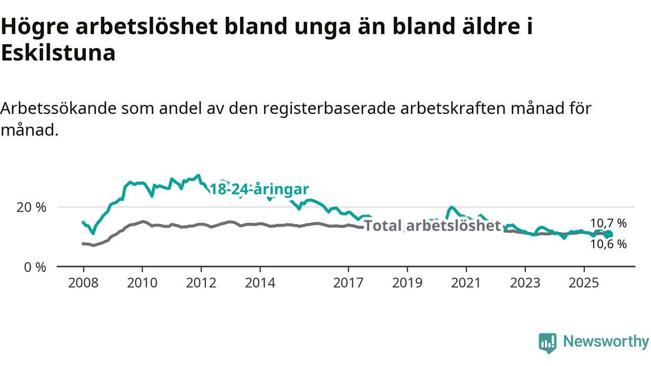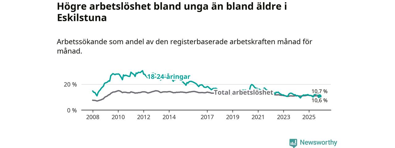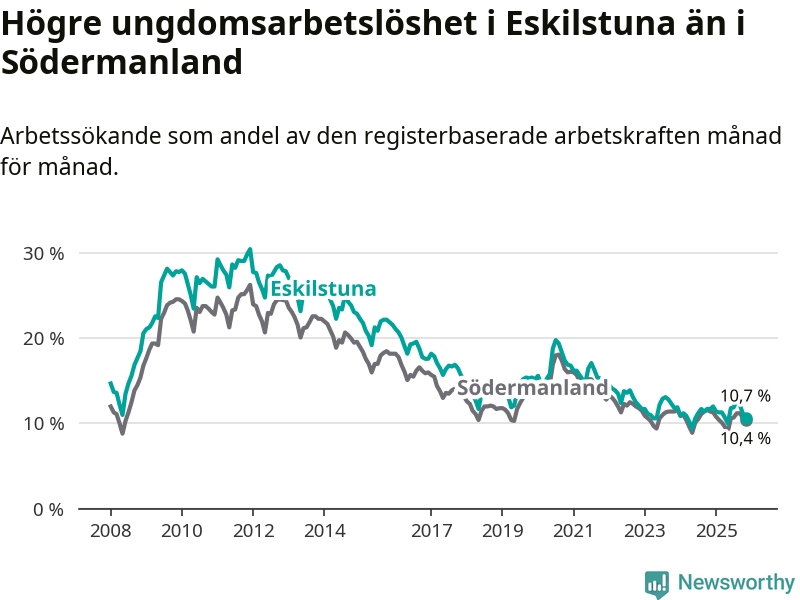 Precis som den totala arbetslösheten ligger ungdomsarbetslösheten i Eskilstuna högre än i Södermanland som helhet. Skillnaden mellan kommunen och länet är 0,3 procentenheter.