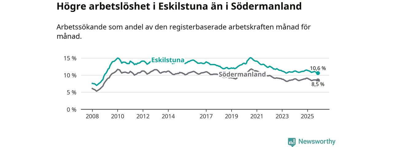 Under november månad rapporterade Eskilstuna kommun en total arbetslöshet på 10,6 procent. Det är en minskning jämfört med samma tidpunkt i fjol (−0,8 procentenheter). Även i Södermanlands län sjunker arbetslösheten .