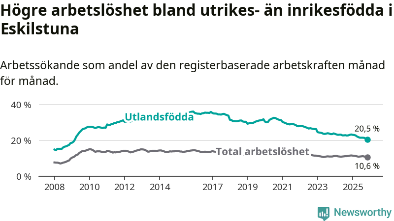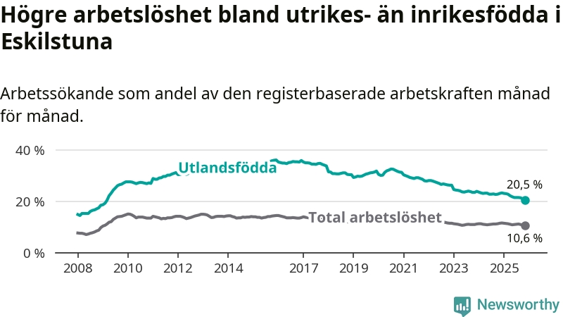 Skillnaden i arbetslöshet mellan utrikesfödda och hela befolkningen är 9,9 procentenheter i Eskilstuna. Det är en betydligt mindre skillnad än för ett år sedan (−1,7 procentenheter).