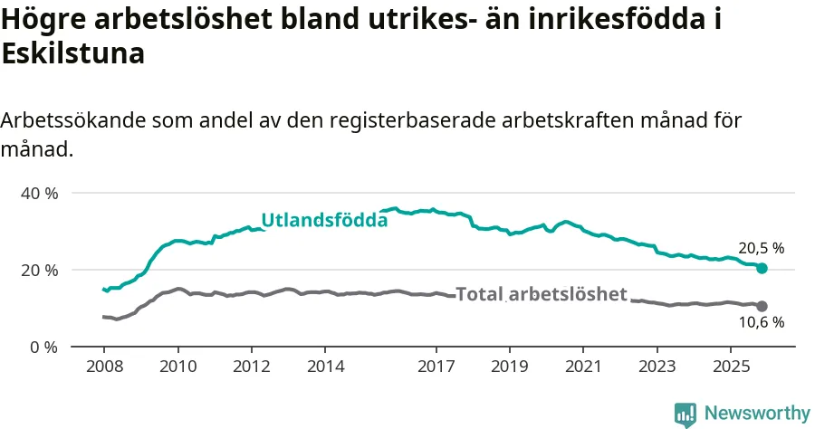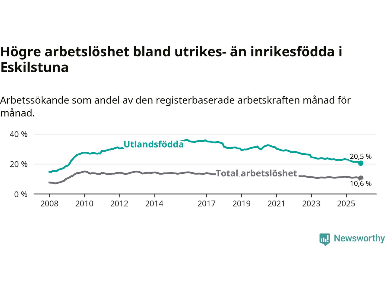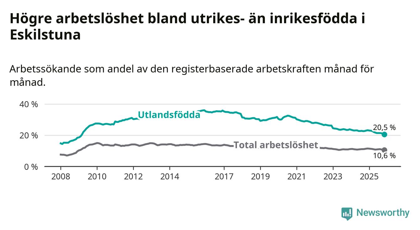 Arbetslösheten bland utlandsfödda var 20,5 procent i Eskilstuna under november månad, motsvarande 3 508 av 17 112 personer. Det är 2,5 procentenheter färre än vid samma tidpunkt i fjol (−430 om man räknar personer). Därmed har de utlandsföddas arbetslöshet varit lägre än vid samma tidpunkt i fjol i över fem år i sträck. Sedan november 2020 har arbetslösheten bland utlandsfödda minskat från 31,3 till 20,5 procent. Den nuvarande arbetslöshetsnivån är den lägsta sedan mars 2009.