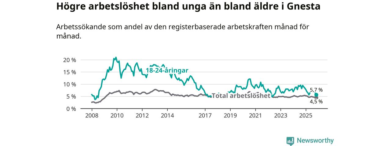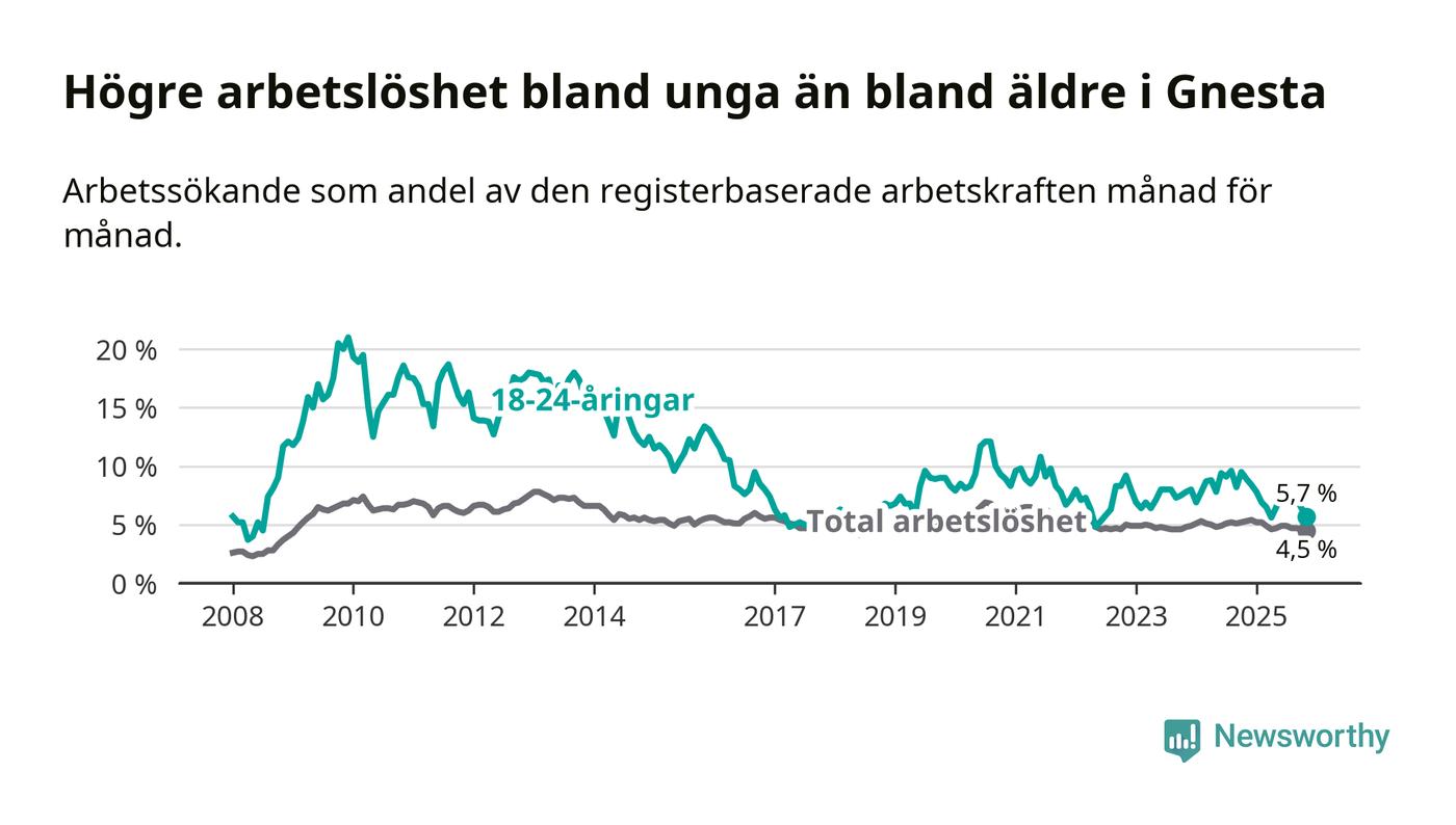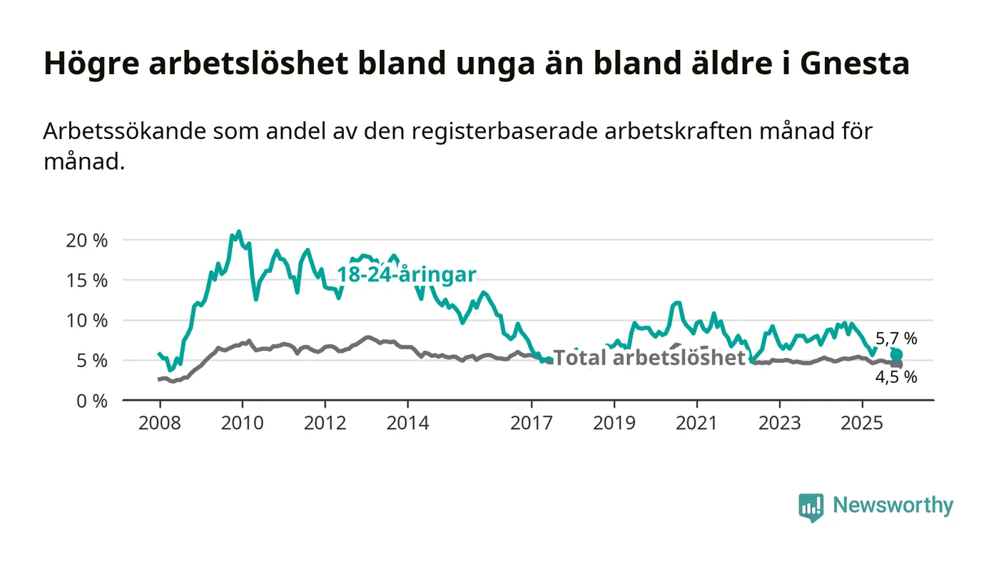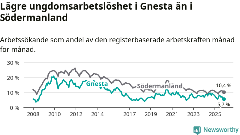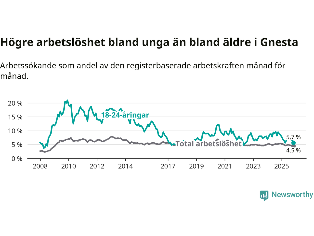 I och med den senaste månadens nedgång har de ungas arbetslöshet i Gnesta sjunkit tio månader i följd (ner från 7,8 procent i januari till 5,7 procent nu).