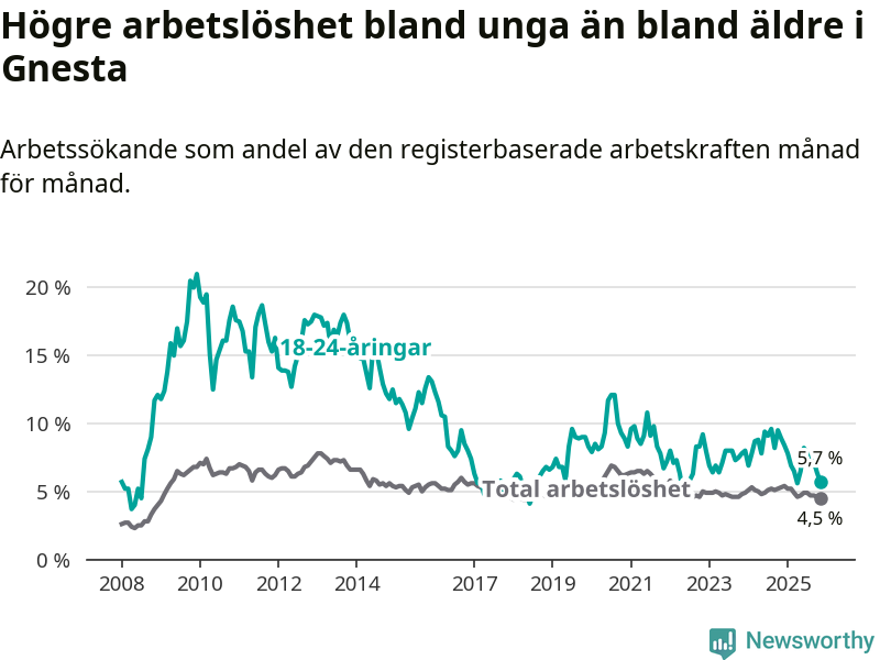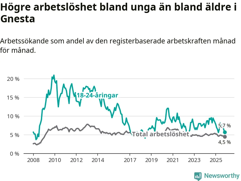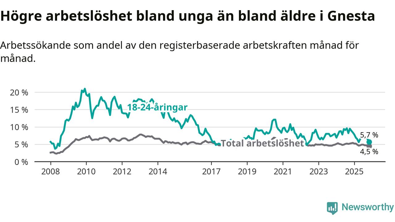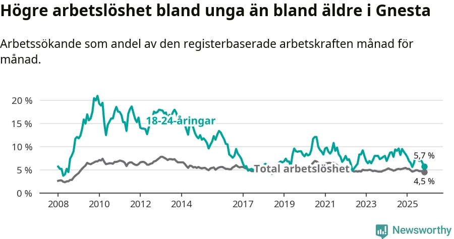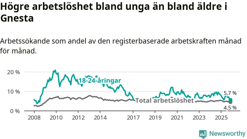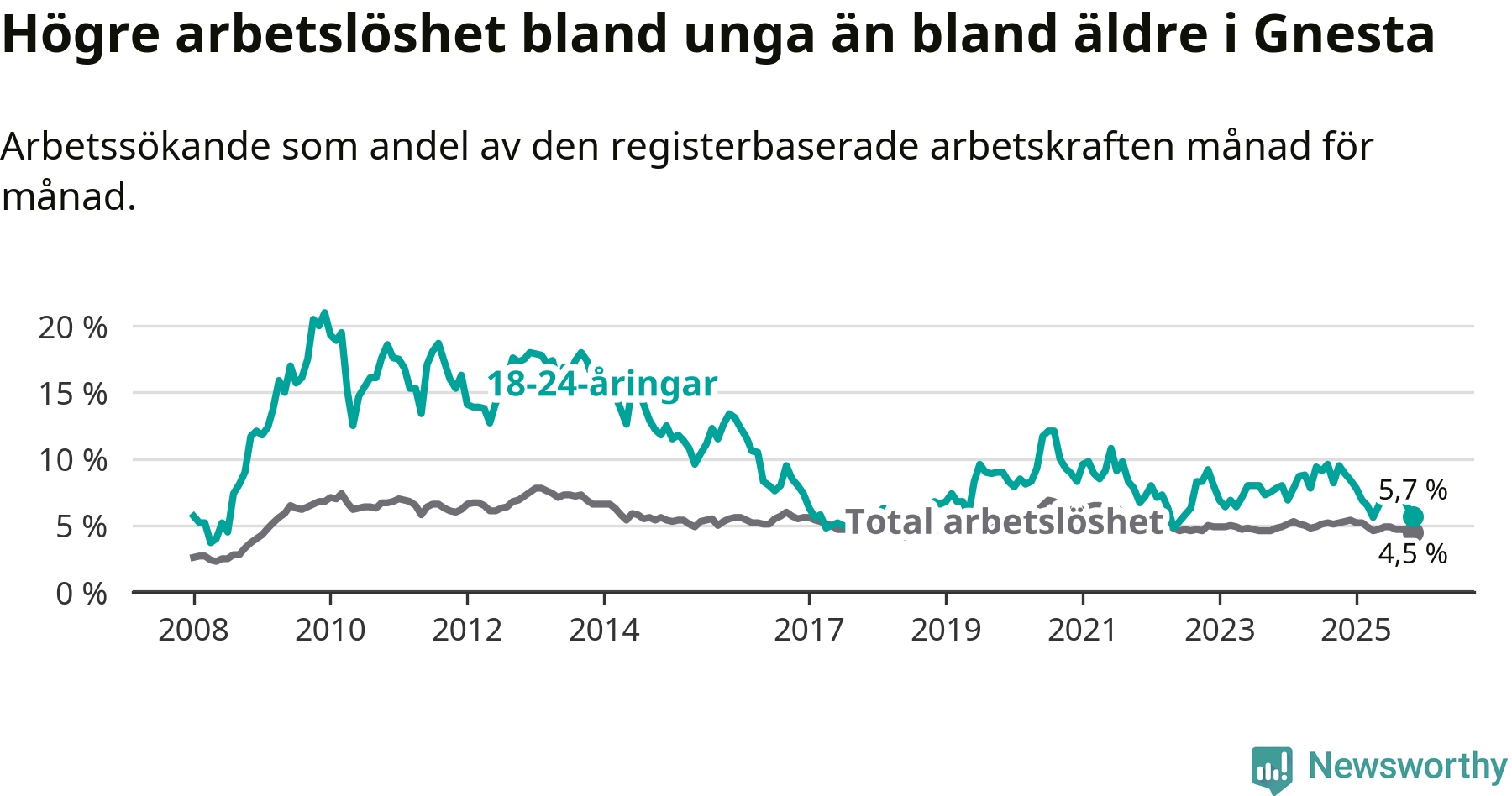 I och med den senaste månadens nedgång har de ungas arbetslöshet i Gnesta sjunkit tio månader i följd (ner från 7,8 procent i januari till 5,7 procent nu).