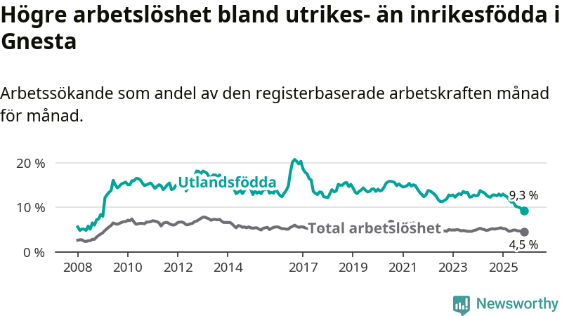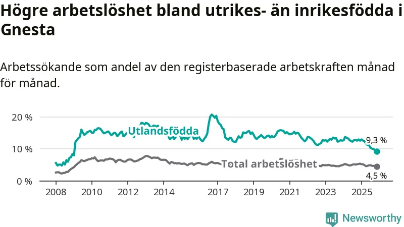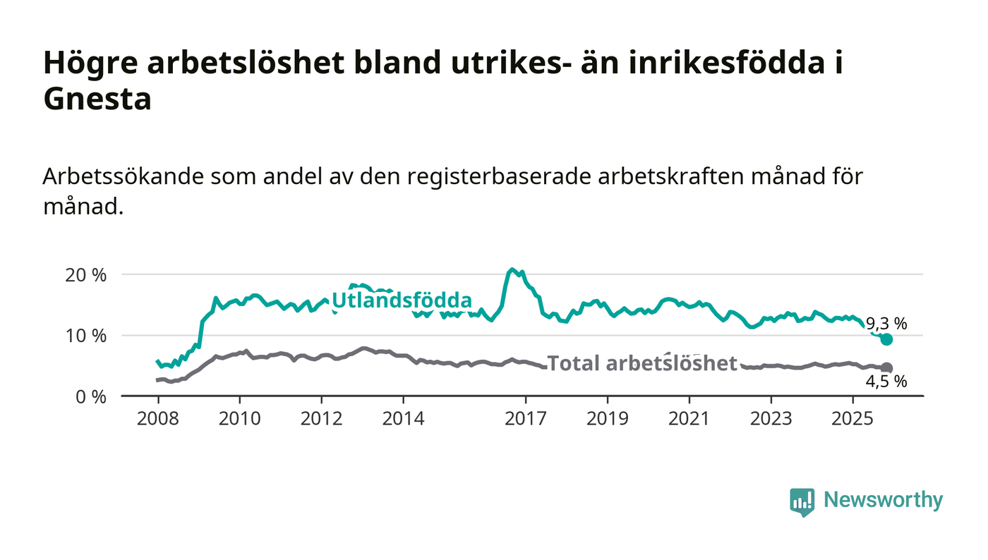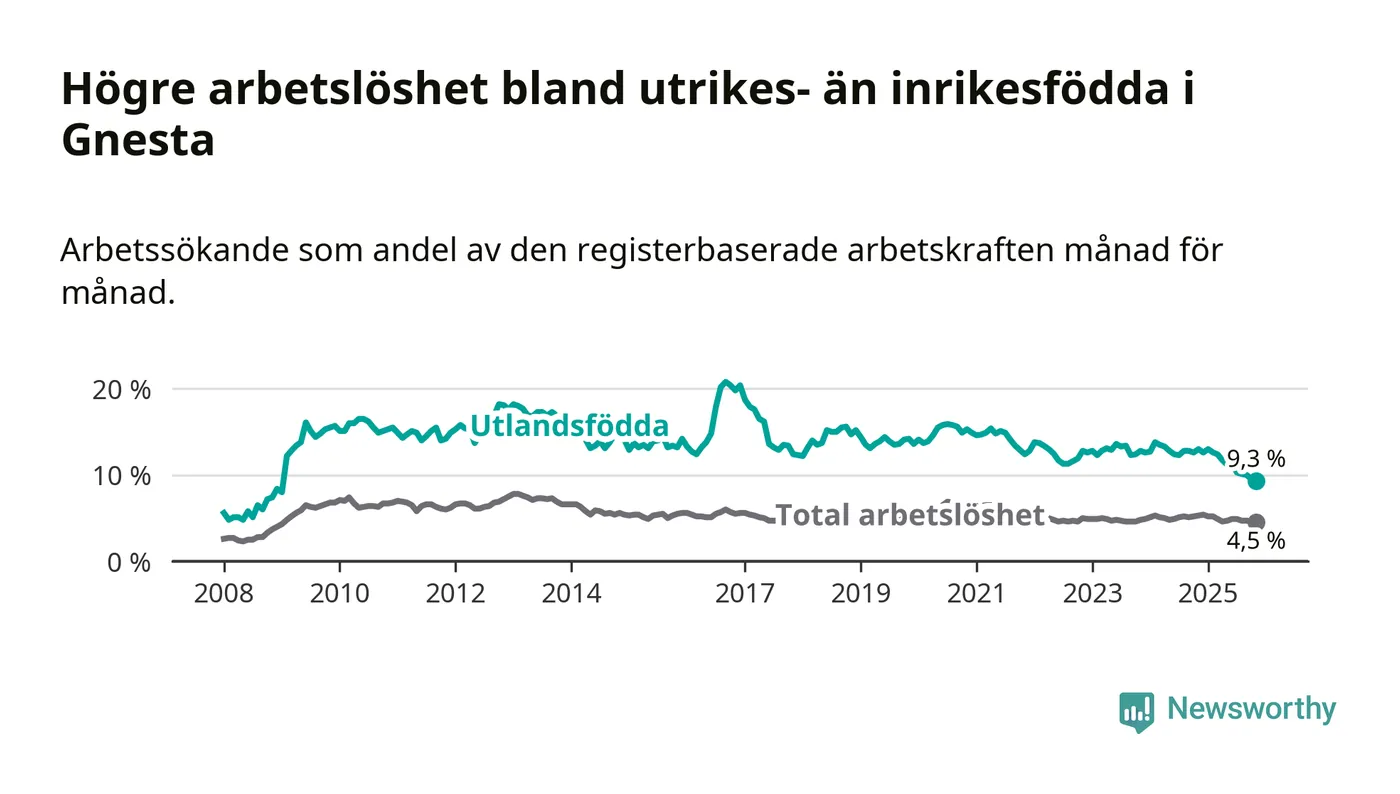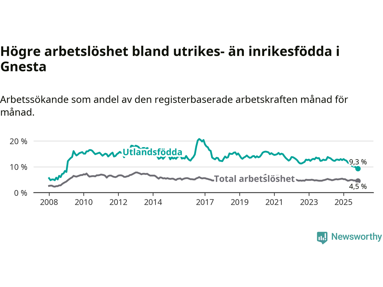 Skillnaden i arbetslöshet mellan utrikesfödda och hela befolkningen är 4,8 procentenheter i Gnesta. Det är en betydligt mindre skillnad än för ett år sedan (−2,9 procentenheter).