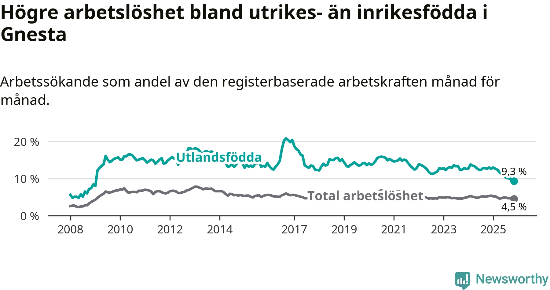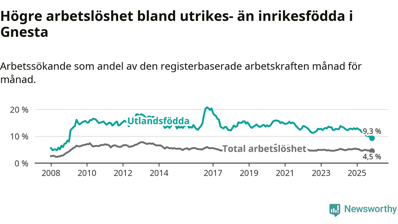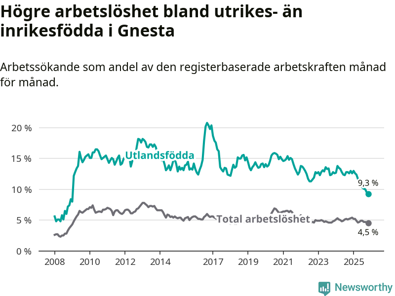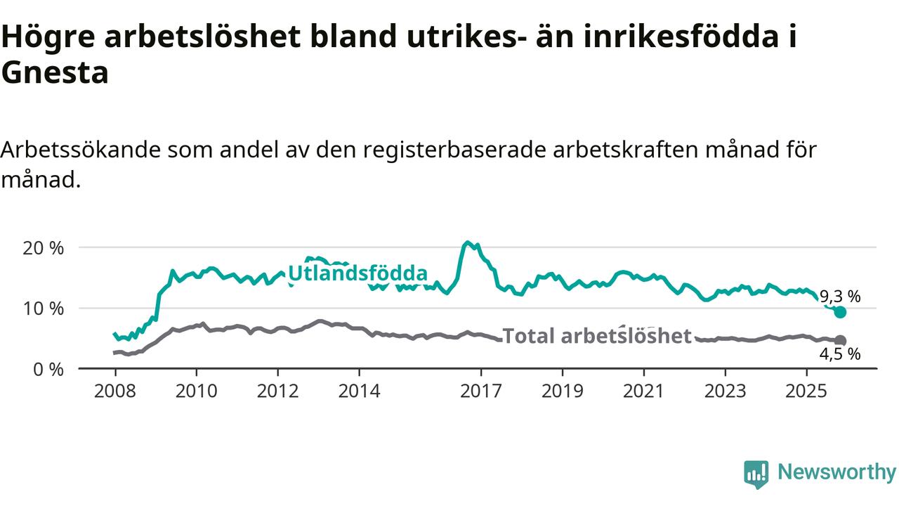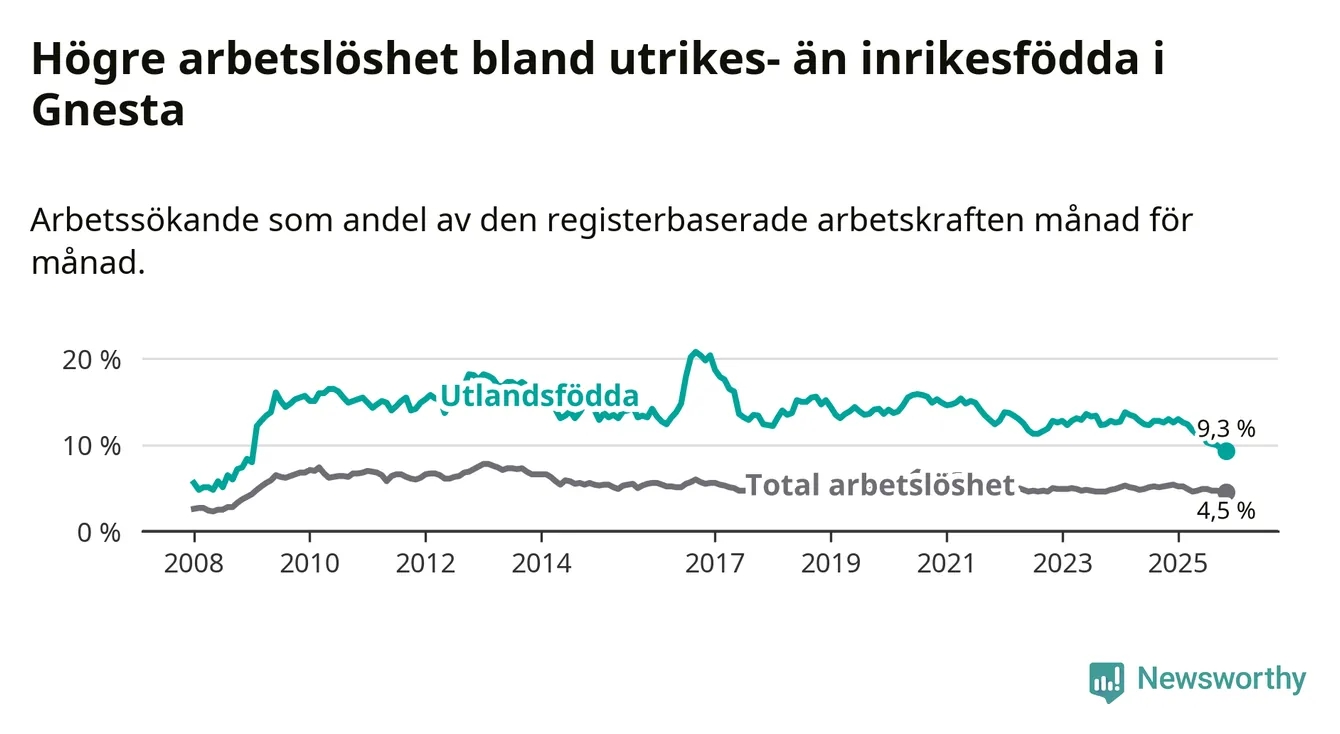 Skillnaden i arbetslöshet mellan utrikesfödda och hela befolkningen är 4,8 procentenheter i Gnesta. Det är en betydligt mindre skillnad än för ett år sedan (−2,9 procentenheter).