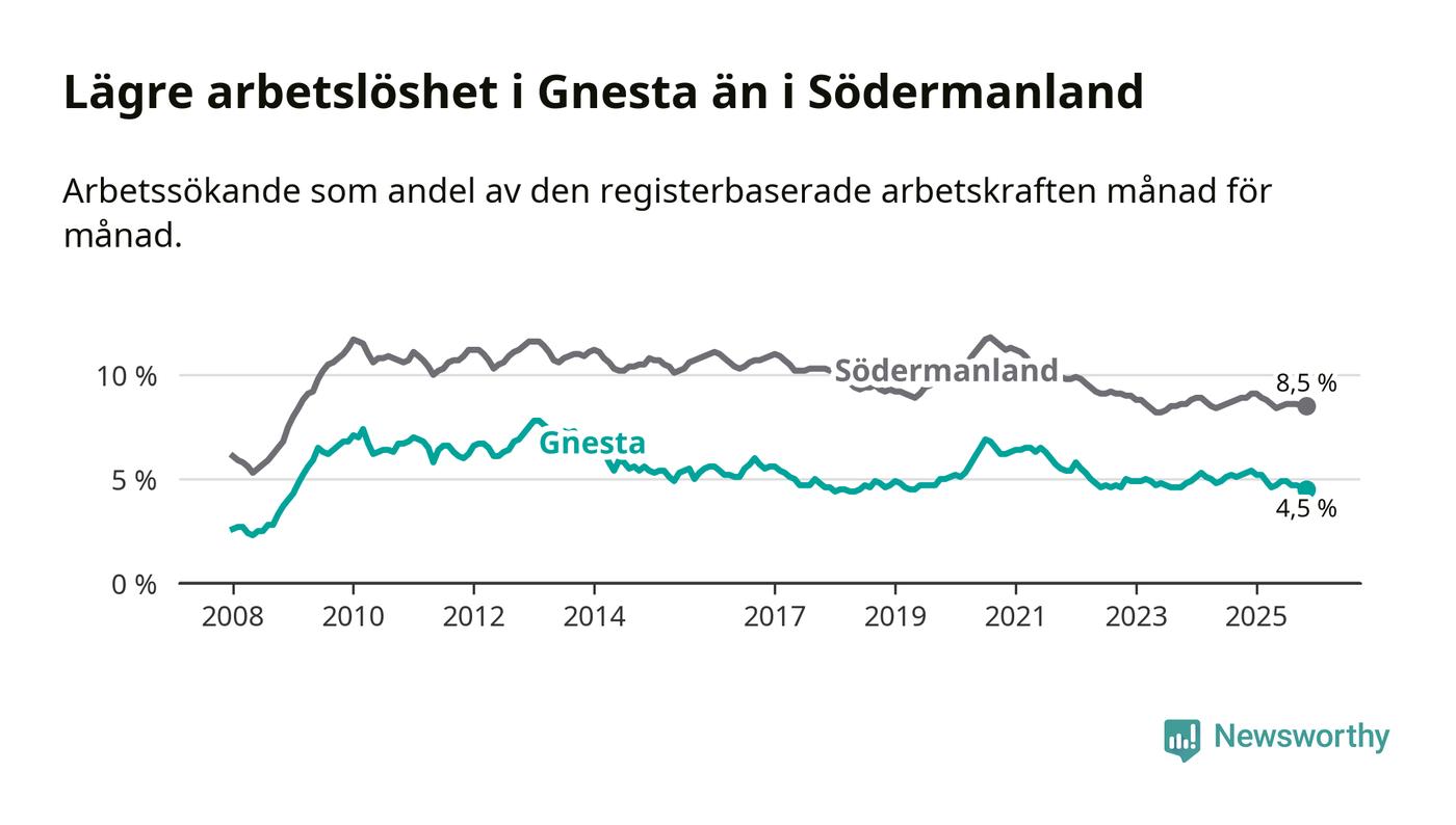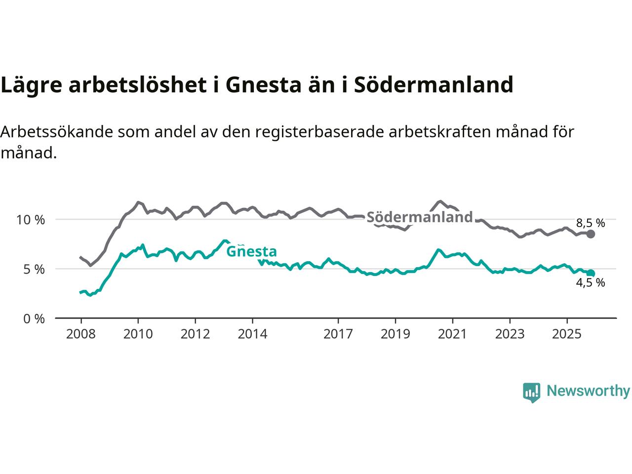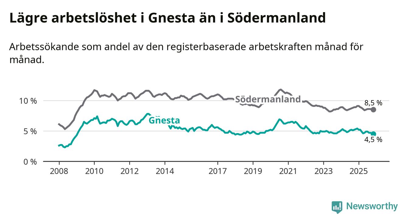 Under november månad rapporterade Gnesta kommun en total arbetslöshet på 4,5 procent. Det är en minskning jämfört med samma tidpunkt i fjol (−0,8 procentenheter). Även i Södermanlands län sjunker arbetslösheten .