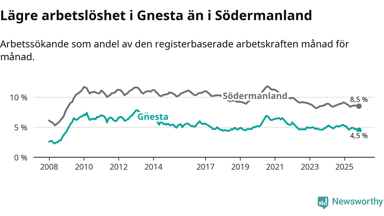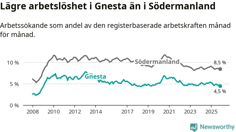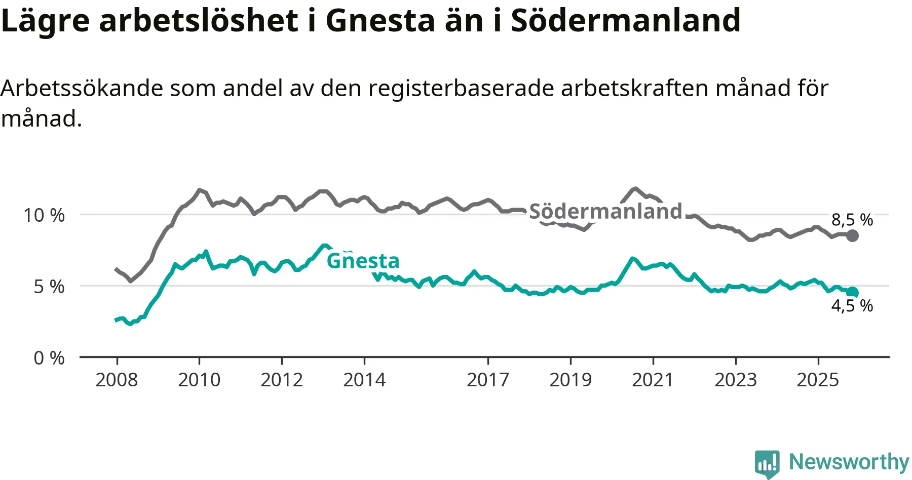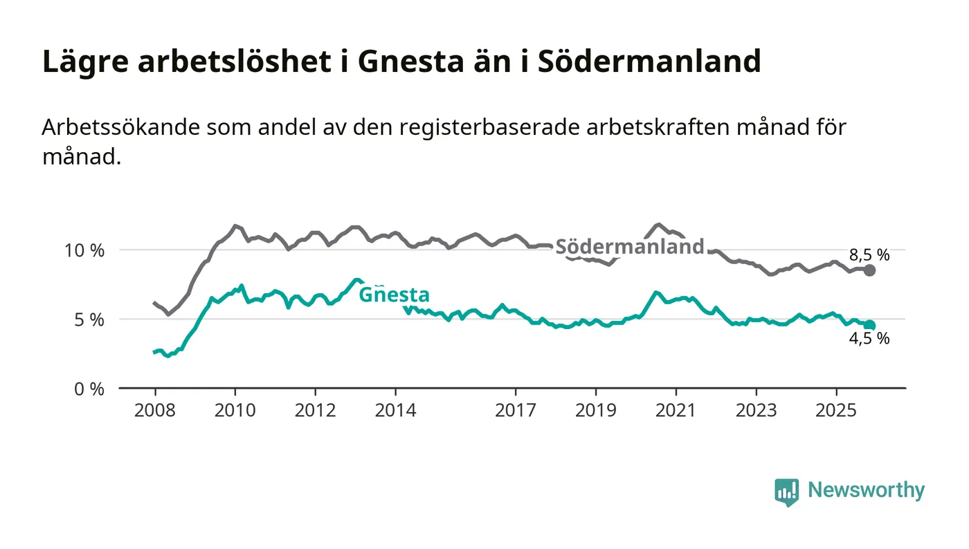 Under november månad rapporterade Gnesta kommun en total arbetslöshet på 4,5 procent. Det är en minskning jämfört med samma tidpunkt i fjol (−0,8 procentenheter). Även i Södermanlands län sjunker arbetslösheten .