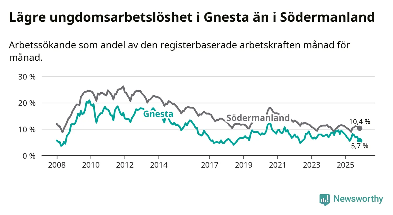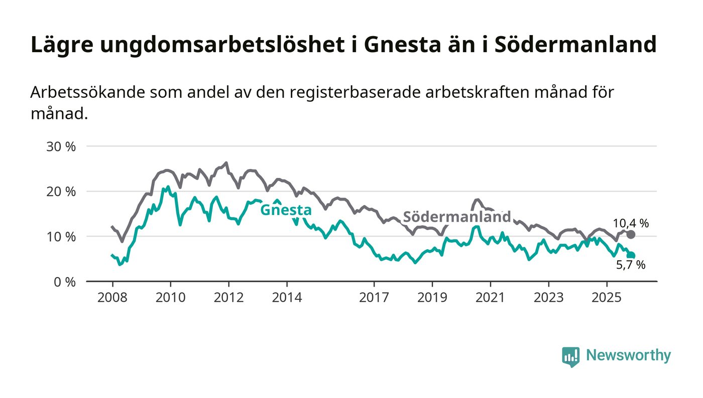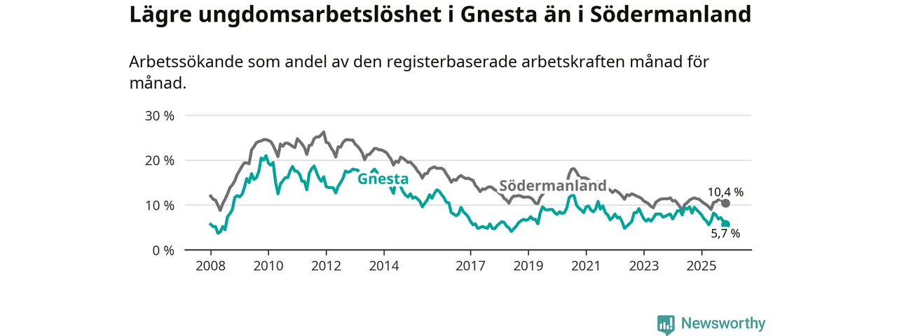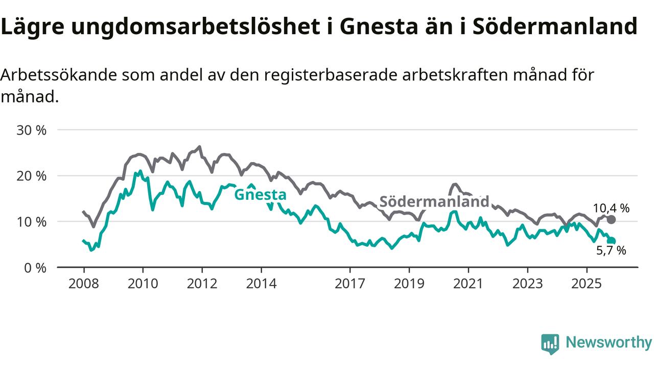 Precis som den totala arbetslösheten ligger ungdomsarbetslösheten i Gnesta lägre än i Södermanland som helhet. Skillnaden mellan kommunen och länet är 4,7 procentenheter.