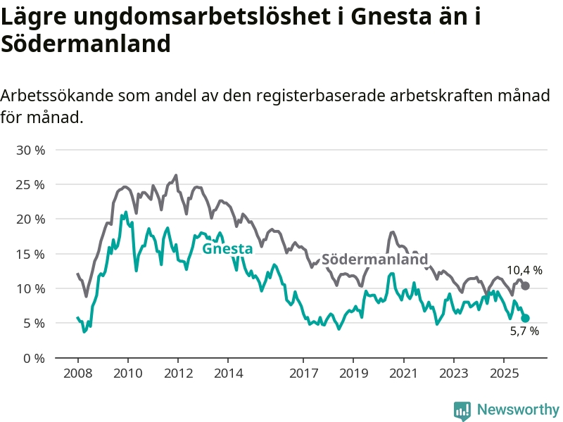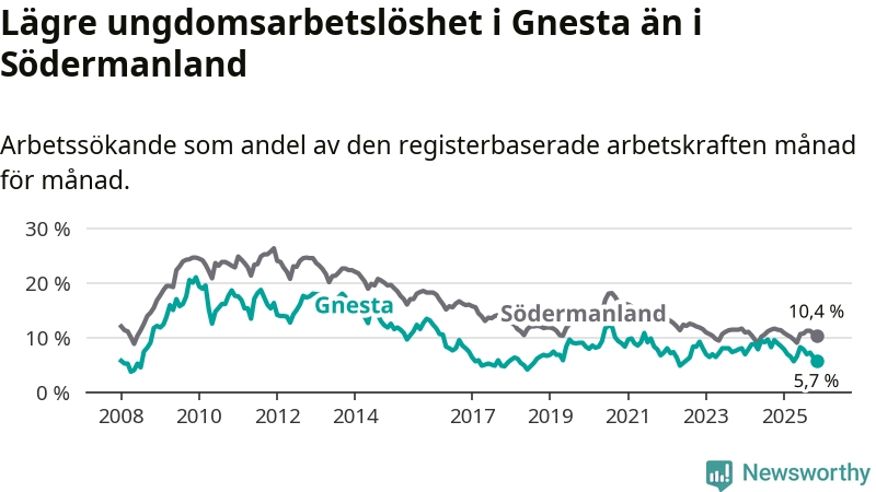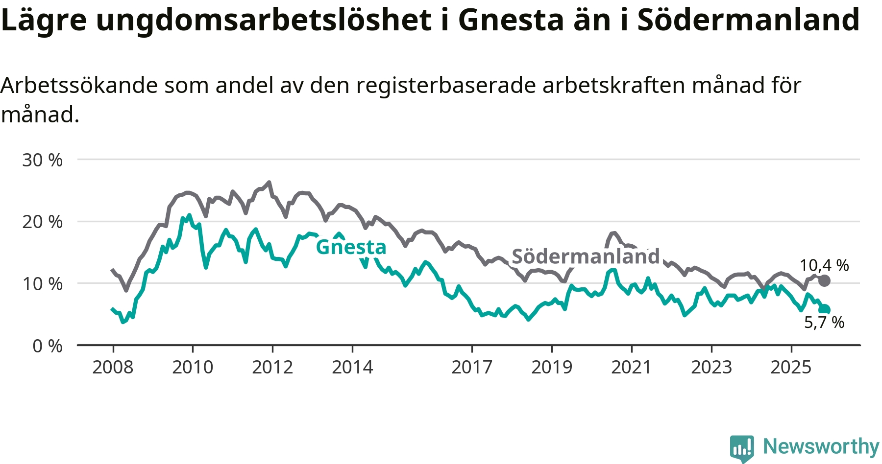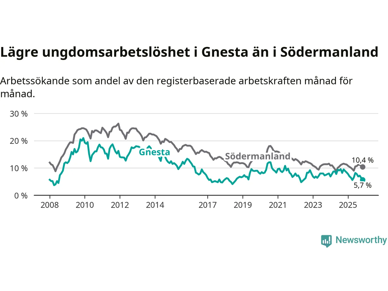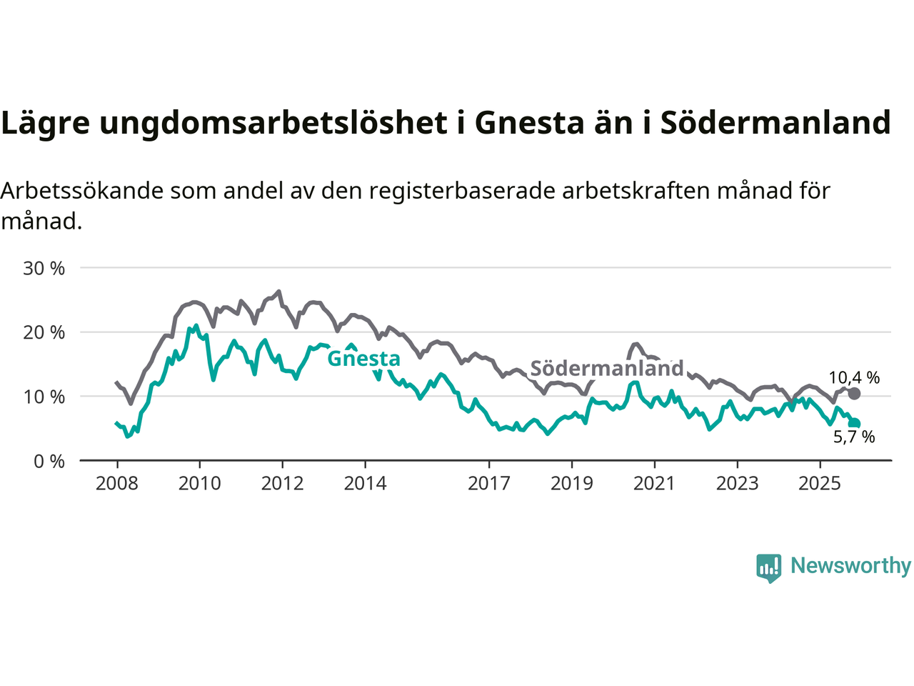 Precis som den totala arbetslösheten ligger ungdomsarbetslösheten i Gnesta lägre än i Södermanland som helhet. Skillnaden mellan kommunen och länet är 4,7 procentenheter.