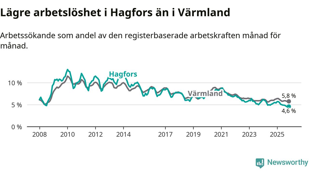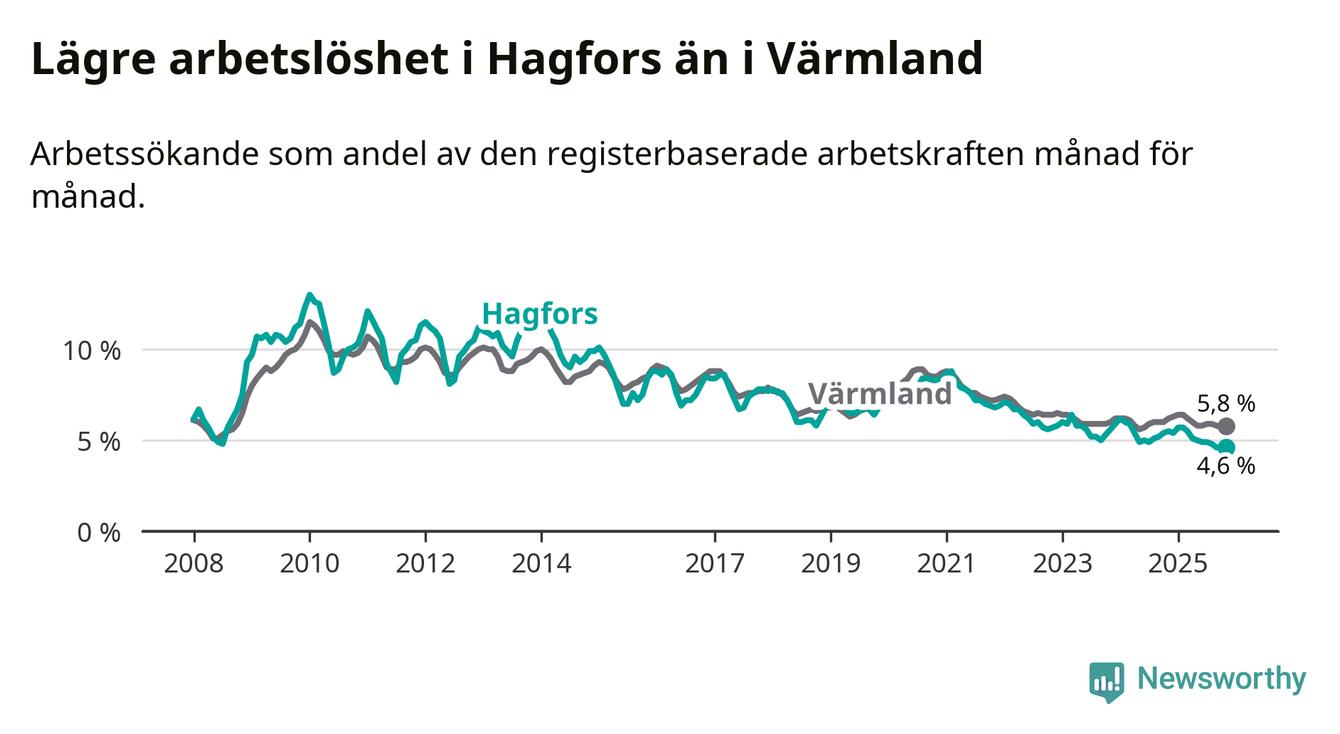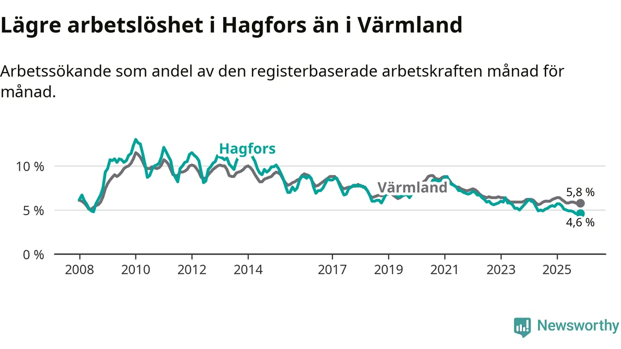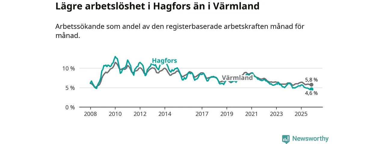 Under november månad rapporterade Hagfors kommun en total arbetslöshet på 4,6 procent. Det är en minskning jämfört med samma tidpunkt i fjol (−0,9 procentenheter). Även i Värmlands län sjunker arbetslösheten .