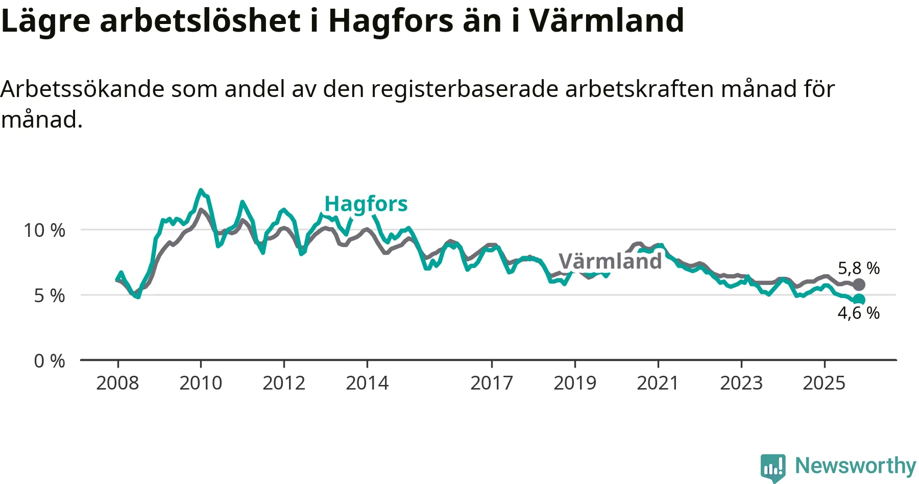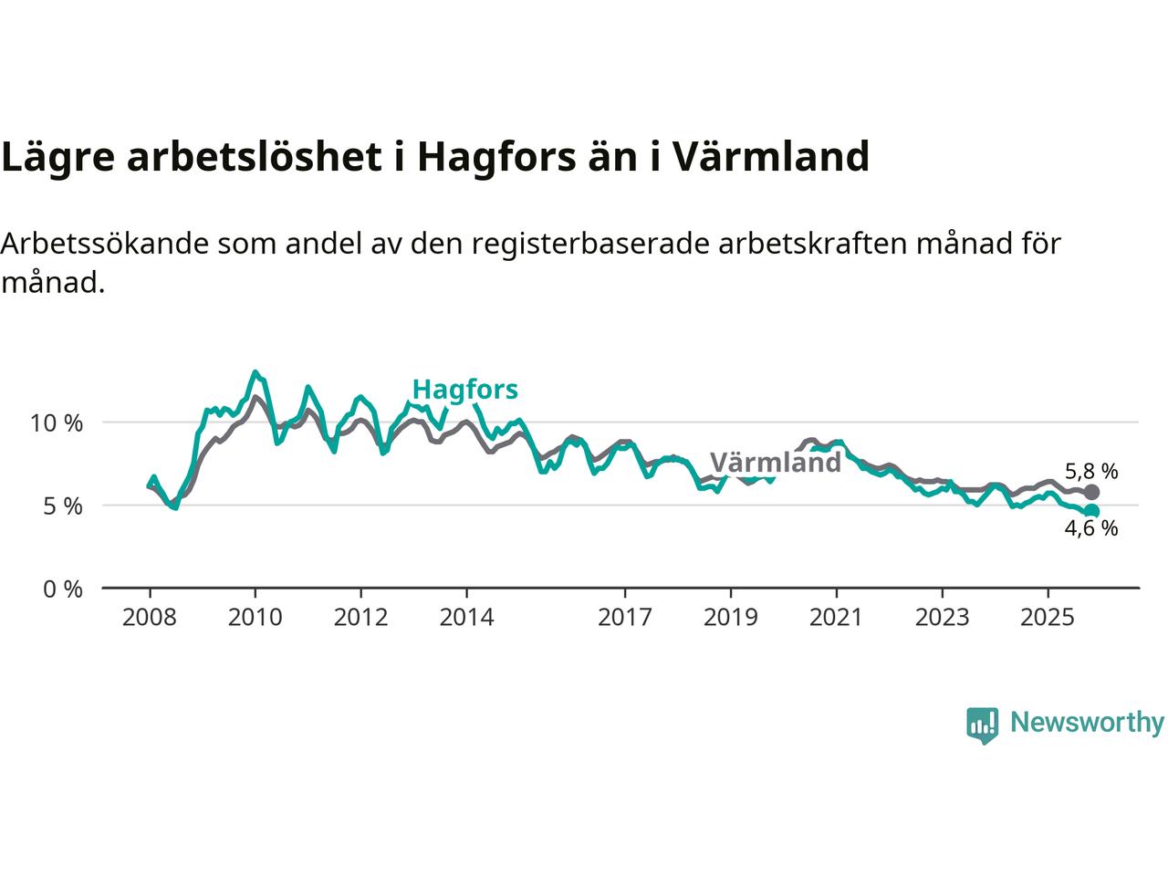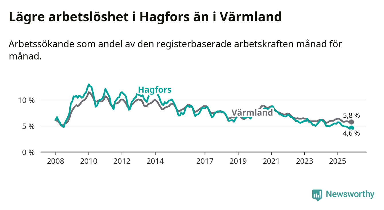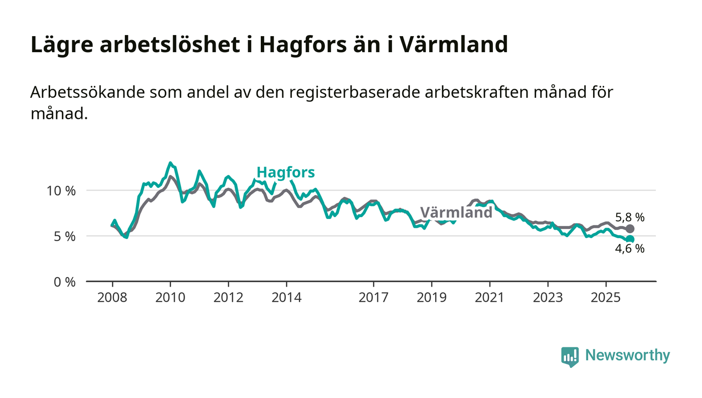 Hagfors hade redan tidigare lägre arbetslöshet än snittet i hela Värmlands län och nu växer klyftan (4,6 procent i kommunen, jämfört med 5,8 procent i hela länet). Torsby har den lägsta arbetslösheten i länet (3,5 procent), medan Filipstad har den högsta (8,5 procent). För att Hagfors skulle komma ner i samma arbetslöshetsnivå som Torsby skulle 53 personer behöva sysselsättas.