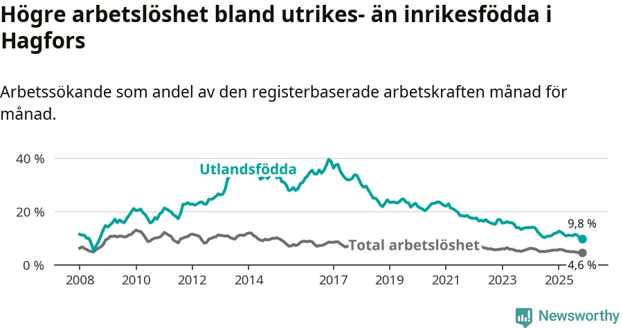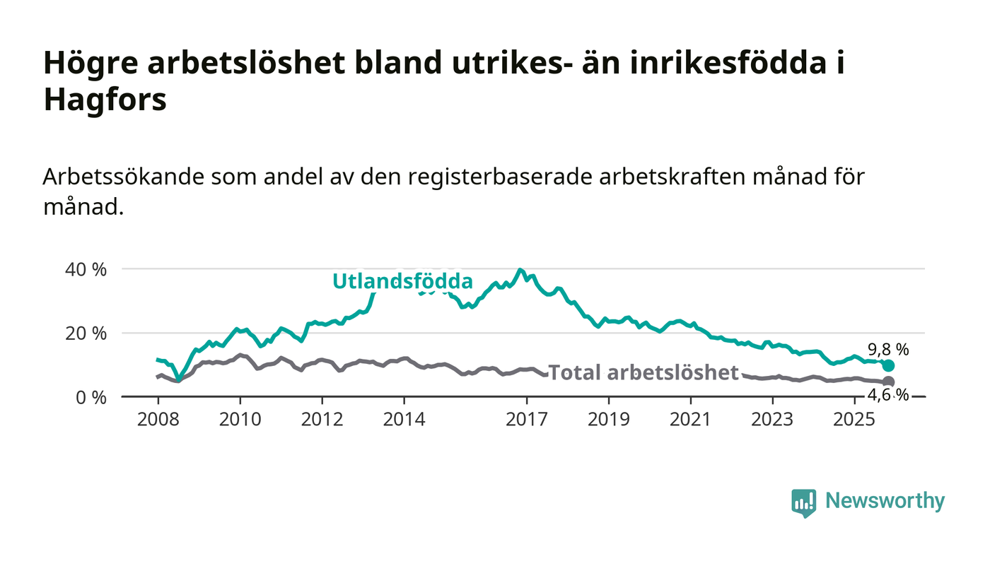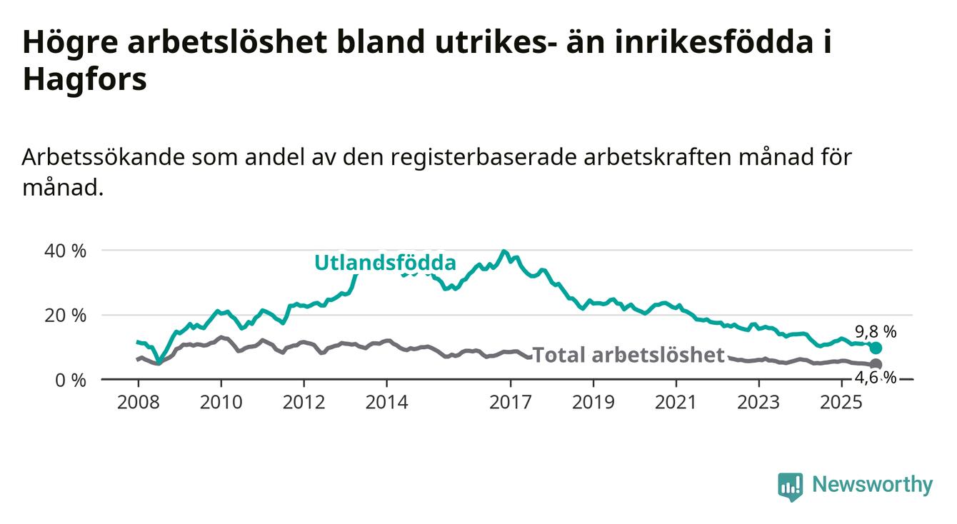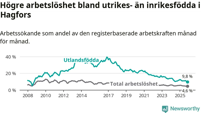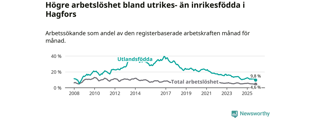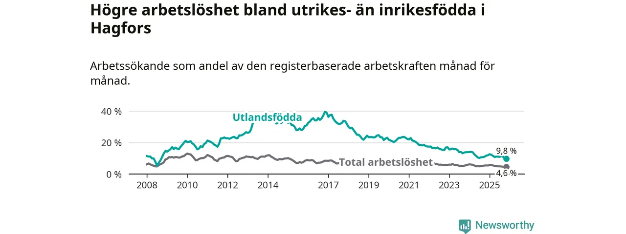 Skillnaden i arbetslöshet mellan utrikesfödda och hela befolkningen är 5,2 procentenheter i Hagfors. Det är en mindre skillnad än för ett år sedan (−1,0 procentenheter).