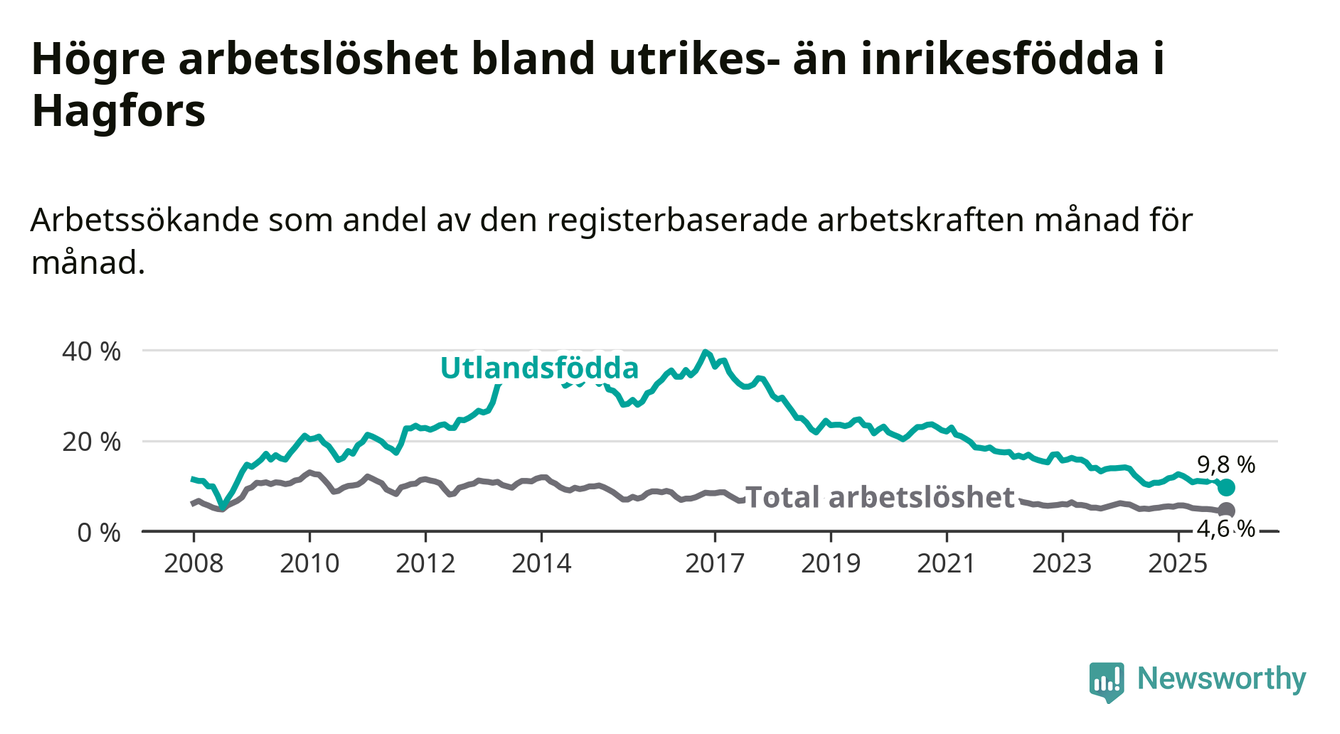 Den senaste månadsstatistiken från Arbetsförmedlingen visar på en nedgång i arbetslöshet bland utlandsfödda i Hagfors kommun med 1,9 procentenheter. Arbetslösheten bland invånare födda i ett annat land låg i november på 9,8 procent.