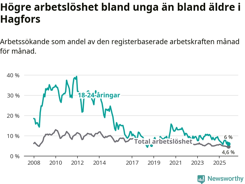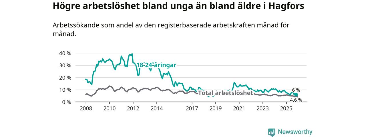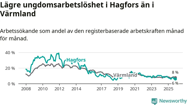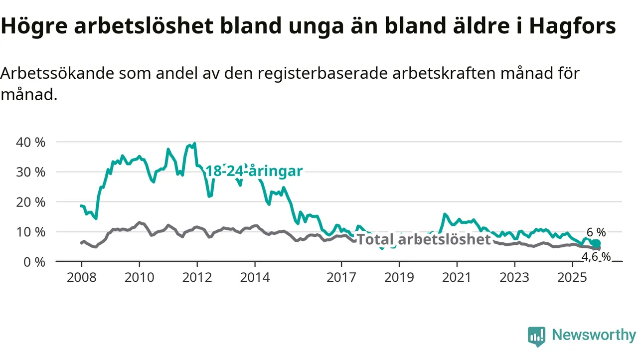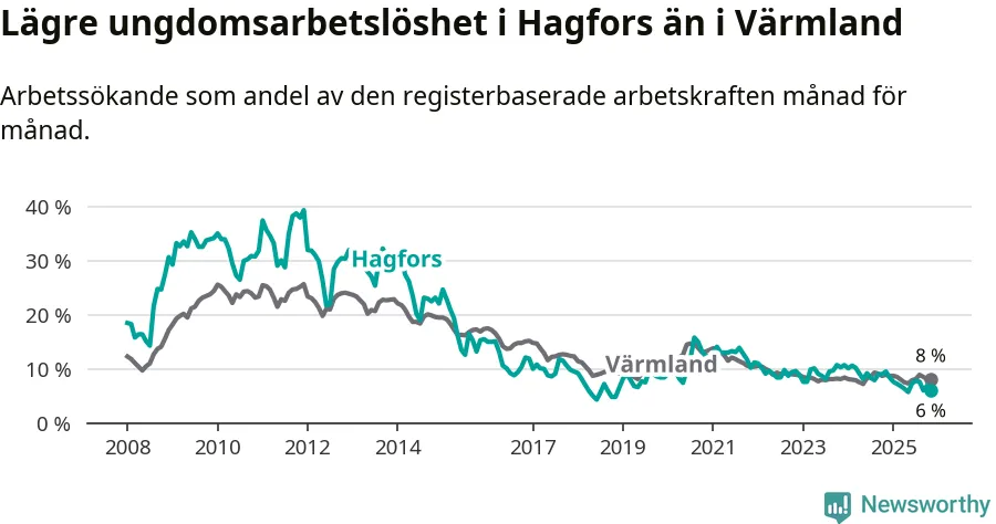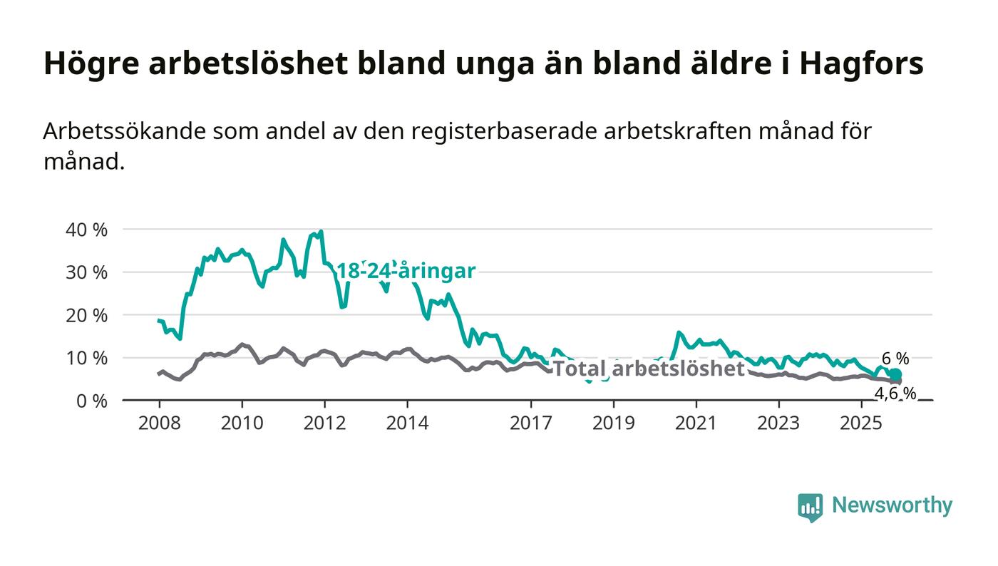 I och med den senaste månadens nedgång har de ungas arbetslöshet i Hagfors sjunkit 16 månader i följd (ner från 8,3 procent i juli 2024 till 6,0 procent nu).