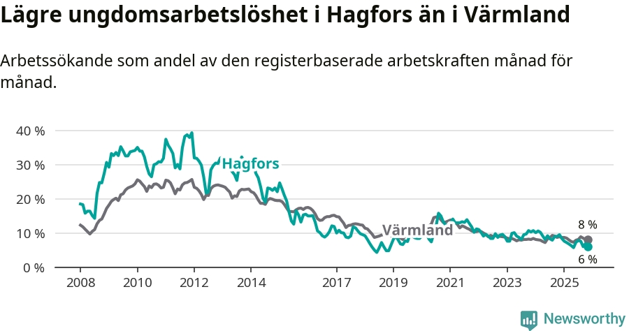 Precis som den totala arbetslösheten ligger ungdomsarbetslösheten i Hagfors lägre än i Värmland som helhet. Skillnaden mellan kommunen och länet är 2,0 procentenheter.